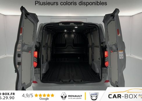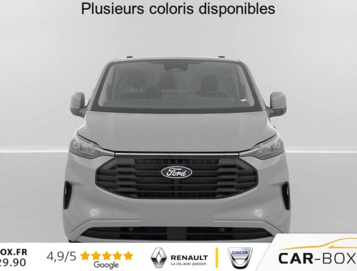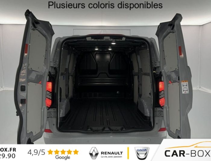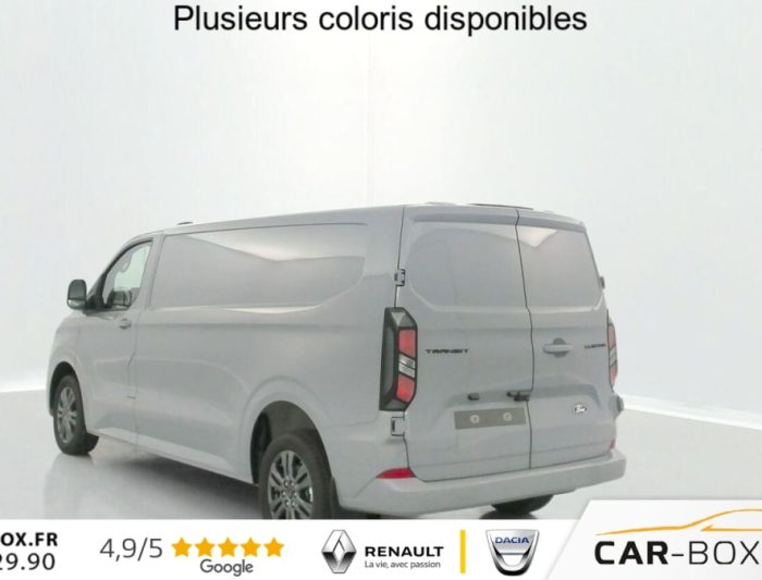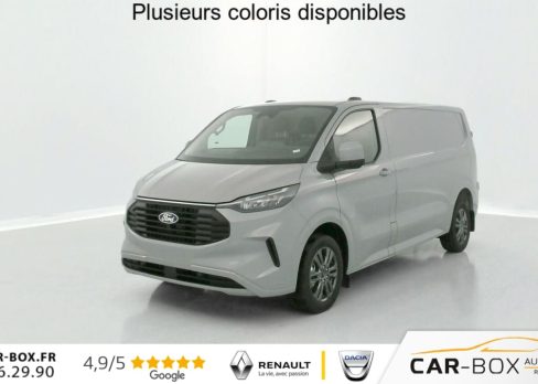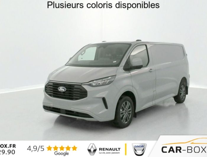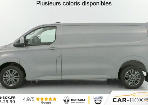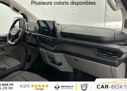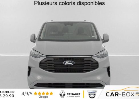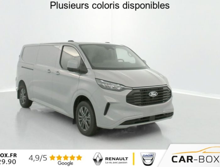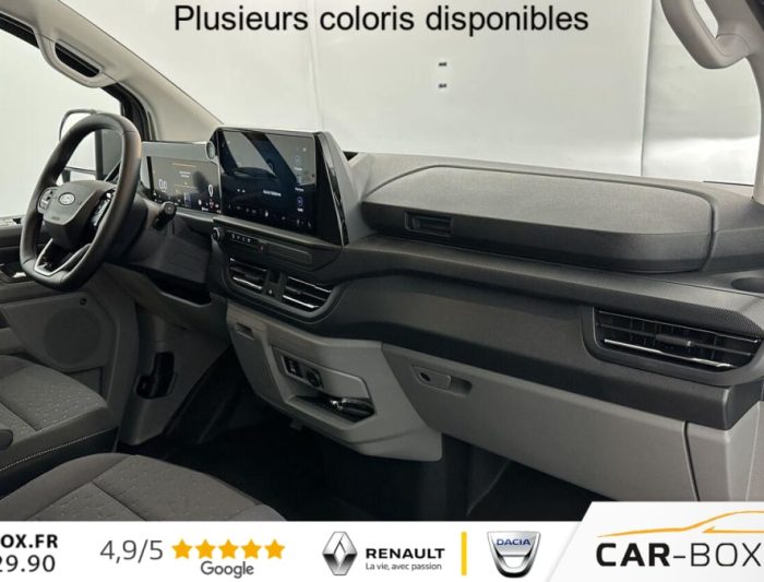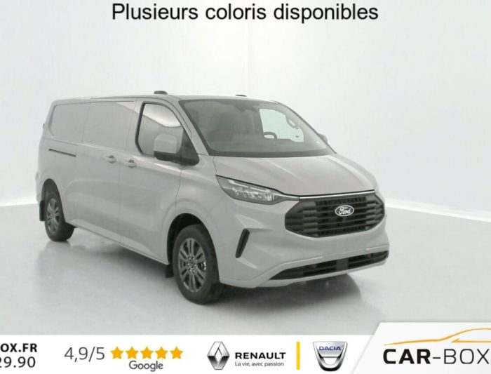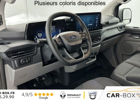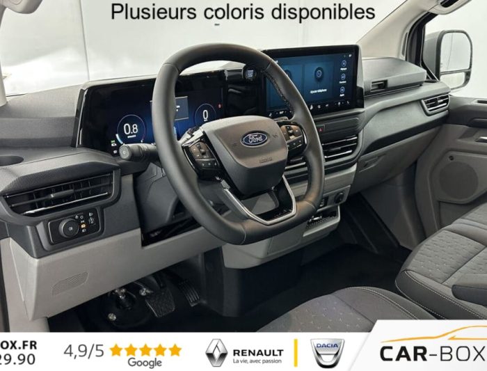 Allumage automatique des phares intelligent (et commutation automatique des feux), Anneaux d'arrimage dans la zone de chargement (x6 pour L1 / x8 pour L2), Chargeur De Telephone Sans Fil A Induction : : option incluse (valeur : 120 Eur TTC), Climatisation à régulation automatique, Cloison de séparation tôlée pleine hauteur, Contrôle de pression des pneumatiques (TPMS), Coques de rétroviseurs extérieurs couleur carrosserie, Eclairage LED renforcé du compartiment de chargement, Entrée et démarrage sans clé (Keyless Entry & Start), Extension de Garantie Ford Protect Custom (5 ans / 100.000 km) : : option incluse (valeur : 1 880 Eur TTC), Faisceau Electrique D'Attelage Seul : : option incluse (valeur : 108 Eur TTC), Garnissage complet pleine hauteur des portes et panneaux latéraux, Jantes Alliage 6x2 Branches 17'' Gris Carbone : : option incluse (valeur : 228 Eur TTC), Pack Assistance Conduite 2, Pack sièges 46, Pare-brise chauffant, Pare-chocs avant/arrière – couleur carrosserie, Peinture métallisée : : option incluse (valeur : 720 Eur TTC), Phares LED avec feux de jour LED, Porte latérale coulissante (côté droit), Portes arrière tôlées battantes à ouverture 90° / 180°, Protection de plancher de chargement en résine synthétique, Réservoir De Carburant Grande Contenance 70 L : : option incluse (valeur : 120 Eur TTC), Rétroviseurs extérieurs double vision chauffants et rabattables automatiquement, Revêtement du plancher de cabine en caoutchouc, Roue De Secours Conventionnelle : : option incluse (valeur : 180 Eur TTC), Système Audio B&O PLAY : : option incluse (valeur : 180 Eur TTC), Système audio 2 – Ford SYNC 4 avec écran tactile 13" (compatibilité Android Auto & Apple Car Play), Système audio 3 – Ford SYNC 4 avec navigation connectée sur écran tactile 13" (compatibilité Android Auto & Apple Car Play) : : option incluse (valeur : 648 Eur TTC), Volant chauffant : : option incluse (valeur : 60 Eur TTC), Volant réglable cuir synthétique Sensico
