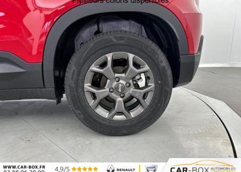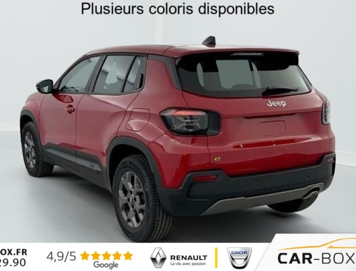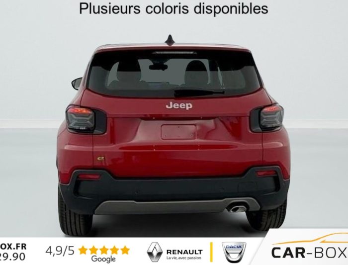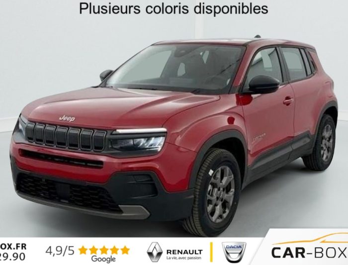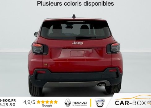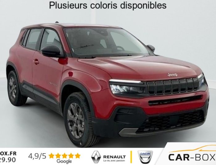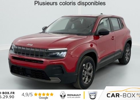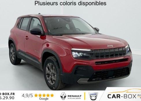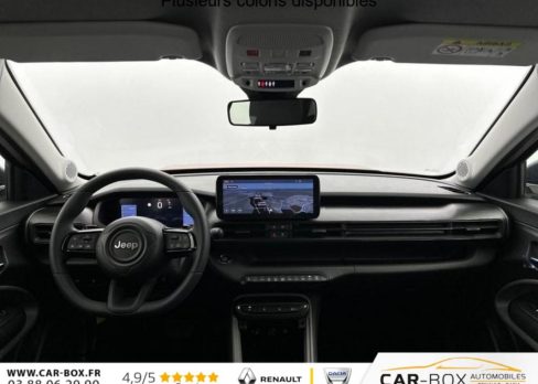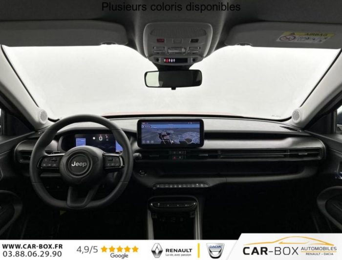 Climatisation automatique, Jantes alliage 16, Sellerie Tissu, Démarrage sans clé, ESP - Système de régulation de comportement dynamique, Régulateur/limiteur de vitesse, Radars de recul, ABS - Système antiblocage des roues, Capteur de luminosité (allumage automatique des feux), Détecteur de somnolence, Reconnaissance des panneaux de signalisation, Alerte de franchissement de ligne avec correction, Services connectés Uconnect Services, Système multimédia à écran tactile Uconnect 10,25'' avec Apple Carplay, Android Auto sans fils, Aide à la descente (Hill Descent Control), Accoudoir central AV, Capteur de pluie (essuie-glaces automatiques), Poches aumônières au dos des sièges AV, Siège conducteur à réglages manuels 6 voies, Siège passager à réglages manuels 4 voies, Vitres AV et AR électriques et séquentielles, Airbags frontaux et latéraux conducteur et passager, airbags rideaux AV/AR, Fixation Isofix sur le siège passager AV, Freinage autonome d'urgence avec détection piétons et cyclistes, Poignées de porte couleur carrosserie, Phares LED avec feux AR halogènes, Système audio 6 HP 100 W, Frein de stationnement électrique, Banquette AR rabattable 60/40, Insert de planche de bord noir grainé, Palettes au volant, Rétroviseurs extérieurs électriques, dégivrants, Rétroviseurs extérieurs noirs, Peinture pastele Ruby : option incluse (valeur : 0 Eur TTC), Selec-Terrain : 6 modes de conduite Eco, Normal, Sport, Sable, Bouge, Neige, Pack Hiver - Sièges AV chauffants - Pare-brise chauffant : Pare-brise chauffant Sièges AV chauffants : option incluse (valeur : 500 Eur TTC), Pack Techno - Combiné d'instrumentation numérique 10,25'' - Navigation connectée avec affichage sur le combiné d'instrumentation numérique - Assistant vocal avancé "Hey Jeep" - Informations sur les panneaux de signalisation - Plancher de coffre modula : Assistant vocal avancé "Hey Jeep" Combiné d'instrumentation numérique 10,25'' Couvercle magnétique pour le rangement de la console centrale Informations sur les panneaux de signalisation (données GPS) Navigation connectée avec affichage sur le combiné d'instrumentation numérique Plancher de coffre modulable et réversible Prise USB-C au 2e rang Projecteurs antibrouillard à LED avec fonction cornering Régulateur de vitesse adaptatif avec fonction Stop&Go : option incluse (valeur : 1 200 Eur TTC), Volant en TEP, Contrôle de la traction (TCS), Contrôle de la pression des pneus, Boîte de vitesses robotisée à double embrayage 6 rapports, Direction assistée