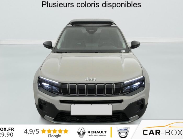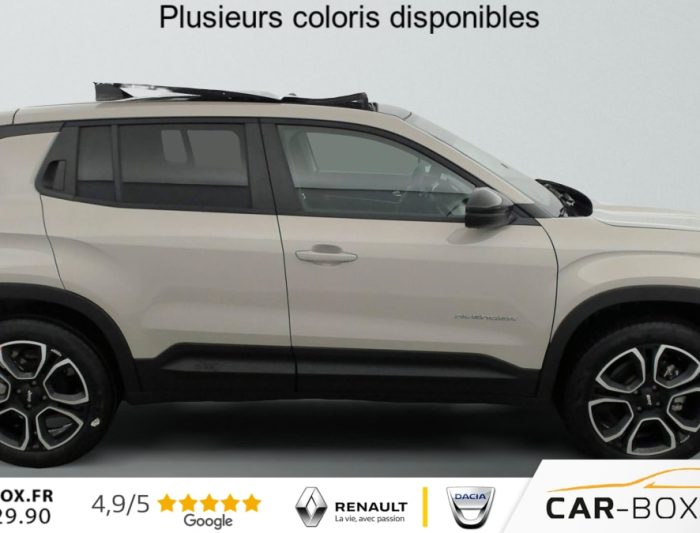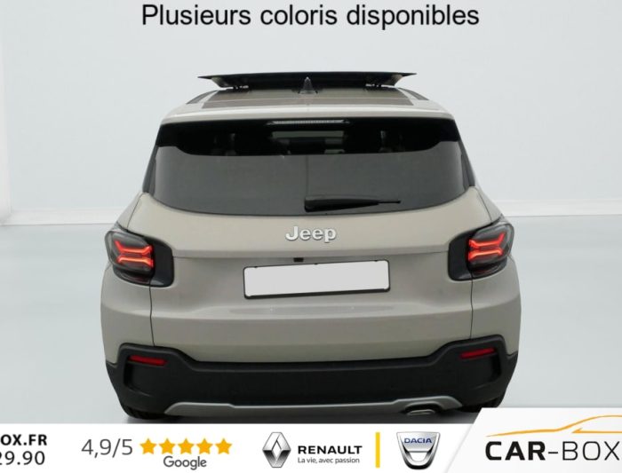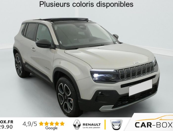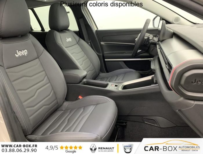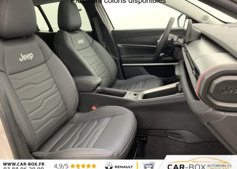 Prolongation garantie constructeur de 24 à 36 mois : option incluse (valeur : 550 Eur TTC), Climatisation automatique, Démarrage sans clé, ESP - Système de régulation de comportement dynamique, ABS - Système antiblocage des roues, Capteur de luminosité (allumage automatique des feux), Détecteur de somnolence, Eclairage d'ambiance multi-colore à LED, Reconnaissance des panneaux de signalisation, Tapis de sol AV et AR, Chargeur sans fil pour smartphone, Régulateur de vitesse adaptatif avec fonction Stop&Go, Alerte de franchissement de ligne avec correction, Combiné d'instrumentation numérique 10,25'', Système multimédia à écran tactile Uconnect 10,25'' avec Apple Carplay, Android Auto sans fils, Vitres et lunette AR surteintées, Aide à la descente (Hill Descent Control), Assistance à la conduite semi-autonome, Caméra de recul 180°, Radars de stationnement 360°, Surveillance des angles morts, Accoudoir central AV, Capteur de pluie (essuie-glaces automatiques), Commutation automatique feux de route/feux de croisement, Eclairage extérieur d'accueil et d'accompagnement, Plancher de coffre modulable et réversible, Poches aumônières au dos des sièges AV, Spots de lecture AV et AR à LED, Vitres AV et AR électriques et séquentielles, Feux AR à LED, Projecteurs Jeep Performance LED, Airbags frontaux et latéraux conducteur et passager, airbags rideaux AV/AR, Fixation Isofix sur le siège passager AV, Projecteurs antibrouillard à LED avec fonction cornering, Rétroviseur intérieur électrochrome sans contour, Freinage autonome d'urgence avec détection piétons et cyclistes, Jantes alliage 18" - 215/55 R18 99 V, Kit de gonflage (Fix & Go) : option incluse (valeur : 50 Eur TTC), Prise USB-C au 2e rang, Poignées de porte couleur carrosserie, Peinture métallisé : option incluse (valeur : 900 Eur TTC), Rétroviseurs extérieurs rabattables électriquement, Frein de stationnement électrique, Toit ouvrant électrique en verre : option incluse (valeur : 1 000 Eur TTC), Banquette AR rabattable 60/40, Palettes au volant, Rétroviseurs extérieurs électriques, dégivrants, Insert de planche de bord peint Gris Silver, Prédisposition attelage, Selec-Terrain : 6 modes de conduite Eco, Normal, Sport, Sable, Bouge, Neige, Pack Cuir Sellerie cuir, Siège conducteur à réglages électriques 8 voies (dont réglage lombaire) et fonction massage, Siège passager réglable en hauteur, Sièges AV chauffants, Pare-brise chauffant, Tapis de sol AV et AR : Tapis de sol AV et AR Sièges AV chauffants Pare-brise chauffant Siège passager réglable en hauteur Sellerie cuir Assise et face AV des dossiers Siège conducteur à réglages électriques 8 voies (dont réglage lombaire) et fonction massage : option incluse (valeur : 1 400 Eur TTC), Pack Premium Plus - Navigation connectée avec affichage sur le combiné d'instrumentation numérique - Assistant vocal avancé "Hey Jeep" - Informations sur les panneaux de signalisation - Système hi-fi premium JBL 8 HP 300 W - Enter-N-Go : système d'ouverture et de démarrage sans clé - Hayon électrique mains-libres - Couvercle magnétique pour le rangement de la console centrale : Enter-N-Go : ouverture et démarrage sans clé Hayon électrique mains libres Assistant vocal avancé "Hey Jeep" Informations sur les panneaux de signalisation (données GPS) Navigation connectée avec affichage sur le combiné d'instrumentation numérique Système hi-fi premium JBL 8 HP 300 W : option incluse (valeur : 1 500 Eur TTC), Volant en TEP, Contrôle de la traction (TCS), Contrôle de la pression des pneus, Boîte de vitesses robotisée à double embrayage 6 rapports, Direction assistée
