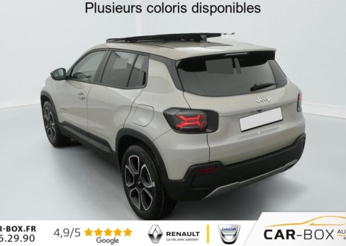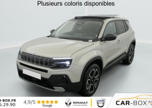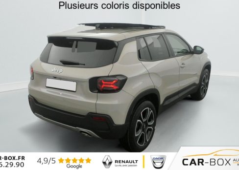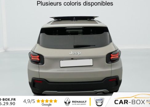 1.2 Turbo T3 110 ch e-Hybrid BVR6 Summit, hybride, noir, 29/12/2025, Prolongation garantie constructeur de 24 à 36 mois : option incluse (valeur : 550 Eur TTC), Climatisation automatique, Démarrage sans clé, ESP – Système de régulation de comportement dynamique, ABS – Système antiblocage des roues, Capteur de luminosité (allumage automatique des feux), Détecteur de somnolence, Eclairage d’ambiance multi-colore à LED, Reconnaissance des panneaux de signalisation, Tapis de sol AV et AR, Chargeur sans fil pour smartphone, Régulateur de vitesse adaptatif avec fonction Stop&Go, Alerte de franchissement de ligne avec correction, Combiné d’instrumentation numérique 10, 25 », Système multimédia à écran tactile Uconnect 10, 25 » avec Apple Carplay, Android Auto sans fils, Vitres et lunette AR surteintées, Aide à la descente (Hill Descent Control), Assistance à la conduite semi-autonome, Caméra de recul 180°, Radars de stationnement 360°, Surveillance des angles morts, Accoudoir central AV, Capteur de pluie (essuie-glaces automatiques), Commutation automatique feux de route/feux de croisement, Eclairage extérieur d’accueil et d’accompagnement, Plancher de coffre modulable et réversible, Poches aumônières au dos des sièges AV, Spots de lecture AV et AR à LED, Vitres AV et AR électriques et séquentielles, Feux AR à LED, Projecteurs Jeep Performance LED, Airbags frontaux et latéraux conducteur et passager, airbags rideaux AV/AR, Fixation Isofix sur le siège passager AV, Projecteurs antibrouillard à LED avec fonction cornering, Rétroviseur intérieur électrochrome sans contour, Freinage autonome d’urgence avec détection piétons et cyclistes, Jantes alliage 18" – 215/55 R18 99 V, Kit de gonflage (Fix & Go) : option incluse (valeur : 50 Eur TTC), Prise USB-C au 2e rang, Poignées de porte couleur carrosserie, Peinture métallisé : option incluse (valeur : 900 Eur TTC), Rétroviseurs extérieurs rabattables électriquement, Frein de stationnement électrique, Toit ouvrant électrique en verre : option incluse (valeur : 1 000 Eur TTC), Banquette AR rabattable 60/40, Palettes au volant, Rétroviseurs extérieurs électriques, dégivrants, Insert de planche de bord peint Gris Silver, Prédisposition attelage, Selec-Terrain : 6 modes de conduite Eco, Normal, Sport, Sable, Bouge, Neige, Pack Cuir Sellerie cuir, Siège conducteur à réglages électriques 8 voies (dont réglage lombaire) et fonction massage, Siège passager réglable en hauteur, Sièges AV chauffants, Pare-brise chauffant, Tapis de sol AV et AR : Tapis de sol AV et AR Sièges AV chauffants Pare-brise chauffant Siège passager réglable en hauteur Sellerie cuir Assise et face AV des dossiers Siège conducteur à réglages électriques 8 voies (dont réglage lombaire) et fonction massage : option incluse (valeur : 1 400 Eur TTC), Pack Premium Plus – Navigation connectée avec affichage sur le combiné d’instrumentation numérique – Assistant vocal avancé "Hey Jeep" – Informations sur les panneaux de signalisation – Système hi-fi premium JBL 8 HP 300 W – Enter-N-Go : système d’ouverture et de démarrage sans clé – Hayon électrique mains-libres – Couvercle magnétique pour le rangement de la console centrale : Enter-N-Go : ouverture et démarrage sans clé Hayon électrique mains libres Assistant vocal avancé "Hey Jeep" Informations sur les panneaux de signalisation (données GPS) Navigation connectée avec affichage sur le combiné d’instrumentation numérique Système hi-fi premium JBL 8 HP 300 W : option incluse (valeur : 1 500 Eur TTC), Volant en TEP, Contrôle de la traction (TCS), Contrôle de la pression des pneus, Boîte de vitesses robotisée à double embrayage 6 rapports, Direction assistée