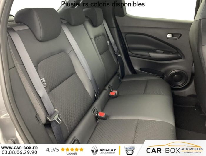 Pack Hiver: Sièges AV chauffants Volant chauffant en cuir Pare-brise chauffant : option incluse (valeur : 500 Eur TTC), Phares antibrouillard à LED : option incluse (valeur : 150 Eur TTC), Ciel de toit Noir, Accoudoir central AV, Rétroviseur intérieur électrochromatique, Banquette AR rabattable , Vitres AR teintées, Reconnaissance des panneaux de signalisation, Avertisseur de ceintures de sécurité, Détecteur de pluie avec essuie-glaces à déclenchement automatique, Pare-soleil côté conducteur et passager avec miroir de courtoisie, Commandes au volant, Feux de route adaptatifs, Eclairage du coffre, ESP (Contrôle électronique de trajectoire), Système "Chassis Control" : Intelligent Trace Control (contrôle actif de trajectoire) et Intelligent Ride Control (Contrôle actif de l'assiette), Appel d'urgence, e-Pedal Step, Contre-portes et tableau de bord en TEP noir, Rétroviseurs extérieurs dégivrants et rabattables automatiquement, Sélection du mode de conduite (ECO, STANDARD et SPORT), Système STOP/START, Caméra de recul avec radars de stationnement AV et AR, Poignées intérieures d'ouverture de porte chromées, Allumage intelligent des feux, Jantes alliage 17", Prévention de franchissement de ligne intelligent, Feux AV et AR LED, Aide au démarrage en côte, Système de navigation NissanConnect avec écran tactile 12,3", Mode EV, Double port USB Av / Ar (USB-A et USB-C), Peinture métallisée : option incluse (valeur : 650 Eur TTC), Feux diurnes LED, Freinage d'urgence AR intelligent avec détection piéton et cyclistes, Sellerie Mixte TEP/Tissu Noir, Apple Car Play et Android Auto sans fil, EBD (répartiteur électronique de freinage), Combiné d'instrumentation digital 12,3'', Système d'ouverture et de démarrage sans clé "Intelligent key" , Airbags frontaux, latéraux AV et rideaux, Système de détection de fatigue intelligent, Volant gainé de cuir synthétique, Repose-genoux en TEP noir, Eclairage d'accompagnement automatique, Vitres AV/AR électriques , Bouton de démarrage Start/Stop, Chargeur à induction pour Smartphone, Roue de secours : option incluse (valeur : 200 Eur TTC), Siège conducteur réglable en hauteur, Volant réglable en hauteur et en profondeur, Système de contrôle de la pression des pneus, Spoiler AR, Régulateur et limiteur de vitesse, NBAS (amplificateur de freinage d'urgence), Prise 12 V AV, Climatisation automatique, Points d'ancrage pour sièges enfants ISOFIX à l'AR, Système mains libres Bluetooth