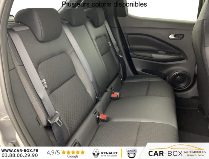 Pack Hiver: Sièges AV chauffants Volant chauffant en cuir Pare-brise chauffant : option incluse (valeur : 500 Eur TTC), Phares antibrouillard à LED : option incluse (valeur : 150 Eur TTC), Système de navigation NissanConnect avec écran tactile 12,3", Accoudoir central AV, Banquette AR rabattable , Reconnaissance des panneaux de signalisation, Détecteur de pluie avec essuie-glaces à déclenchement automatique, Pare-soleil côté conducteur et passager avec miroir de courtoisie, Commandes au volant: contrôle de l'ordinateur de bord, audio, téléphone, régulateur et limiteur de vitesse, Feux de route adaptatifs, Eclairage du coffre, Système "Chassis Control" : Intelligent Trace Control (contrôle actif de trajectoire) et Intelligent Ride Control (Contrôle actif de l'assiette), Frein à main électrique avec aide au stationnement/démarrage et fonction Autohold, Appel d'urgence, e-Pedal Step, Rétroviseurs extérieurs réglables électriquement avec indicateurs de changement de direction, Rétroviseurs extérieurs dégivrants et rabattables automatiquement, Sélection du mode de conduite (ECO, STANDARD et SPORT), Système STOP/START, Caméra de recul avec radars de stationnement AV et AR, Poignées intérieures d'ouverture de porte chromées, Allumage intelligent des feux, Jantes alliage 17", Prévention de franchissement de ligne intelligent, Feux AV et AR LED, Aide au démarrage en côte, Peinture métallisée : option incluse (valeur : 700 Eur TTC), Feux diurnes LED, Freinage d'urgence AR intelligent avec détection piéton et cyclistes, Sellerie Mixte TEP/Tissu Noir, Apple Car Play et Android Auto sans fil, Combiné d'instrumentation digital 12,3'', Système d'ouverture et de démarrage sans clé "Intelligent key" avec fonction de verrouillage/ déverrouillage à l'approche du véhicule, Airbags frontaux, latéraux AV et rideaux, Système de détection de fatigue intelligent, Volant gainé de cuir synthétique, Sièges AV avec appuis-tête intégrés, Eclairage d'accompagnement automatique, Vitres AV/AR électriques, Chargeur à induction pour Smartphone, Roue de secours : option incluse (valeur : 200 Eur TTC), Siège conducteur réglable en hauteur, Commandes vocales, Volant réglable en hauteur et en profondeur, Système de contrôle de la pression des pneus, Régulateur et limiteur de vitesse, Prise 12 V AV, Climatisation automatique, Points d'ancrage pour sièges enfants ISOFIX à l'AR, Système mains libres Bluetooth