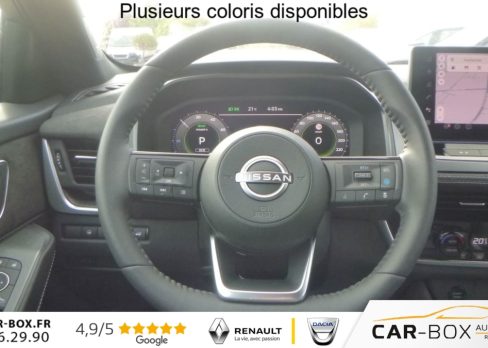 ABS (systeme antiblocage des freins), Accoudoir central AR avec porte-gobelets (2), Accoudoir central AV, Affichage tete haute avec projection sur le pare-brise 10,8'', Aide au demarrage en cote, Airbags frontaux, lateraux AV, rideaux et central, Alarme perimetrique, Alerte et prevention de sortie de voie, Allumage intelligent des feux, Antenne aileron de requin, Appel d'urgence, Apple Car Play et Android Auto sans fil, Assistance au maintien de trajectoire, Avertisseur de ceintures de securite, Badges e-POWER, Banquette AR rabattable 60/40, Cache-bagages amovible, Chargeur a induction pour Smartphone 15W, Climatisation automatique bi-zones , Combine d'instrumentation digital 12,3'', Commandes au volant: controle de l'ordinateur de bord, audio, telephone, Condamnation centralisee des portes, Detecteur de pluie avec essuie-glaces a declenchement automatique, Direction assistee, Double ports USB AV et AR (USB-C), EBD (repartiteur electronique de freinage), Eclairage d'ambiance personnalisable (11 points lumineux), Eclairage du coffre (x2), ESP (Controle electronique de trajectoire), Feux AV et AR LED, Feux de route adaptatifs, Feux diurnes LED, Frein a main electrique avec fonction autohold, Freinage d'urgence anticollision AR, Freinage d'urgence intelligent avec detection pietons, cyclistes et intersections, Hayon electrique avec ouverture mains libres, Jantes alliage 20'' , Kit de reparation pneumatique, Leve-vitres electriques avec mode impulsionnel a l'AV et a l'AR, Limiteur de vitesse, Liseuses LED a l'AV et a l'AR, Mode de direction assistee , Mode EV , Nissan AVM 3D - Vision Intelligente a 360 , Pack Hiver (Pare-brise chauffant, Sieges AV chauffants, Volant chauffant), Pares-soleil cote conducteur et passager avec miroirs de courtoisie eclaires , Park assist , Poignees de maintien AV et AR, Points d'ancrage pour sieges enfants ISOFIX a l'AR (x2), Porte-gobelets (x2), Prise 12V a l'AV (x1) et dans le coffre (x1), Radars de stationnement AR, Radars de stationnement AV, Radio numerique DAB, Rails de toit longitudinaux chromes, Reconnaissance des panneaux de signalisation, Regulateur de vitesse intelligent , Retroviseur interieur electrochromatique sans contour, Retroviseurs exterieurs reglables electriquement, rabattables et degivrants, Selection du mode de conduite (ECO, STANDARD et SPORT), Siege conducteur avec fonction memoire, Sieges AV avec fonction massage (3 modes), Sieges AV avec reglages electriques, Support lombaire reglable electriquement, Systeme audio Bose Premium avec 10 HP et un caisson de basses Acoustimass, Systeme de controle de la pression des pneus, Systeme de demarrage sans cle avec bouton START/STOP, Systeme de detection de fatigue intelligent, Systeme de navigation NissanConnect avec services Google integres, Systeme de surveillance des angles morts intelligent, Systeme d'ouverture et de demarrage sans cle ''Intelligent key'', Systeme mains libres Bluetooth, Technologie e-Pedal Step, Toit panoramique en verre, Trappe de carburant sans bouchon, Vitres AR teintees, Volant gaine cuir, Volant reglable en hauteur et en profondeur