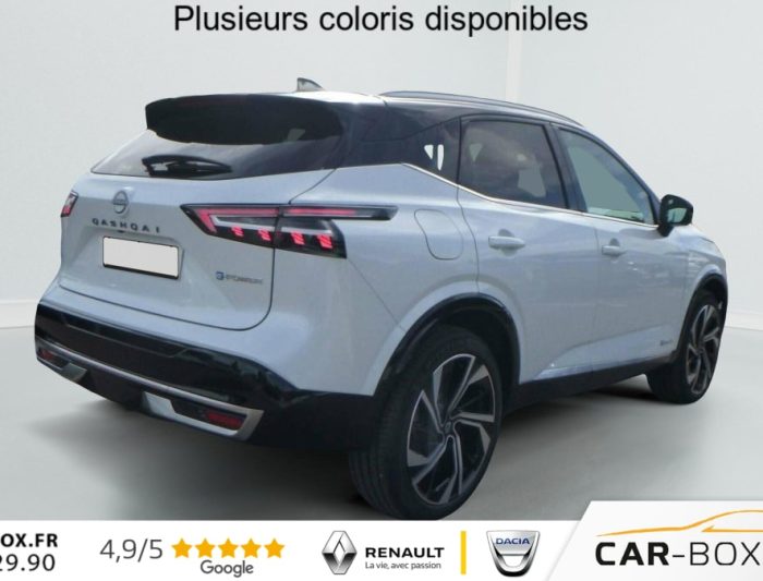 ABS (systeme antiblocage des freins), Accoudoir central AR avec porte-gobelets (2), Accoudoir central AV, Affichage tete haute avec projection sur le pare-brise 10,8'', Aide au demarrage en cote, Airbags frontaux, lateraux AV, rideaux et central, Alarme perimetrique, Alerte et prevention de sortie de voie, Allumage intelligent des feux, Antenne aileron de requin, Appel d'urgence, Apple Car Play et Android Auto sans fil, Assistance au maintien de trajectoire, Badges e-POWER, Banquette AR rabattable 60/40, Cache-bagages amovible, Chargeur a induction pour Smartphone 15W, Climatisation automatique bi-zone, Combine d'instrumentation digital 12,3'', Commandes au volant: controle de l'ordinateur de bord, audio, telephone,, Condamnation centralisee des portes, Detecteur de pluie avec essuie-glaces a declenchement automatique, Direction assistee, Double port USB AV et AR (USB-C), EBD (repartiteur electronique de freinage), Eclairage d'ambiance personnalisable (11 points lumineux), Eclairage du coffre (x2), ESP (Controle electronique de trajectoire), Feu stop central LED, Feux AV et AR LED, Feux de route adaptatifs, Feux diurnes LED, Frein a main electrique avec aide au stationnement/demarrage et fonction Autohold, Freinage d'urgence anticollision AR, Freinage d'urgence intelligent avec detection pietons, cyclistes et intersections, Hayon electrique avec ouverture mains libres, Jantes alliage 20'' avec suspension AR multibras, Kit de reparation pneumatique, Leve-vitres electriques avec mode impulsionnel a l'AV et a l'AR, Limiteur de vitesse, Liseuses LED a l'AV et a l'AR, Nissan AVM 3D - Vision Intelligente a 360 : systeme d'aide au stationnement qui facilite les, NissanConnect Services - Services telematiques avec acces a distance depuis un smartphone, Ouverture des portieres AR a 85, Pack Hiver (Pare-brise chauffant, Sieges AV chauffants, Volant chauffant), Pare-soleil cote conducteur et passager avec miroir de courtoisie eclaire, Poignees de maintien pour passager AV et AR, Points d'ancrage pour sieges enfants ISOFIX a l'AR (x2), Porte-gobelets (x2), Prise 12V a l'AV (x1) et dans le coffre (x1), Radars de stationnement AR, Radars de stationnement AV, Radio numerique DAB, Rails de toit longitudinaux chromes, Reconnaissance des panneaux de signalisation, Regulateur de vitesse intelligent avec ajustement aux limitations de vitesse sur commande, Retroviseur interieur electrochromatique sans contour, Retroviseurs exterieurs reglables electriquement, rabattables et degivrants, Selection du mode de conduite (ECO, STANDARD et SPORT), Siege conducteur avec fonction memoire, Siege conducteur reglable en hauteur, Sieges AV avec fonction massage (3 modes), Sieges AV avec reglages electriques, Support lombaire reglable electriquement, Systeme audio Bose Premium avec 10 HP et un caisson de basses Acoustimass, Systeme de controle de la pression des pneus, Systeme de demarrage sans cle avec bouton START/STOP, Systeme de detection de fatigue intelligent, Systeme de navigation NissanConnect avec services Google integres, Systeme de surveillance des angles morts intelligent, Systeme d'ouverture et de demarrage sans cle ''Intelligent key'' avec fonction de verrouillage/, Systeme mains libres Bluetooth, Technologie e-Pedal Step, Toit panoramique en verre, Trappe de carburant sans bouchon, Vitres AR teintees, Volant gaine cuir, Volant reglable en hauteur et en profondeur, 6 crochets de fixation dans le coffre (4 au plancher, 2 sur les cotes)