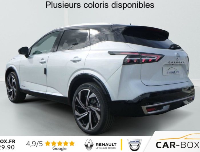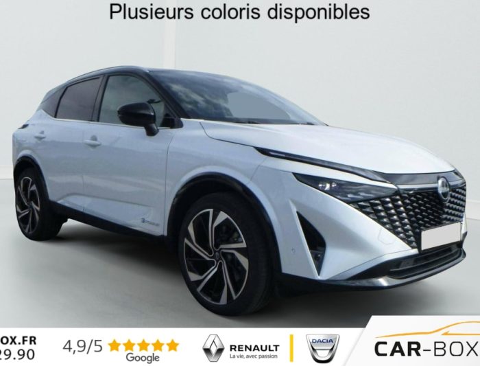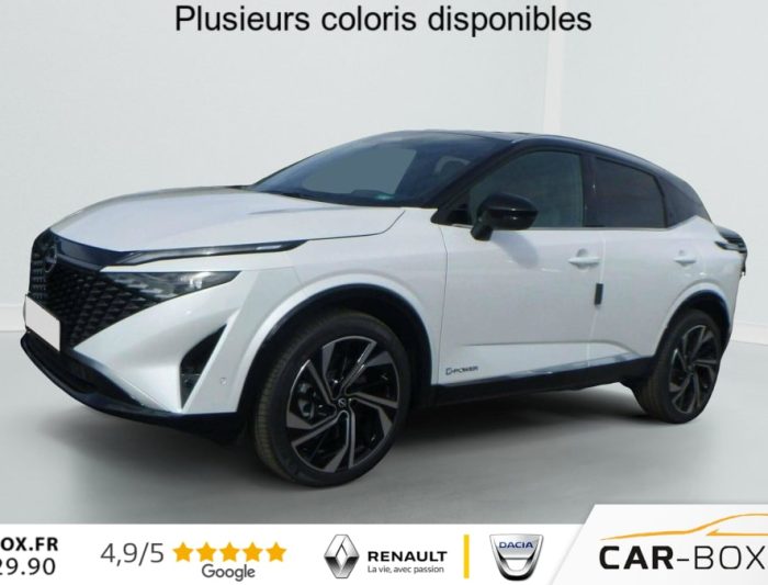 Hors frais de dossiere-Power 190 ch Tekna+, hybride, blanc, 01/08/2025, ABS (systeme antiblocage des freins), Accoudoir central AR avec porte-gobelets (2), Accoudoir central AV, Affichage tete haute avec projection sur le pare-brise 10, 8 », Aide au demarrage en cote, Airbags frontaux, lateraux AV, rideaux et central, Alarme perimetrique, Alerte et prevention de sortie de voie, Allumage intelligent des feux, Antenne aileron de requin, Appel d’urgence, Apple Car Play et Android Auto sans fil, Assistance au maintien de trajectoire, Avertisseur de ceintures de securite, Badges e-POWER, Banquette AR rabattable 60/40, Cache-bagages amovible, Chargeur a induction pour Smartphone 15W, Climatisation automatique bi-zones, Combine d’instrumentation digital 12, 3 », Commandes au volant: controle de l’ordinateur de bord, audio, telephone, Condamnation centralisee des portes, Detecteur de pluie avec essuie-glaces a declenchement automatique, Direction assistee, Double ports USB AV et AR (USB-C), EBD (repartiteur electronique de freinage), Eclairage d’ambiance personnalisable (11 points lumineux), Eclairage du coffre (x2), ESP (Controle electronique de trajectoire), Feux AV et AR LED, Feux de route adaptatifs, Feux diurnes LED, Frein a main electrique avec fonction autohold, Freinage d’urgence anticollision AR, Freinage d’urgence intelligent avec detection pietons, cyclistes et intersections, Hayon electrique avec ouverture mains libres, Jantes alliage 20 », Kit de reparation pneumatique, Leve-vitres electriques avec mode impulsionnel a l’AV et a l’AR, Limiteur de vitesse, Liseuses LED a l’AV et a l’AR, Mode de direction assistee, Mode EV, Nissan AVM 3D – Vision Intelligente a 360, Pack Hiver (Pare-brise chauffant, Sieges AV chauffants, Volant chauffant), Pares-soleil cote conducteur et passager avec miroirs de courtoisie eclaires, Park assist, Poignees de maintien AV et AR, Points d’ancrage pour sieges enfants ISOFIX a l’AR (x2), Porte-gobelets (x2), Prise 12V a l’AV (x1) et dans le coffre (x1), Radars de stationnement AR, Radars de stationnement AV, Radio numerique DAB, Rails de toit longitudinaux chromes, Reconnaissance des panneaux de signalisation, Regulateur de vitesse intelligent, Retroviseur interieur electrochromatique sans contour, Retroviseurs exterieurs reglables electriquement, rabattables et degivrants, Selection du mode de conduite (ECO, STANDARD et SPORT), Siege conducteur avec fonction memoire, Sieges AV avec fonction massage (3 modes), Sieges AV avec reglages electriques, Support lombaire reglable electriquement, Systeme audio Bose Premium avec 10 HP et un caisson de basses Acoustimass, Systeme de controle de la pression des pneus, Systeme de demarrage sans cle avec bouton START/STOP, Systeme de detection de fatigue intelligent, Systeme de navigation NissanConnect avec services Google integres, Systeme de surveillance des angles morts intelligent, Systeme d’ouverture et de demarrage sans cle »Intelligent key », Systeme mains libres Bluetooth, Technologie e-Pedal Step, Toit panoramique en verre, Trappe de carburant sans bouchon, Vitres AR teintees, Volant gaine cuir, Volant reglable en hauteur et en profondeur