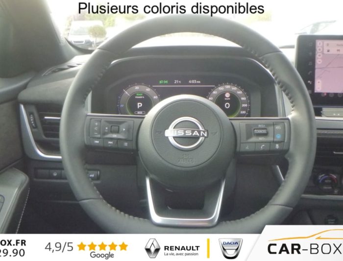 ABS (systeme antiblocage des freins), Accoudoir central AR avec porte-gobelets (2), Accoudoir central AV, Affichage tete haute avec projection sur le pare-brise 10,8'', Aide au demarrage en cote, Airbags frontaux, lateraux AV, rideaux et central, Alarme perimetrique, Alerte et prevention de sortie de voie, Allumage intelligent des feux, Antenne aileron de requin, Appel d'urgence, Apple Car Play et Android Auto sans fil, Assistance au maintien de trajectoire, Avertisseur de ceintures de securite, Badges e-POWER, Banquette AR rabattable 60/40, Cache-bagages amovible, Chargeur a induction pour Smartphone 15W, Climatisation automatique bi-zones , Combine d'instrumentation digital 12,3'', Commandes au volant: controle de l'ordinateur de bord, audio, telephone, Condamnation centralisee des portes, Detecteur de pluie avec essuie-glaces a declenchement automatique, Direction assistee, Double ports USB AV et AR (USB-C), EBD (repartiteur electronique de freinage), Eclairage d'ambiance personnalisable (11 points lumineux), Eclairage du coffre (x2), ESP (Controle electronique de trajectoire), Feux AV et AR LED, Feux de route adaptatifs, Feux diurnes LED, Frein a main electrique avec fonction autohold, Freinage d'urgence anticollision AR, Freinage d'urgence intelligent avec detection pietons, cyclistes et intersections, Hayon electrique avec ouverture mains libres, Jantes alliage 20'' , Kit de reparation pneumatique, Leve-vitres electriques avec mode impulsionnel a l'AV et a l'AR, Limiteur de vitesse, Liseuses LED a l'AV et a l'AR, Mode de direction assistee , Mode EV , Nissan AVM 3D - Vision Intelligente a 360 , Pack Hiver (Pare-brise chauffant, Sieges AV chauffants, Volant chauffant), Pares-soleil cote conducteur et passager avec miroirs de courtoisie eclaires , Park assist , Poignees de maintien AV et AR, Points d'ancrage pour sieges enfants ISOFIX a l'AR (x2), Porte-gobelets (x2), Prise 12V a l'AV (x1) et dans le coffre (x1), Radars de stationnement AR, Radars de stationnement AV, Radio numerique DAB, Rails de toit longitudinaux chromes, Reconnaissance des panneaux de signalisation, Regulateur de vitesse intelligent , Retroviseur interieur electrochromatique sans contour, Retroviseurs exterieurs reglables electriquement, rabattables et degivrants, Selection du mode de conduite (ECO, STANDARD et SPORT), Siege conducteur avec fonction memoire, Sieges AV avec fonction massage (3 modes), Sieges AV avec reglages electriques, Support lombaire reglable electriquement, Systeme audio Bose Premium avec 10 HP et un caisson de basses Acoustimass, Systeme de controle de la pression des pneus, Systeme de demarrage sans cle avec bouton START/STOP, Systeme de detection de fatigue intelligent, Systeme de navigation NissanConnect avec services Google integres, Systeme de surveillance des angles morts intelligent, Systeme d'ouverture et de demarrage sans cle ''Intelligent key'', Systeme mains libres Bluetooth, Technologie e-Pedal Step, Toit panoramique en verre, Trappe de carburant sans bouchon, Vitres AR teintees, Volant gaine cuir, Volant reglable en hauteur et en profondeur
