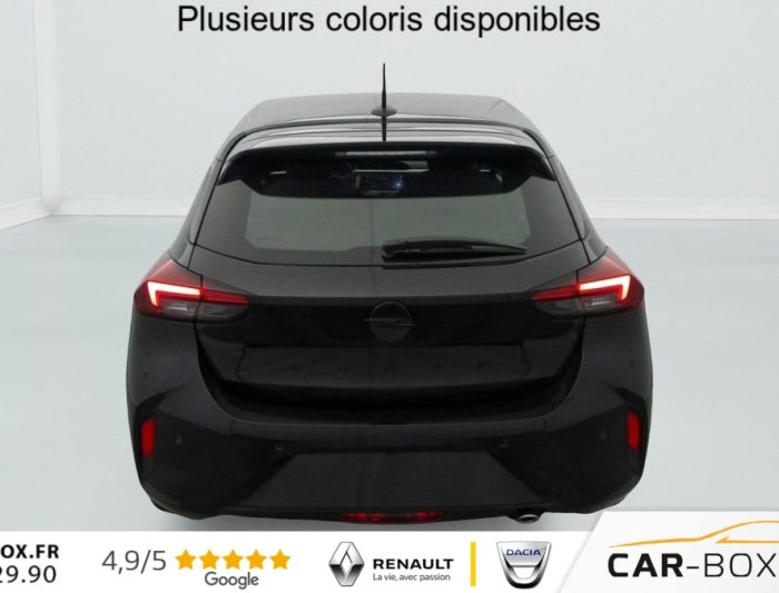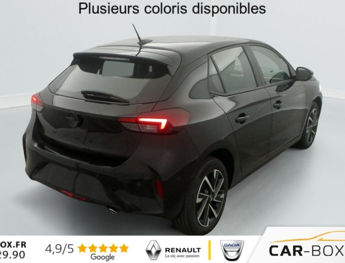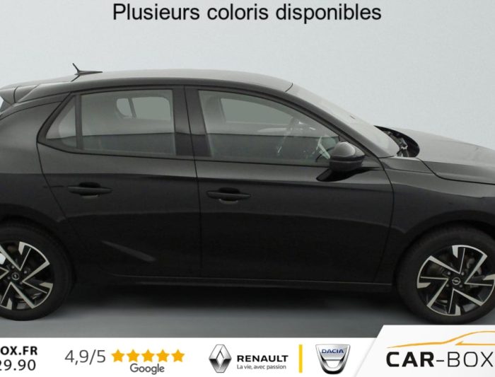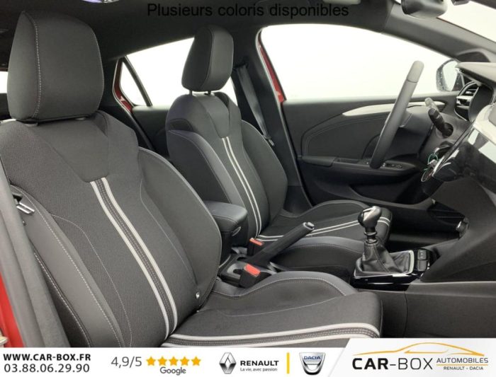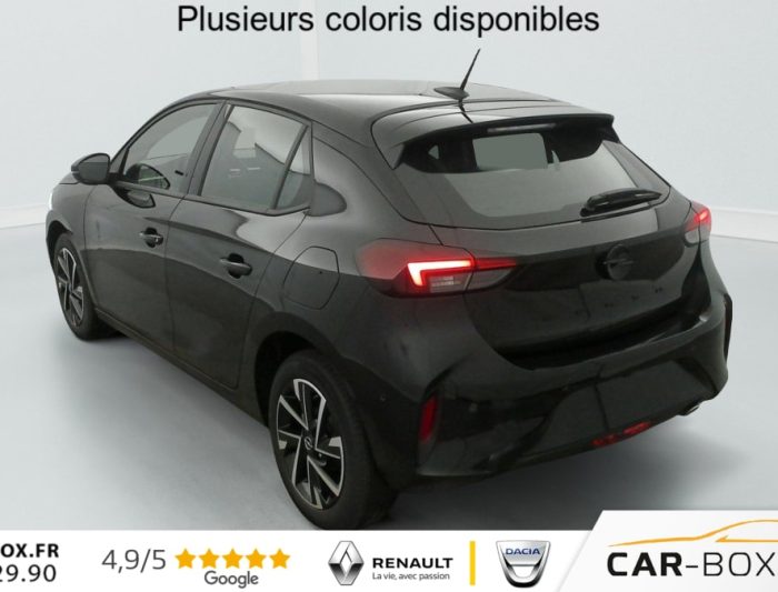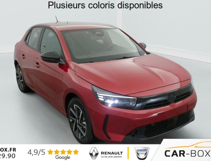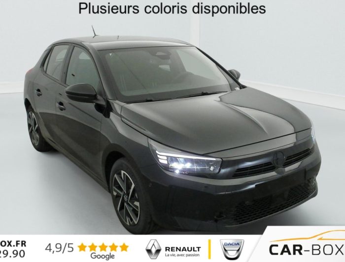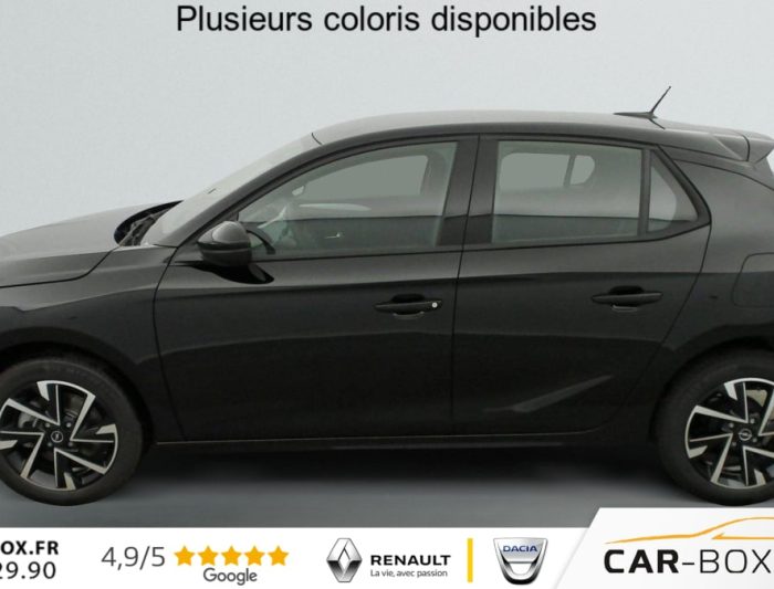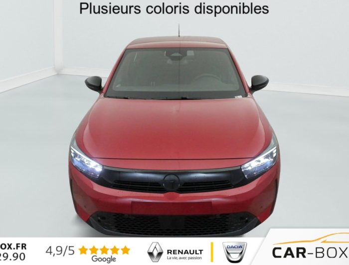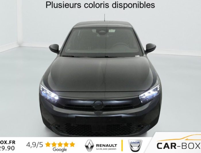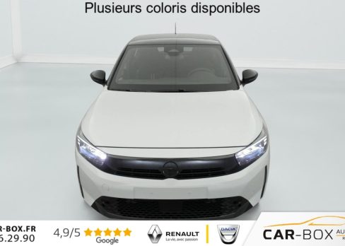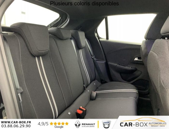 Jantes alliage 16", Prolongation garantie constructeur de 24 à 36 mois : option incluse (valeur : 550 Eur TTC), Spoiler AR, Ligne de vitrage noire, Fixations Isofix sièges enfants aux places AR latérales, Siège conducteur réglable dans 6 directions, Alerte de sous-gonflage des pneumatiques, Aide au stationnement AR, Poignées de portes intérieures chromées, Rétroviseurs extérieurs rabattables électriquement, Aide au stationnement AV, Alerte d'angle mort, Banquette AR rabattable 2/3-1/3, Direction assistée électrique, Console centrale avec porte-gobelets, accoudoir central et espace de rangement, Système de freinage avec antiblocage des roues (ABS), Calandre Opel Vizor, Pare-soleils avec miroir de courtoisie côté passager, Phares AR à LED, Module Opel Connect, Frein à main mécanique, Coquilles de rétroviseurs peintes en noir, Climatisation manuelle, Combiné d'instrumentation numérique 7", Allumage automatique des feux de croisement, Peintures métallisées : option incluse (valeur : 600 Eur TTC), Radio FM/AM/DAB+, Toit couleur carrosserie : option incluse (valeur : 0 Eur TTC), Airbags frontaux et latéraux conducteur et passager AV, rideaux, Ceintures de sécurité à préhension pyrotechnique, Détection de non-bouclage des ceintures de sécurité aux places AV, Pack Visibilité LED Allumage et commutation automatique des feux de route/croisement, Capteur de pluie, Rétroviseur intérieur électrochraomatique, Phares AV Eco Full LED, Feux diurnes Eco LED, Réglage manuel des feux : Rétroviseur intérieur électrochromatique Capteur de pluie Phares AV Eco Full LED Allumage et commutation automatique des feux de route/croisement Feux diurnes Eco-LED Réglage manuel des feux, Verrouillage centralisé avec télécommande et en roulant, 1 clé à télécommande et seconde clé rigide, Verrouillage automatique de la trappe à essence lors de la fermeture du véhicule, Fonction Bluetooth (appels et streaming audio), Signature lumineuse en forme d'aile à LED, Vitres AV et AR électriques - système anti-pincement, Grille inférieure en nid d'abeilles peinte - Noir, Sièges AV type sport, Sellerie Tissu Banda - Noir/Blanc, Pare-choc AR type sport, 1 prise USB type C à l'AV, Lettrage et logo - Noir, Apple CarPlay et Android Auto sans fil, Rétroviseurs extérieurs réglables électriquement, Ecran tactile 10" couleur compatible Apple CarPlay/Android Auto sans fil, Volant multifonction TEP Vegan, Décor intérieur Noir avec inserts blanc, Pack Confort Sièges AV chauffants, Volant chauffant avec méplat TEP Végan, Réglage du siège passager dans 6 directions, Seconde clé a télécommande : Sièges AV chauffants Seconde clé à télécommande Réglage du siège passager dans 6 directions Volant chauffant avec méplat TEP Vegan : option incluse (valeur : 300 Eur TTC), Pack Sécurité avancée Aide active au maintien au centre de la voie, Aide au démarrage en côte, Aide au freinage d'urgence, Alerte anti-somnolence, Limiteur de vitesse, Reconnaissance des panneaux de signalisation améliorée, Régulateur de vitesse, Système anti-collision à basse vitesse et détection des piétons : Aide au freinage d'urgence Aide au démarrage en côte Alerte anti-somnolence Reconnaissance des panneaux de signalisation améliorée Système anti-collision à basse vitesse et détection des piétons Régulateur de vitesse Limiteur de vitesse Aide active au maintien au centre de la voie, Caméra de recul analogique 130° panoramique, ABS, ESP, TCS, Boîte manuelle 6 rapports, Contrôle de pression des pneus, Volant réglable en hauteur et en profondeur, 4 HP, 5 appuis-tête réglables en hauteur, Ciel de pavillon noir