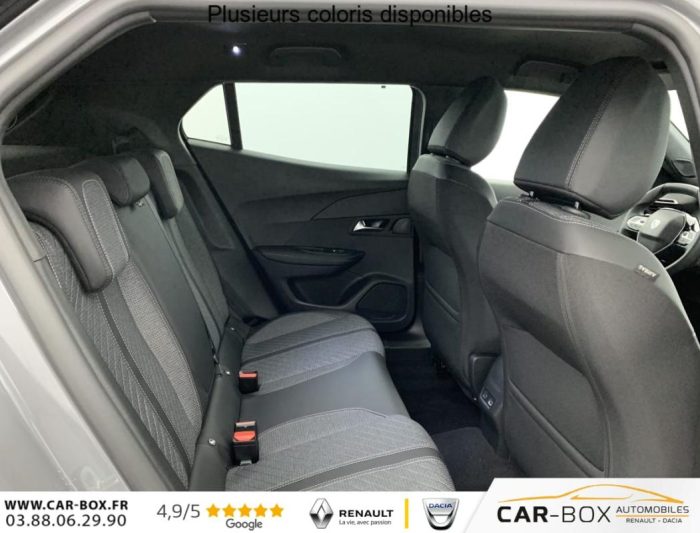 Sièges AV chauffants : option incluse (valeur : 250 Eur TTC), ABS, Boîte manuelle, Habitacle et ciel de pavillon Noir, Télécommande 3 boutons + clé standard, Direction assistée, Canule d'échappement non chromée, Siège conducteur avec réglage manuel en hauteur, Siège passager AV avec réglage manuel en hauteur, Feux AR 3 griffes à LED, Banquette rabattable 1/3 - 2/3, 6 HPs (2 tweeters et 2 woofers à l'AV et 2 HPs à l'AR), Vitres latérales AR et lunette AR chauffante temporisée surteintées, Air conditionné automatique monozone, Rétroviseurs extérieurs dégivrants avec réglage et rabattement électriques, Appuis-tête réglables en hauteur AV (x2) et AR (x3), Teintes métallisées : option incluse (valeur : 700 Eur TTC), Peugeot Connect SOS , Sellerie tissu CASUAL LOMSA embossé, accompagnement TEP Isabella, trimatière LOMSA et surpiqûres Quartz, Jantes alliage 17" diamantées KARAKOY bi-tons Noir Onyx et vernis brillant, ESP Déconnectable avec aide au démarrage en pente et détection de sous gonflage indirecte, Volant compact en croûte de cuir avec commandes multimédia intégrées, Aide au stationnement AV/AR, graphique et sonore, Eléments de style éxterieur: Calandre haut de gamme Noir avec marquage vertical couleur caisse, larmes Dark Chrome, Décor de grille inférieure Gris Météor, Katana noir mat avec insert noir brillant, Eléments de style intérieure: Panneaux de portes AV avec décor Carbone et baguette Noir brillant avec tampographie Quartz, Accoudoirs de porte AV/AR tissu/TEP Isabella avec surpiqûre Quartz, Console haute avec accoudoir & frein de stationnement électrique 1 prise USB type C (Charge) et 1 prise USB type A (Charge) pour passagers AR, Sélecteur de mode de conduite Normal/Eco, Peugeot i-Cockpit avec combiné tête haute 10" numérique, Peugeot i-Connect: Radio DAB avec écran tactile couleur personnalisable 10" HD, Bluetooth - Mirror Screen sans fil (Apple CarPlay/Android Auto) - Wifi - 1 prise USB type C ( Data+charge), 1 prise USB type C (Charge) sur console AV, Projecteurs Peugeot LED Technology avec feux diurnes à LED 3 griffes, Fixations ISOFIX et Top Tether aux places latérales AR, 4 poignées de maintien rétractables (2 à l'AV et 2 à l'AR), Pack Visibilité : Allumage automatique des feux de croisement Eclairage extérieur d'accueil et d'accompagnement Essuie-vitre AV à déclenchement automatique, Pack Hiver - Advanced Grip Control : antipatinage optimisé à 3 modes d'adhérence (Neige, sable et boue) - Contrôle de vitesse à la descente (Hill Assist Descent Control) - Pneumatiques All Seasons 3PMSF : Pneumatiques All Seasons 3PMSF Contrôle de vitesse à la descente (Hill Assist Descent Control) Advanced Grip Control : Antipatinage optimisé à 3 modes d'adhérence (Neige, sable et boue) : option incluse (valeur : 300 Eur TTC), 6 Airbags (Frontaux auto-adaptatifs, latéraux AV et rideaux AV/AR), Pack Navigation & Access : Pack Navigation: - Peugeot i-Connect Advanced Navigation 3D connectée (cartographie Europe) avec écran tactile 10" HD - Reconnaissance vocale en langage naturel Pack Access: - Accès et démarrage mains libres Proximity - Plancher de coffre modulable 2 positions - Recharge smartphone sans fil (15 W) : option incluse (valeur : 800 Eur TTC), Pack Vision & Drive Assist : Pack Vision: - Visiopark 2, caméras AV et de recul HD avec restitution sur l'écran tactile d'une vue AV ou AR, et d'une vue de dessus de l'environnement du véhicule sur 360° - Aide au stationnement AV/AR, graphique et sonore - Rétroviseurs extérieurs avec éclairage d'accueil à LED et témoins de surveillance d'angles morts Pack Drive Assist: - Régulateur de vitesse adaptatif avec fonction 30 km/h : option incluse (valeur : 800 Eur TTC), Kit de dépannage de pneumatique : option incluse (valeur : 20 Eur TTC), Rétroviseur intérieur électrochrome, Contrôle de traction, Pack Safety Plus : - Régulateur / Limiteur de vitesse - Freinage automatique d'urgence avec alerte risque de collision, détection élargie (3 caméras haut de pare-brise) et protection des usagers de la route vulnérables (piétons, cyclistes, ...) - Alerte active de franchissement involontaire de ligne et bas-côté - Reconnaissance étendue des panneaux de signalisation et préconisation de vitesse - Alerte attention conducteur - Freinage d'urgence automatique de jour et de nuit (3 caméras & radar), Eclairage intérieur: Plafonnier AV A-DOME 3 LEDs (1 lampe, 2 liseuses), 2 liseuses AR A-DOME, Verrouillage centralisé, Lève-vitres AV/AR électriques et séquentiels avec antipincement, Pare-brise teinté acoustique