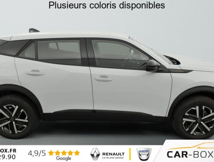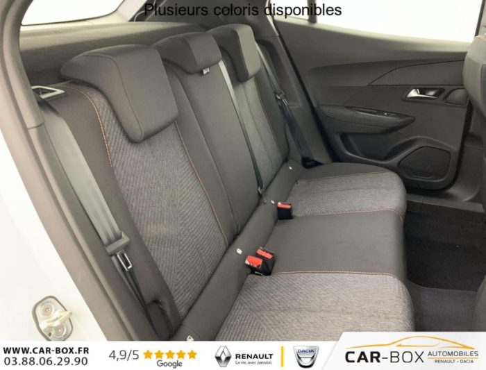 Habitacle et ciel de pavillon Noir, Teintes métallisées : option incluse (valeur : 0 Eur TTC), Canule d'échappement non chromée, Rétroviseur intérieur à réglage jour/nuit manuel, Siège conducteur avec réglage manuel en hauteur, Banquette rabattable 1/3 - 2/3, Air conditionné automatique monozone, Rétroviseurs extérieurs dégivrants avec réglage et rabattement électriques, Peugeot Connect SOS , Jantes tôle 16" avec enjoliveurs, ESP Déconnectable avec aide au démarrage en pente et détection de sous gonflage indirecte, Aide au stationnement AR, graphique et sonore, Volant compact en croûte de cuir avec commandes multimédia intégrées, Console basse avec frein de stationnement mécanique, Eclairage intérieur: Plafonnier AV A-DOME 3 ampoules (1 lampe, 2 liseuses), Eclairage de coffre à lampe, Touch screen 10" & Bluetooth Radio & Telephone: Radio DAB avec écran tactile couleur 10" SD, Bluetooth, Mirror Screen sans fil (Apple CarPlay / Android Auto), Ecran avec Toggles Switches , Peugeot i-Cockpit avec combiné tête haute analogique 3,5" TFT, Projecteurs Peugeot LED Technology avec feux diurnes à LED 3 griffes, Fixations ISOFIX et Top Tether aux places latérales AR, Pack Visibilité : Allumage automatique des feux de croisement Eclairage extérieur d'accueil et d'accompagnement Essuie-vitre AV à déclenchement automatique, 6 Airbags (Frontaux auto-adaptatifs, latéraux AV et rideaux AV/AR), Plancher de coffre standard, Kit de dépannage de pneumatique: compresseur 12V avec cartouche de produit de colmatage : option incluse (valeur : 20 Eur TTC), Sellerie tissu RENZO, accompagnement Rimini, surpiqûres Orange Sunrise, Pack Navigation & Visiopark 1: Visiopark 1: Caméra de recul HD, aide au stationnement AR graphique et sonore Pack Navigation - Peugeot i-Connect Advanced: Navigation 3D connectée (cartographie Europe) avec écran tactile 10" HD : option incluse (valeur : 800 Eur TTC), Contrôle de traction, Pack Safety : Alerte attention conducteur Régulateur / Limiteur de vitesse Reconnaissance étendue des panneaux de signalisation et préconisation de vitesse Alerte active de franchissement involontaire de ligne et bas côté Freinage automatique d'urgence avec alerte risque collision, détection élargie (3 caméras haut de pare-brise) et protection des usagers de la route vulnérables (piétons, cyclistes,...), Verrouillage centralisé, Lève-vitres AV/AR électriques