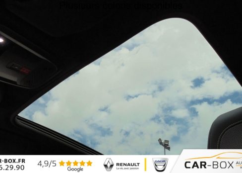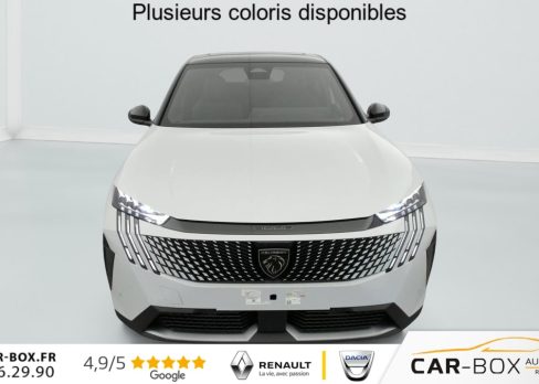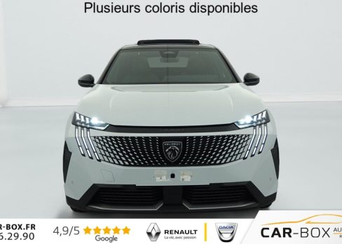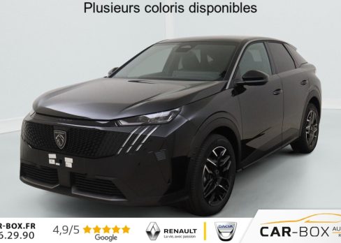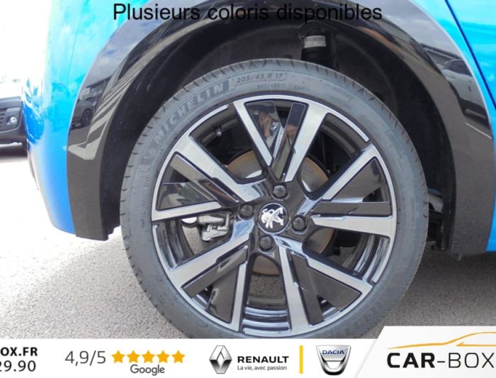 Acces et demarrage mains libres Proximity : option incluse (valeur : 350 Eur TTC), Aide graphique et sonore au stationnement arriere, Aide graphique et sonore au stationnement avant, Air conditionne automatique mono-zone, Airbags frontaux, lateraux avant et rideaux, Allumage automatique des feux de croisement, Avertisseur de temps de conduite, Bandeau entre feux arriere noir brillant, Banquette arriere rabattable 1/3-2/3, Cable de charge rapide , Calandre haut de gamme avec grille superieure avec marquage couleur caisse et enjoliveur superieur, Chargeur embarque 11 kW triphase : option incluse (valeur : 400 Eur TTC), Commutation automatique des feux de route / feux de croisement, Console haute avec accoudoir integre, Coques de retroviseurs exterieurs Noir Brillant, Decor panneaux de portes Noir , Demarrage mains libres avec 2 telecommandes 3 boutons, Detection de sous-gonflage indirecte, Direction assistee electrique, Drive mode , Eclairage coffre a lampe, Eclairage interieur a LED : plafonniers tactiles AV (1 lampe et 2 liseuses) et AR (2 liseuses),, Essuie-vitre avant a declenchement automatique, Feux arriere a LED, Feux diurnes a LED sous projecteurs, Fixations suivant norme Isofix aux places laterales AR et passager , Fonction Bluetooth, Fonction DAB (Radio Numerique Terrestre), Fonction ''Mirror Screen'' (Apple CarPlay / Android Auto ), Frein de stationnement electrique avec aide au demarrage en pente et serrage automatique, Habitacle et ciel de pavillon noir, Jantes alliage 17'' Bronx, Jupes de pare-chocs arriere inferieure et superieure Noir brillant, Kit de depannage de pneumatique, Lecheurs de vitres laterales Noir Brillant, Leve-vitres arriere electriques et sequentiels avec antipincement, Leve-vitres avant electriques et sequentiels avec antipincement, Monogramme exterieur GT sur volet de coffre, Navigation 3D connectee avec reconnaissance vocale, ecran tactile capacitif 7'', Pack Drive Assist Plus (Aide au maintien de la position dans la voie (conduite semi-autonome)) : option incluse (valeur : 900 Eur TTC), Pack Safety (Alerte active de franchissement involontaire de ligne et bas cote, Alerte attention conducteur par camera, Freinage d'urgence automatique (Active Safety Brake) avec alerte risque de collision (Distance Alert)), Pares-soleil avec miroirs de courtoisie eclaires, Passages de roue Noir brillant, Pedalier aluminium, PEUGEOT Connect SOS & Assistance et Telemaintenance, Planche de bord slush et panneaux de portes avant avec decors aspect carbone, Prise 12V avant , Programme de Stabilite Electronique (ESC) avec ASR, ABS, REF, AFU, CDS et TSM, Projecteurs ''Peugeot Full LED Technology'' avec signature 3 griffes, Radio avec ecran tactile 7'' couleur capacitif, 2 prises USB (DATA type A, recharge type C), Reconnaissance etendue des panneaux de signalisation et preconisation de vitesse, Regulateur / Limiteur de vitesse, Retroviseur interieur photosensible frameless, Retroviseurs exterieurs degivrants avec reglage et rabattement electriques, Seuil de portes lettrage ''PEUGEOT'', Siege conducteur avec reglage manuel en hauteur, Siege passager avant a reglage manuel en hauteur , Sieges AV chauffants : option incluse (valeur : 200 Eur TTC), Systeme de surveillance d'angle mort : option incluse (valeur : 100 Eur TTC), Systeme Start & Stop, Toit panoramique avec velum interieur a commande mecanique : option incluse (valeur : 550 Eur TTC), Verrouillage automatique de tous les ouvrants en roulant, Visio Park 1: Camera de recul, Vitres arriere surteintees, Volant compact cuir fleur avec lacage vert, Lion chrome et badge GT et commandes multimedia , Volant reglable en hauteur et en profondeur, 2 prises USB-A arriere de charge