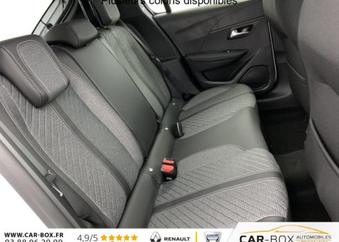 Sièges AV chauffants : option incluse (valeur : 250 Eur TTC), Aide graphique et sonore au stationnement AV et AR, Détection de sous-gonflage indirecte, Banquette AR rabattable 1/3-2/3, Verrouillage automatique de tous les ouvrants en roulant, Essuie-vitre AV à déclenchement automatique, Lève-vitres AR électriques et séquentiels avec antipincement, Teintes métallisées : option incluse (valeur : 700 Eur TTC), Ceintures de sécurité AV conducteur et passager à enrouleurs pyrotechniques avec limiteurs d'effort et détection de non bouclage, Ceinture de sécurité AR centrale 3 points, avec détection de non bouclage, Ceintures de sécurité AR latérales avec enrouleurs pyrotechniques, limiteurs d'effort et détection de non bouclage, Programme de Stabilité Electronique (ESC) avec ASR, ABS, REF, AFU, CDS et TSM, Coques de rétroviseurs extérieurs Noir Brillant, Eclairage coffre à lampe, Télécommande 3 boutons + clé standard, 6 HPs (2 tweeters et 2 woofers à l'AV et 2 HPs à l'AR), Vitres latérales AR et lunette AR chauffante temporisée surteintées, Air conditionné automatique mono-zone, Pare-brise teinté, Rétroviseurs extérieurs dégivrants avec réglage et rabattement électriques, Peugeot Connect SOS , Sellerie tissu CASUAL LOMSA embossé, accompagnement TEP Isabella, trimatière LOMSA et surpiqûres Quartz, Volant compact en croûte de cuir avec commandes multimédia intégrées, Console haute avec accoudoir & frein de stationnement électrique 1 prise USB type C (Charge) et 1 prise USB type A (Charge) pour passagers AR, Sélecteur de mode de conduite Normal/Eco/Sport, Peugeot i-Cockpit avec combiné tête haute 10" numérique, Projecteurs Peugeot LED Technology avec feux diurnes à LED 3 griffes, Jantes alliage 16" diamantées NOMA bi--ton vernis brillant et Noir Orbital, Appuis-tête réglables en hauteur AV (x2) et AR (x3), Fixations ISOFIX et Top Tether aux places latérales AR, Habitacle et ciel de pavillon clair, ESP Déconnectable avec aide au démarrage en pente, 3 poignées de maintien rétractables (1passager à l'AV et 2 à l'AR), Feux AR signature 3 griffes, stop à LEDs, recul et indicateur de direction à lampe, Antenne requin, Accoudoirs sur portes AV et AR en TEP avec surpiqûre Quartz, Calandre haute de gamme noir grainée avec marquage couleur caisse, Commande d'ouverture des portes couleur caisse, Becquet rapporté Noir Brillant, 6 Airbags (Frontaux auto-adaptatifs, latéraux AV et rideaux AV/AR), Pack Visibilité : Allumage automatique des feux de croisement, Eclairage intérieur Plafonnier AV A-DOME 3 ampoules (1 lampe, 2 liseuses AV), Pack Vision & Navigation : Peugeot i Connect Advanced Navigation 3D connectée (cartographie Europe) avec écran tactile 10" HD Reconnaissance vocale en langage naturel Services de navigation connectée TomTom (TomTom Traffic, prix carburant, parkings, météo, recherche Locale) Peugeot Connect SOS Visiopark 2: Caméras AV et de recul HD avec restitution sur l'écran tactile d'une vue AV ou AR, et d'une vue de dessus de l'environnement AR du véhicule sur 360° Rétroviseurs extérieurs avec éclairage d'accueil à LED et témoins de surveillance d'angles morts : option incluse (valeur : 800 Eur TTC), Rétroviseur intérieur électrochrome, Boîte de vitesse automatique, séquentielle (6 rapports), Pack Safety : Alerte attention conducteur Régulateur / Limiteur de vitesse Reconnaissance étendue des panneaux de signalisation et préconisation de vitesse Alerte active de franchissement involontaire de ligne et bas côté Freinage d'urgence automatique avec alerte risque de collision Freinage automatique d'urgence avec détection élargie (3 caméras haut de pare-brise) et protection des usagers de la route vulnérables (piétons, cyclistes,...), Peugeot i-Connect: Radio DAB avec écran tactile couleur personnalisable 10" HD, Bluetooth - Mirror Screen sans fil (Apple CarPlay/Android Auto) - Wifi - 1 prise USB type C ( Data+charge), 1 prise USB type C (Charge) sur console AV - 1 prise USB type C (Charge) et 1 prise USB type A (Charge) pour passagers AR, Vitres AV électriques, Volant réglable en hauteur et en profondeur, Direction assistée électrique, Lève-vitres AV électriques et séquentiels avec antipincement