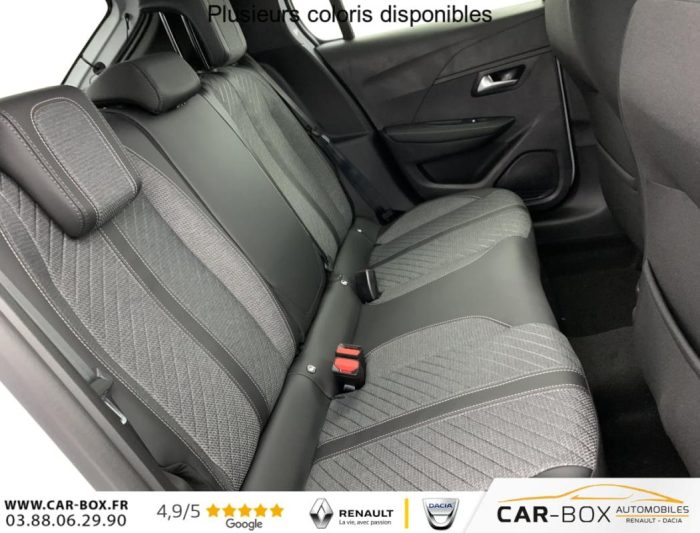 Sièges AV chauffants : option incluse (valeur : 250 Eur TTC), Aide graphique et sonore au stationnement AV et AR, Détection de sous-gonflage indirecte, Banquette AR rabattable 1/3-2/3, Verrouillage automatique de tous les ouvrants en roulant, Essuie-vitre AV à déclenchement automatique, Lève-vitres AR électriques et séquentiels avec antipincement, Teintes métallisées : option incluse (valeur : 700 Eur TTC), Ceintures de sécurité AV conducteur et passager à enrouleurs pyrotechniques avec limiteurs d'effort et détection de non bouclage, Ceinture de sécurité AR centrale 3 points, avec détection de non bouclage, Ceintures de sécurité AR latérales avec enrouleurs pyrotechniques, limiteurs d'effort et détection de non bouclage, Programme de Stabilité Electronique (ESC) avec ASR, ABS, REF, AFU, CDS et TSM, Coques de rétroviseurs extérieurs Noir Brillant, Eclairage coffre à lampe, Télécommande 3 boutons + clé standard, 6 HPs (2 tweeters et 2 woofers à l'AV et 2 HPs à l'AR), Vitres latérales AR et lunette AR chauffante temporisée surteintées, Air conditionné automatique mono-zone, Pare-brise teinté, Rétroviseurs extérieurs dégivrants avec réglage et rabattement électriques, Peugeot Connect SOS , Sellerie tissu CASUAL LOMSA embossé, accompagnement TEP Isabella, trimatière LOMSA et surpiqûres Quartz, Volant compact en croûte de cuir avec commandes multimédia intégrées, Console haute avec accoudoir & frein de stationnement électrique 1 prise USB type C (Charge) et 1 prise USB type A (Charge) pour passagers AR, Sélecteur de mode de conduite Normal/Eco/Sport, Peugeot i-Cockpit avec combiné tête haute 10" numérique, Projecteurs Peugeot LED Technology avec feux diurnes à LED 3 griffes, Jantes alliage 16" diamantées NOMA bi--ton vernis brillant et Noir Orbital, Appuis-tête réglables en hauteur AV (x2) et AR (x3), Fixations ISOFIX et Top Tether aux places latérales AR, Habitacle et ciel de pavillon clair, ESP Déconnectable avec aide au démarrage en pente, 3 poignées de maintien rétractables (1passager à l'AV et 2 à l'AR), Feux AR signature 3 griffes, stop à LEDs, recul et indicateur de direction à lampe, Antenne requin, Accoudoirs sur portes AV et AR en TEP avec surpiqûre Quartz, Calandre haute de gamme noir grainée avec marquage couleur caisse, Commande d'ouverture des portes couleur caisse, Becquet rapporté Noir Brillant, 6 Airbags (Frontaux auto-adaptatifs, latéraux AV et rideaux AV/AR), Pack Visibilité : Allumage automatique des feux de croisement, Eclairage intérieur Plafonnier AV A-DOME 3 ampoules (1 lampe, 2 liseuses AV), Pack Vision & Navigation : Peugeot i Connect Advanced Navigation 3D connectée (cartographie Europe) avec écran tactile 10" HD Reconnaissance vocale en langage naturel Services de navigation connectée TomTom (TomTom Traffic, prix carburant, parkings, météo, recherche Locale) Peugeot Connect SOS Visiopark 2: Caméras AV et de recul HD avec restitution sur l'écran tactile d'une vue AV ou AR, et d'une vue de dessus de l'environnement AR du véhicule sur 360° Rétroviseurs extérieurs avec éclairage d'accueil à LED et témoins de surveillance d'angles morts : option incluse (valeur : 800 Eur TTC), Rétroviseur intérieur électrochrome, Boîte de vitesse automatique, séquentielle (6 rapports), Pack Safety : Alerte attention conducteur Régulateur / Limiteur de vitesse Reconnaissance étendue des panneaux de signalisation et préconisation de vitesse Alerte active de franchissement involontaire de ligne et bas côté Freinage d'urgence automatique avec alerte risque de collision Freinage automatique d'urgence avec détection élargie (3 caméras haut de pare-brise) et protection des usagers de la route vulnérables (piétons, cyclistes,...), Peugeot i-Connect: Radio DAB avec écran tactile couleur personnalisable 10" HD, Bluetooth - Mirror Screen sans fil (Apple CarPlay/Android Auto) - Wifi - 1 prise USB type C ( Data+charge), 1 prise USB type C (Charge) sur console AV - 1 prise USB type C (Charge) et 1 prise USB type A (Charge) pour passagers AR, Vitres AV électriques, Volant réglable en hauteur et en profondeur, Direction assistée électrique, Lève-vitres AV électriques et séquentiels avec antipincement