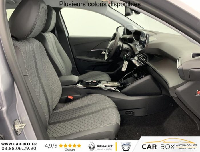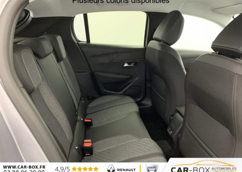 Prolongation de la garantie constructeur de 24 à 36 Mois : option incluse (valeur : 550 Eur TTC), Détection de sous-gonflage indirecte, Banquette AR rabattable 1/3-2/3, Verrouillage automatique de tous les ouvrants en roulant, Essuie-vitre AV à déclenchement automatique, Lève-vitres AR électriques et séquentiels avec antipincement, Teintes métallisées : option incluse (valeur : 700 Eur TTC), Ceintures de sécurité AV conducteur et passager à enrouleurs pyrotechniques avec limiteurs d'effort et détection de non bouclage, Ceinture de sécurité AR centrale 3 points, avec détection de non bouclage, Ceintures de sécurité AR latérales avec enrouleurs pyrotechniques, limiteurs d'effort et détection de non bouclage, Programme de Stabilité Electronique (ESC) avec ASR, ABS, REF, AFU, CDS et TSM, Coques de rétroviseurs extérieurs Noir Brillant, Siège conducteur avec réglage manuel en hauteur, Eclairage coffre à lampe, Télécommande 3 boutons + clé standard, 6 HPs (2 tweeters et 2 woofers à l'AV et 2 HPs à l'AR), Vitres latérales AR et lunette AR chauffante temporisée surteintées, Air conditionné automatique mono-zone, Pare-brise teinté, Rétroviseurs extérieurs dégivrants avec réglage et rabattement électriques, Peugeot Connect SOS & Assistance et Teleservices SOS & Assistance : Appel d'urgence automatique ou manuel par push SOS, et mise en relation directe avec la plateforme d'assistance PEUGEOT (24h/24 7j/7) , Teleservices : Détection du besoin d'une intervention technique ou d'une opération d'entretien périodique et transmission au réseau PEUGEOT pour prise de rendez vous, Sellerie tissu CASUAL LOMSA embossé, accompagnement TEP Isabella, trimatière LOMSA et surpiqûres Quartz, Volant compact en croûte de cuir avec commandes multimédia intégrées, Console haute avec accoudoir & frein de stationnement électrique 1 prise USB type C (Charge) et 1 prise USB type A (Charge) pour passagers AR, Sélecteur de mode de conduite Normal/Eco/Sport, Peugeot i-Cockpit avec combiné tête haute 10" numérique, Projecteurs Peugeot LED Technology avec feux diurnes à LED 3 griffes, Jantes alliage 16" diamantées NOMA bi--ton vernis brillant et Noir Orbital, Appuis-tête réglables en hauteur AV (x2) et AR (x3), Fixations ISOFIX et Top Tether aux places latérales AR, Habitacle et ciel de pavillon clair, Jupes AR supérieure Noir brillant, Jupes AR inférieure noir grainé, Essuyage automatique, ESP Déconnectable avec aide au démarrage en pente, 3 poignées de maintien rétractables (1passager à l'AV et 2 à l'AR), Feux AR signature 3 griffes, stop à LEDs, recul et indicateur de direction à lampe, Antenne requin, Accoudoirs sur portes AV et AR en TEP avec surpiqûre Quartz, Prise 12V et rangement pour smartphone en façade centrale, Enjoliveur DRL Noir grainé, Enjoliveur bas de calandre noir grainé, Enjoliveur supérieur de calandre Noir grainé, Commande d'ouverture des portes couleur caisse, Lécheurs de vitres Noir mat, Enjoliveur entre feux AR noir brillant, Becquet rapporté Noir Brillant, 6 Airbags (Frontaux auto-adaptatifs, latéraux AV et rideaux AV/AR), Pack Visibilité Allumage automatique des feux de croisement : Allumage automatique des feux de croisement, Eclairage intérieur Plafonnier AV A-DOME 3 ampoules (1 lampe, 2 liseuses AV), Pack Vision & Navigation Peugeot i Connect Advanced, Navigation 3D connectée (cartographie Europe) avec écran tactile 10" HD, Reconnaissance vocale en langage naturel, Services de navigation connectée TomTom (TomTom Traffic, prix carburant, parkings, météo, recherche Locale) et Alertes zones de danger - essai gratuit pendant 6 mois, Peugeot Connect SOS & Assistance et Téléservices, Visiopark 2, Caméras AV et de recul HD, Rétroviseurs ext. avec éclairage d'accueil à LED et témoins de surveillance d'angles morts : Rétroviseurs extérieurs avec éclairage d'accueil à LED et témoins de surveillance d'angles morts Peugeot i-Connect Advanced Navigation 3D connectée (cartographie Europe) avec écran tactile 10" HD, Reconnaissance vocale en langage naturel, Services de navigation connectée TomTom (TomTom Traffic, prix carburant, parkings, météo, recherche Locale) et Alertes zones de danger avec essai gratuit pendant 6 mois inclus, Peugeot Connect SOS & Assistance et Teleservices Visiopark 2: Caméras AV et de recul HD avec restitution sur l'écran tactile d'une vue AV ou AR, et d'une vue de dessus de l'environnement AR du véhicule sur 360° : option incluse (valeur : 800 Eur TTC), Panneaux de portes AR injectés grain Karsten sans baguette, Planche de bord Slush avec Décor Carbone slush et baguette Noir brillante avec jonc Chromé, Panneaux de porte AV avec médaillon décor Carbone injecté et baguette Noir brillante avec tampographie Quartz, Kit de dépannage de pneumatique : option incluse (valeur : 20 Eur TTC), Rétroviseur intérieur électrochrome, Boîte de vitesse automatique, séquentielle (6 rapports), Pack Safety Régulateur / Limiteur de vitesse, Freinage d'urgence automatique avec alerte risque de collision, Freinage automatique d'urgence avec détection élargie (3 caméras haut de pare-brise) et protection des usagers de la route vulnérables (piétons, cyclistes,), Alerte active de franchissement involontaire de ligne et bas côté, Reconnaissance étendue des panneaux de signalisation et préconisation de vitesse, Alerte attention conducteur : Alerte attention conducteur Régulateur / Limiteur de vitesse Reconnaissance étendue des panneaux de signalisation et préconisation de vitesse Alerte active de franchissement involontaire de ligne et bas côté Freinage d'urgence automatique avec alerte risque de collision Freinage automatique d'urgence avec détection élargie (3 caméras haut de pare-brise) et protection des usagers de la route vulnérables (piétons, cyclistes,...), Intervalle de maintenance 25 000 km ou 1 an, Peugeot i-Connect: Radio DAB avec écran tactile couleur personnalisabl