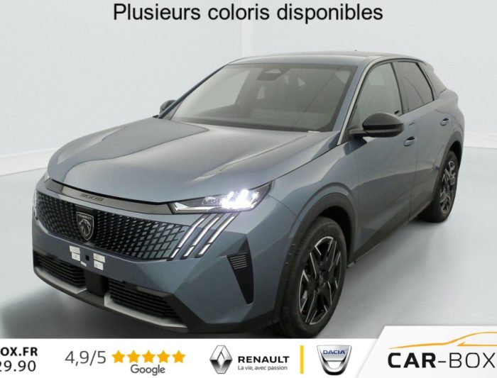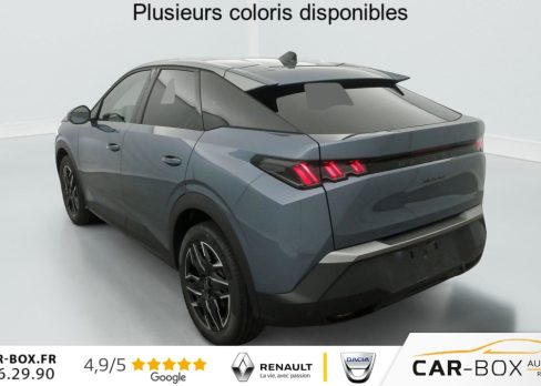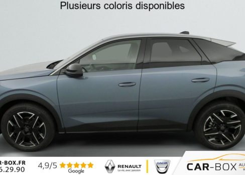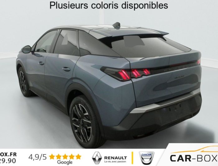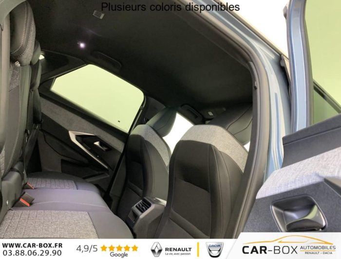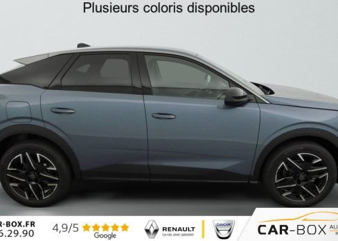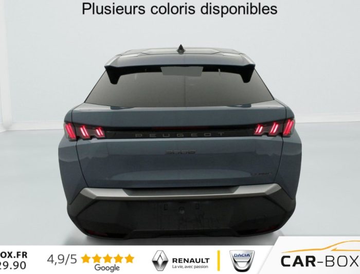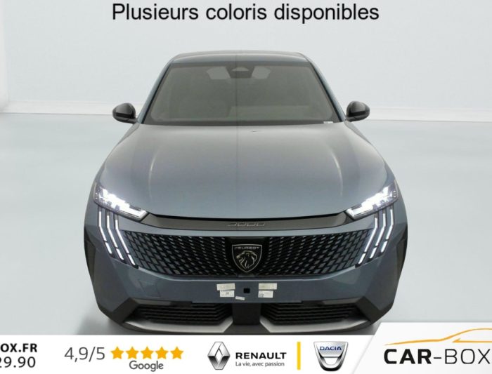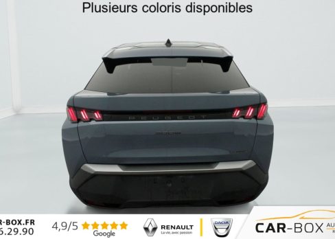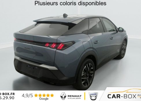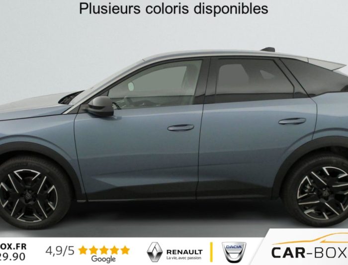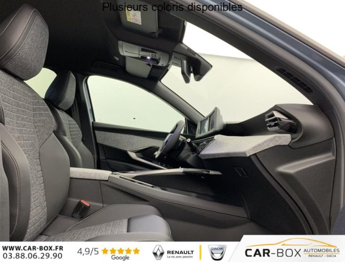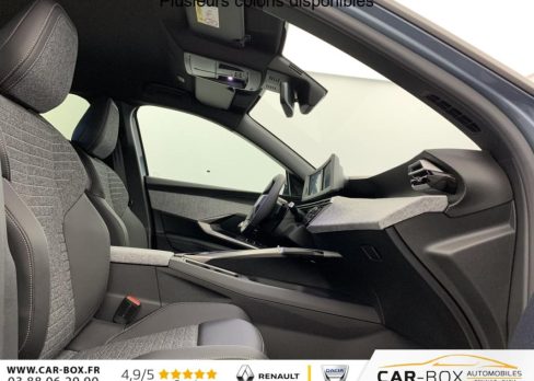 Sièges AV chauffants : option incluse (valeur : 250 Eur TTC), Frein de stationnement électrique, ESP avec aide au démarrage en pente, ABS, Détection de sous-gonflage indirecte, Direction assistée, Teintes métallisées : option incluse (valeur : 1 200 Eur TTC), 6 HP (2 tweeters et 2 woofers à l'AV et 2 larges bandes à l'AR), Rétroviseurs extérieurs dégivrants avec réglage et rabattement électriques, éclairage de seuil, Allumage automatique des phares, Pack Safety Plus : Alerte attention conducteur Régulateur / Limiteur de vitesse Reconnaissance étendue des panneaux de signalisation et préconisation de vitesse Alerte active de franchissement involontaire de ligne et bas côté Freinage d'urgence automatique avec alerte risque de collision pilotée par caméra et radar, Fixations ISOFIX et Top Tether aux places latérales AR, Feux AR 3 griffes à LED, Jantes alliage 19" diamantées BREDA Noir Orbital, vernis brillant, 6 airbags: frontaux conducteur et passager auto-adaptatifs (passager neutralisable par clé), latéraux conducteur et passager AV (thorax et bassin), rideaux aux places AV et AR (tête et thorax), Feux diurnes 3 griffes à LED, Visiopark 1 Caméra de recul & aide au stationnement AR, graphique et sonore, Accès et démarrage mains libres Proximity 2 Télécommandes 3 boutons (verrouillage, coffre, déverrouillage), Eclairage intérieur Plafonnier AV et liseuses AR à LED, Boite à gants et rangement de console éclairés à LED, Eclairage des caves à pieds AV à LED, PEUGEOT i-Cockpit panoramique avec Double écran HD flottant (2 x 10''), Banquette AR avec dossier rabattable 40/20/40, PEUGEOT i-Connect Radio DAB, Bluetooth (connexion 2 téléphones), Mirror Screen sans fil (Apple CarPlay / Android Auto), Peugeot Connect SOS & Assistance, 1 prise USB C (Data & charge), Projecteurs "Peugeot Led Technology", Sellerie tissu CRISPY embossé, accompagnement TEP Isabella, écharpe tissu RIMINI chiné, surpiqûres Quartz, Rétroviseur intérieur électrochrome, Contrôle de traction, Boîte de vitesse automatique, séquentielle (6 rapports), Air conditionné automatique bi-zone, Lève-vitres AV et AR électriques séquentiels avec antipincement