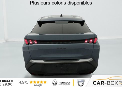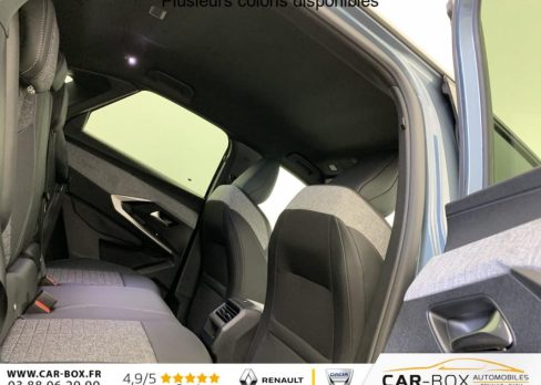 Sièges AV chauffants : option incluse (valeur : 250 Eur TTC), Frein de stationnement électrique, ESP avec aide au démarrage en pente, ABS, Détection de sous-gonflage indirecte, Direction assistée, Teintes métallisées : option incluse (valeur : 1 200 Eur TTC), 6 HP (2 tweeters et 2 woofers à l'AV et 2 larges bandes à l'AR), Rétroviseurs extérieurs dégivrants avec réglage et rabattement électriques, éclairage de seuil, Allumage automatique des phares, Pack Safety Plus : Alerte attention conducteur Régulateur / Limiteur de vitesse Reconnaissance étendue des panneaux de signalisation et préconisation de vitesse Alerte active de franchissement involontaire de ligne et bas côté Freinage d'urgence automatique avec alerte risque de collision pilotée par caméra et radar, Fixations ISOFIX et Top Tether aux places latérales AR, Feux AR 3 griffes à LED, Jantes alliage 19" diamantées BREDA Noir Orbital, vernis brillant, 6 airbags: frontaux conducteur et passager auto-adaptatifs (passager neutralisable par clé), latéraux conducteur et passager AV (thorax et bassin), rideaux aux places AV et AR (tête et thorax), Feux diurnes 3 griffes à LED, Visiopark 1 Caméra de recul & aide au stationnement AR, graphique et sonore, Accès et démarrage mains libres Proximity 2 Télécommandes 3 boutons (verrouillage, coffre, déverrouillage), Eclairage intérieur Plafonnier AV et liseuses AR à LED, Boite à gants et rangement de console éclairés à LED, Eclairage des caves à pieds AV à LED, PEUGEOT i-Cockpit panoramique avec Double écran HD flottant (2 x 10''), Banquette AR avec dossier rabattable 40/20/40, PEUGEOT i-Connect Radio DAB, Bluetooth (connexion 2 téléphones), Mirror Screen sans fil (Apple CarPlay / Android Auto), Peugeot Connect SOS & Assistance, 1 prise USB C (Data & charge), Projecteurs "Peugeot Led Technology", Sellerie tissu CRISPY embossé, accompagnement TEP Isabella, écharpe tissu RIMINI chiné, surpiqûres Quartz, Rétroviseur intérieur électrochrome, Contrôle de traction, Boîte de vitesse automatique, séquentielle (6 rapports), Air conditionné automatique bi-zone, Lève-vitres AV et AR électriques séquentiels avec antipincement