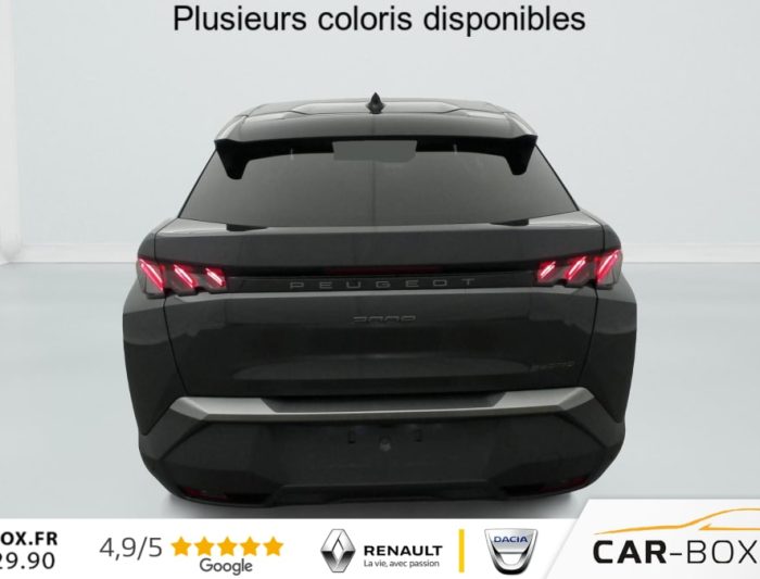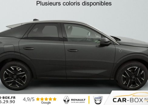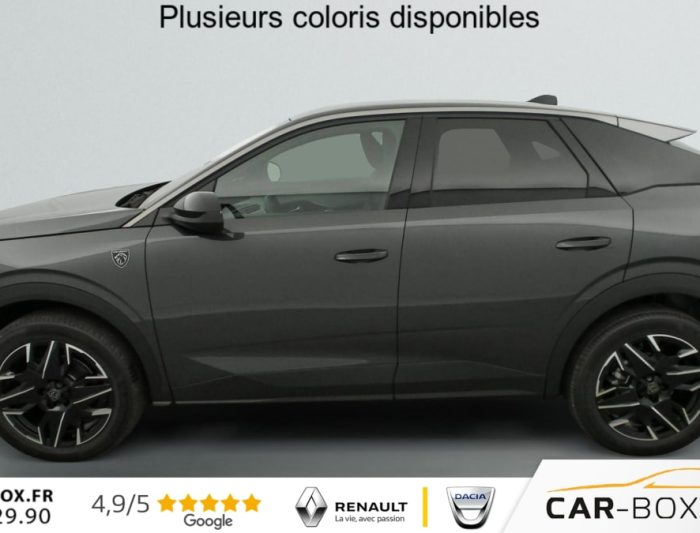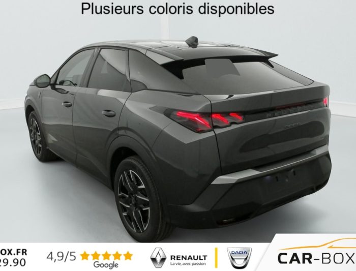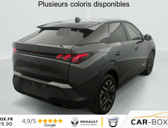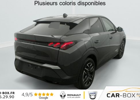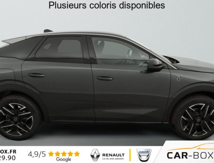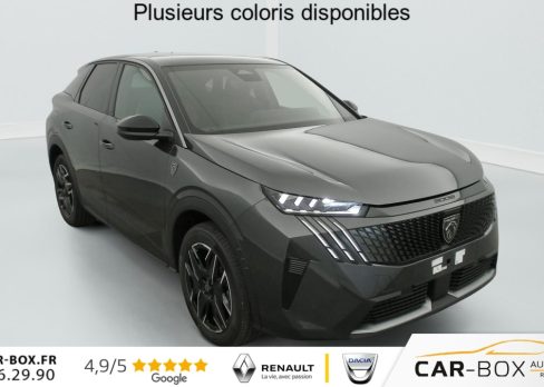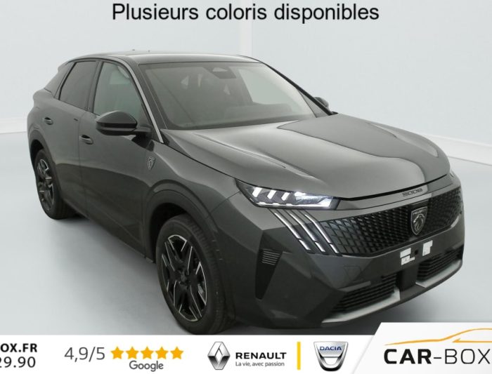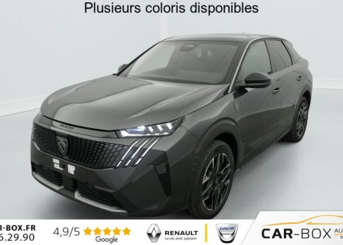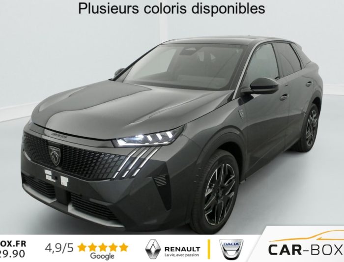 Hors frais de dossierHybrid 145 e-DCS6 GT, hybride, gris, 29/08/2025, Véhicule livré sans Kit anti crevaison ni roue de secours, Frein de stationnement électrique, ESP avec aide au démarrage en pente, ABS, Détection de sous-gonflage indirecte, Commutation automatique des feux de route, Essuie-vitre AV à déclenchement automatique, Habitacle et ciel de pavillon Noir, Direction assistée, Accoudoir central, Teintes métallisées : option incluse (valeur : 1 200 Eur TTC), 6 HP (2 tweeters et 2 woofers à l’AV et 2 larges bandes à l’AR), Rétroviseurs extérieurs dégivrants avec réglage et rabattement électriques, éclairage de seuil, Allumage automatique des phares, Hayon motorisé avec accès mains libres, Pédalier et repose pied aluminium, Plancher de coffre modulable 2 positions, Fixations ISOFIX et Top Tether aux places latérales AR, 4 poignées de maintien rétractables (2 à l’AV et 2 à l’AR), Volant chauffant, Sièges AV chauffants, Drive Assist – Régulateur de vitesse adaptatif avec fonction Stop & Go, PEUGEOT i-Toggles virtuels avec 10 raccourcis personnalisables, PEUGEOT i-Connect Advanced Navigation 3D connectée, 4 prises USB: 1 prise USB C (Data & charge) et 1 prise USB C (Charge) à l’AV, 2 prises USB C (Charge) à l’AR, Jantes alliage 19" diamantées Lulea Noir Orbital, vernis brillant, 6 airbags: frontaux conducteur et passager auto-adaptatifs (passager neutralisable par clé), latéraux conducteur et passager AV (thorax et bassin), rideaux aux places AV et AR (tête et thorax), Feux diurnes 3 griffes à LED, Visiopark 1 Caméra de recul & aide au stationnement AV et AR, graphique et sonore, Monogrammes AV: blason PEUGEOT et 3008, Monogrammes AR 3008 et Hybrid, Accès et démarrage mains libres Proximity, Banquette AR avec dossier rabattable 40/20/40, Feux AR 3 griffes à LED 3D, Projecteurs PEUGEOT PIXEL LED Eclairage adaptatif, commutation automatique des feux de route, feux de route avec fonctions anti éblouissement et boost, Monogrammes ailes AV: ‘blason PEUGEOT’, Toit et becquet AR Black Diamond, Eléments de style intérieure Planche de bord moussée avec décor tissu RIMINI chiné, décor d’alcôve en Aluminium sérigraphié, façade et aérateurs Noir laqué avec décor Cast Iron, Panneaux de portes avec décor tissu RIMINI chiné, décor d’alcôve en Aluminium sérigraphié et jonc Cast Iron, accoudoirs TEP Isabella, surpiqûres Iced Clay à l’ AV, Console centrale avec décor tissu RIMINI chiné, façade Noir laqué et jonc Cast Iron, accoudoir tissu RIMINI chiné, Eclairage d’ambiance indirect, jour & nuit sur la planche de bord, les panneaux de portes AV et sous l’écran panoramique 21 », associé aux modes de conduite, personnalisable en 8 couleurs, Seuil de portes AV inox avec lettrage PEUGEOT, Volant compact, cuir fleur lisse et perforé avec commandes intégrées Noir Laqué, décors Cast Iron, surpiqûres Iced Clay, insert Noir laqué avec badge ‘GT’, Commutation adaptative des projecteurs, Eléments de style éxterieur Bandeau entre les projecteurs Noir laqué avec logo 3008. Calandre couleur caisse, écopes latérales Noir laqué, décor inférieur Gris Meteor, jupe inférieure Noir grainé. Vitres AR, vitres de custode et lunette AR surteintées. Lécheurs de vitres masqués. Enjoliveurs de passages de roues et protections inférieures de portes Noir grainé. Bandeau entre les feux AR Noir laqué avec lettrage PEUGEOT. Pare chocs AR avec décor Gris Meteor et jupe inférieure Noir grainé, Monogrammes AV et AR, PEUGEOT i-Cockpit panoramique avec écran incurvé et flottant 21 » HD, Sièges AV à réglage en hauteur manuel, Sellerie tissu NEW UZIRIS embossé, accompagnement TEP Isabella, écharpe tissu RIMINI chiné, surpiqûres Iced Clay, 2 prises 12 V (Console centrale, coffre), Contrôle de traction, Boîte de vitesse automatique, séquentielle (6 rapports), Eclairage intérieur Miroirs de courtoisie conducteur et passager occultables éclairés à LED, Pack Safety Plus Régulateur / Limiteur de vitesse, Freinage d’urgence automatique avec alerte risque de collision et protection des usagers de la route vulnérables (piétons, cyclistes, … ) Alerte active de franchissement involontaire de ligne et bas côté, Reconnaissance étendue des panneaux de signalisation et préconisation de vitesse, Alerte attention conducteur : Alerte attention conducteur Régulateur / Limiteur de vitesse Reconnaissance étendue des panneaux de signalisation et préconisation de vitesse Alerte active de franchissement involontaire de ligne et bas côté Freinage d’urgence automatique avec alerte risque de collision pilotée par caméra et radar, PEUGEOT i-Connect Advanced – Connect Plus: Reconnaissance vocale connectée en langage naturel, ChatGPT (Disponibilité ultérieurement) Services de sécurité: alarme connectée (Si véhicule équipé de l’alarme, ) Services à distance (Remote Control, Find My Car, My Trip Report, Peugeot Skill for Alexa), Fonctions de Navigation (Trafic en temps réel, prévisions météorologiques, parking, recherche TomTom, limitations de vitesse, prix du carburant, mise à jour cartographie Over The Air, Send to Nav, Geofenci, Vitres AV électriques, Air conditionné automatique bi-zone, Pare-brise feuilleté acoustique, Lève-vitres AV/AR électriques et séquentiels avec antipincement, Siège conducteur à réglage lombaire manuel