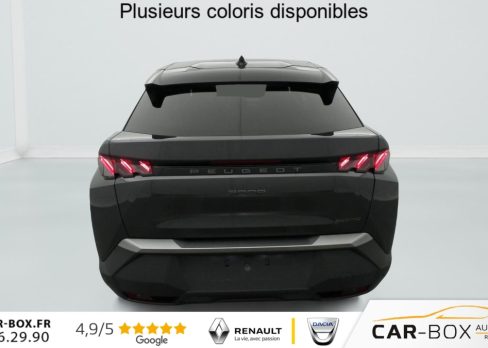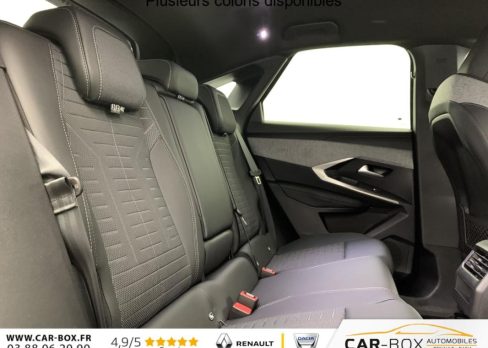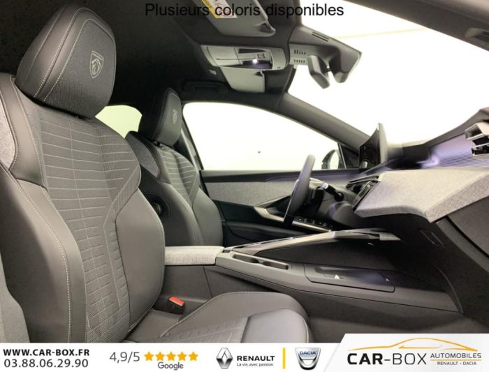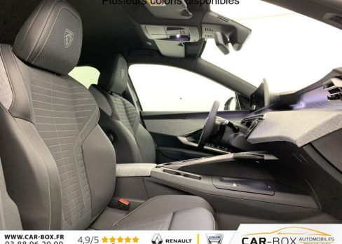 Véhicule livré sans Kit anti crevaison ni roue de secours, Frein de stationnement électrique, ESP avec aide au démarrage en pente, ABS, Détection de sous-gonflage indirecte, Commutation automatique des feux de route, Essuie-vitre AV à déclenchement automatique, Habitacle et ciel de pavillon Noir, Direction assistée, Accoudoir central, Teintes métallisées : option incluse (valeur : 1 200 Eur TTC), 6 HP (2 tweeters et 2 woofers à l'AV et 2 larges bandes à l'AR), Rétroviseurs extérieurs dégivrants avec réglage et rabattement électriques, éclairage de seuil, Allumage automatique des phares, Hayon motorisé avec accès mains libres, Pédalier et repose pied aluminium, Plancher de coffre modulable 2 positions, Fixations ISOFIX et Top Tether aux places latérales AR, 4 poignées de maintien rétractables (2 à l'AV et 2 à l'AR), Volant chauffant, Sièges AV chauffants, Drive Assist - Régulateur de vitesse adaptatif avec fonction Stop & Go, PEUGEOT i-Toggles virtuels avec 10 raccourcis personnalisables, PEUGEOT i-Connect Advanced Navigation 3D connectée, 4 prises USB: 1 prise USB C (Data & charge) et 1 prise USB C (Charge) à l'AV, 2 prises USB C (Charge) à l'AR, Jantes alliage 19" diamantées Lulea Noir Orbital, vernis brillant, 6 airbags: frontaux conducteur et passager auto-adaptatifs (passager neutralisable par clé), latéraux conducteur et passager AV (thorax et bassin), rideaux aux places AV et AR (tête et thorax), Feux diurnes 3 griffes à LED, Visiopark 1 Caméra de recul & aide au stationnement AV et AR, graphique et sonore, Monogrammes AV: blason PEUGEOT et 3008, Monogrammes AR 3008 et Hybrid, Accès et démarrage mains libres Proximity, Banquette AR avec dossier rabattable 40/20/40, Feux AR 3 griffes à LED 3D, Projecteurs PEUGEOT PIXEL LED Eclairage adaptatif, commutation automatique des feux de route, feux de route avec fonctions anti éblouissement et boost, Monogrammes ailes AV: 'blason PEUGEOT', Toit et becquet AR Black Diamond, Eléments de style intérieure Planche de bord moussée avec décor tissu RIMINI chiné, décor d'alcôve en Aluminium sérigraphié, façade et aérateurs Noir laqué avec décor Cast Iron, Panneaux de portes avec décor tissu RIMINI chiné, décor d'alcôve en Aluminium sérigraphié et jonc Cast Iron, accoudoirs TEP Isabella, surpiqûres Iced Clay à l' AV, Console centrale avec décor tissu RIMINI chiné, façade Noir laqué et jonc Cast Iron, accoudoir tissu RIMINI chiné, Eclairage d'ambiance indirect, jour & nuit sur la planche de bord, les panneaux de portes AV et sous l'écran panoramique 21'', associé aux modes de conduite, personnalisable en 8 couleurs, Seuil de portes AV inox avec lettrage PEUGEOT, Volant compact, cuir fleur lisse et perforé avec commandes intégrées Noir Laqué, décors Cast Iron, surpiqûres Iced Clay, insert Noir laqué avec badge ‘GT', Commutation adaptative des projecteurs, Eléments de style éxterieur Bandeau entre les projecteurs Noir laqué avec logo 3008. Calandre couleur caisse, écopes latérales Noir laqué, décor inférieur Gris Meteor, jupe inférieure Noir grainé. Vitres AR, vitres de custode et lunette AR surteintées. Lécheurs de vitres masqués. Enjoliveurs de passages de roues et protections inférieures de portes Noir grainé. Bandeau entre les feux AR Noir laqué avec lettrage PEUGEOT. Pare chocs AR avec décor Gris Meteor et jupe inférieure Noir grainé, Monogrammes AV et AR, PEUGEOT i-Cockpit panoramique avec écran incurvé et flottant 21'' HD, Sièges AV à réglage en hauteur manuel, Sellerie tissu NEW UZIRIS embossé, accompagnement TEP Isabella, écharpe tissu RIMINI chiné, surpiqûres Iced Clay, 2 prises 12 V (Console centrale, coffre), Contrôle de traction, Boîte de vitesse automatique, séquentielle (6 rapports), Eclairage intérieur Miroirs de courtoisie conducteur et passager occultables éclairés à LED, Pack Safety Plus Régulateur / Limiteur de vitesse, Freinage d'urgence automatique avec alerte risque de collision et protection des usagers de la route vulnérables (piétons, cyclistes,... ) Alerte active de franchissement involontaire de ligne et bas côté, Reconnaissance étendue des panneaux de signalisation et préconisation de vitesse, Alerte attention conducteur : Alerte attention conducteur Régulateur / Limiteur de vitesse Reconnaissance étendue des panneaux de signalisation et préconisation de vitesse Alerte active de franchissement involontaire de ligne et bas côté Freinage d'urgence automatique avec alerte risque de collision pilotée par caméra et radar, PEUGEOT i-Connect Advanced - Connect Plus: Reconnaissance vocale connectée en langage naturel, ChatGPT (Disponibilité ultérieurement) Services de sécurité: alarme connectée (Si véhicule équipé de l'alarme,) Services à distance (Remote Control, Find My Car, My Trip Report, Peugeot Skill for Alexa), Fonctions de Navigation (Trafic en temps réel, prévisions météorologiques,parking, recherche TomTom, limitations de vitesse, prix du carburant, mise à jour cartographie Over The Air, Send to Nav, Geofenci, Vitres AV électriques, Air conditionné automatique bi-zone, Pare-brise feuilleté acoustique, Lève-vitres AV/AR électriques et séquentiels avec antipincement, Siège conducteur à réglage lombaire manuel
