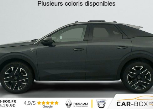 Grip control 4 modes (standard, boue, neige et sable) : option incluse (valeur : 300 Eur TTC), Pare-brise chauffant : option incluse (valeur : 100 Eur TTC), Frein de stationnement électrique, ESP avec aide au démarrage en pente, ABS, Détection de sous-gonflage indirecte, Commutation automatique des feux de route, Essuie-vitre AV à déclenchement automatique, Habitacle et ciel de pavillon Noir, Direction assistée, Accoudoir central, Teintes métallisées : option incluse (valeur : 1 200 Eur TTC), 6 HP (2 tweeters et 2 woofers à l'AV et 2 larges bandes à l'AR), Rétroviseurs extérieurs dégivrants avec réglage et rabattement électriques, éclairage de seuil, Allumage automatique des phares, Hayon motorisé avec accès mains libres, Pédalier et repose pied aluminium, Pack Safety Plus : Alerte attention conducteur Régulateur / Limiteur de vitesse Reconnaissance étendue des panneaux de signalisation et préconisation de vitesse Alerte active de franchissement involontaire de ligne et bas côté Freinage d'urgence automatique avec alerte risque de collision pilotée par caméra et radar, Plancher de coffre modulable 2 positions, Fixations ISOFIX et Top Tether aux places latérales AR, 4 poignées de maintien rétractables (2 à l'AV et 2 à l'AR), Volant chauffant, Sièges AV chauffants, Drive Assist - Régulateur de vitesse adaptatif avec fonction Stop & Go, Pack Hi-Fi Focal : Vitres latérales AV feuilletées acoustiques Système Hi Fi Premium FOCAL 10 HP (4 tweeters, 4 woofers, 1 voie centrale, 1 subwoofer) : option incluse (valeur : 850 Eur TTC), PEUGEOT i-Toggles virtuels avec 10 raccourcis personnalisables, PEUGEOT i-Connect Advanced Navigation 3D connectée, 4 prises USB: 1 prise USB C (Data & charge) et 1 prise USB C (Charge) à l'AV, 2 prises USB C (Charge) à l'AR, Jantes alliage 19" diamantées BREDA Noir Orbital, vernis brillant, 6 airbags: frontaux conducteur et passager auto-adaptatifs (passager neutralisable par clé), latéraux conducteur et passager AV (thorax et bassin), rideaux aux places AV et AR (tête et thorax), Feux diurnes 3 griffes à LED, Visiopark 1 Caméra de recul & aide au stationnement AV et AR, graphique et sonore, Monogrammes AV: blason PEUGEOT et 3008, Monogrammes AR 3008 et Hybrid, Accès et démarrage mains libres Proximity 2 Télécommandes 3 boutons (verrouillage, coffre, déverrouillage), Banquette AR avec dossier rabattable 40/20/40, Feux AR 3 griffes à LED 3D, Projecteurs PEUGEOT PIXEL LED Eclairage adaptatif, commutation automatique des feux de route, feux de route avec fonctions anti éblouissement et boost, Monogrammes ailes AV: 'blason PEUGEOT', Toit et becquet AR Black Diamond, Eléments de style intérieure Planche de bord moussée avec décor tissu RIMINI chiné, décor d'alcôve en Aluminium sérigraphié, façade et aérateurs Noir laqué avec décor Cast Iron, Panneaux de portes avec décor tissu RIMINI chiné, décor d'alcôve en Aluminium sérigraphié et jonc Cast Iron, accoudoirs TEP Isabella, surpiqûres Iced Clay à l' AV, Console centrale avec décor tissu RIMINI chiné, façade Noir laqué et jonc Cast Iron, accoudoir tissu RIMINI chiné, Eclairage d'ambiance indirect, jour & nuit sur la planche de bord, les panneaux de portes AV et sous l'écran panoramique 21'', associé aux modes de conduite, personnalisable en 8 couleurs, Seuil de portes AV inox avec lettrage PEUGEOT, Volant compact, cuir fleur lisse et perforé avec commandes intégrées Noir Laqué, décors Cast Iron, surpiqûres Iced Clay, insert Noir laqué avec badge ‘GT', Commutation adaptative des projecteurs, Eléments de style éxterieur Bandeau entre les projecteurs Noir laqué avec logo 3008. Calandre couleur caisse, écopes latérales Noir laqué, décor inférieur Gris Meteor, jupe inférieure Noir grainé. Vitres AR, vitres de custode et lunette AR surteintées. Lécheurs de vitres masqués. Enjoliveurs de passages de roues et protections inférieures de portes Noir grainé. Bandeau entre les feux AR Noir laqué avec lettrage PEUGEOT. Pare chocs AR avec décor Gris Meteor et jupe inférieure Noir grainé, Monogrammes AV et AR, PEUGEOT i-Cockpit panoramique avec écran incurvé et flottant 21'' HD, Sièges AV à réglage en hauteur manuel, Pack 360° Vision and Drive Assist Plus : Alarme (périmétrique, volumétrique et anti-soulèvement) Rétroviseurs extérieurs dégivrants avec réglage et rabattement électriques, éclairage de seuil Recharge smartphone sans fil (puissance 15W) VisioPark 360° 4 caméras HD (AV, AR et latérales), Aide au stationnement AV, AR et latérale (graphique et sonore) Drive Assist Plus 2.0 (conduite semi autonome): Régulateur de vitesse adaptatif avec fonction Stop & Go, Aide au maintien de la position dans la voie, Changement de voie semi automatique Détection de trafic AR Surveillance d'angles morts longue portée et aide au changement de voie, Alerte de trafic AR transversal Indexation à la marche AR avec mémorisation Super-condamnation des ouvrants : option incluse (valeur : 1 300 Eur TTC), Pack Toit ouvrant : Clean cabin avec capteur de particules dans l'habitacle Toit ouvrant panoramique et velum intérieur à commandes impulsionnelles : option incluse (valeur : 1 250 Eur TTC), Sellerie tissu NEW UZIRIS embossé, accompagnement TEP Isabella, écharpe tissu RIMINI chiné, surpiqûres Iced Clay, 2 prises 12 V (Console centrale, coffre), Contrôle de traction, Boîte de vitesse automatique, séquentielle (6 rapports), Eclairage intérieur Miroirs de courtoisie conducteur et passager occultables éclairés à LED, Vitres AV électriques, Air conditionné automatique bi-zone, Pare-brise feuilleté acoustique, Lève-vitres AV/AR électriques et séquentiels avec antipincement, Siège conducteur à réglage lombaire manuel