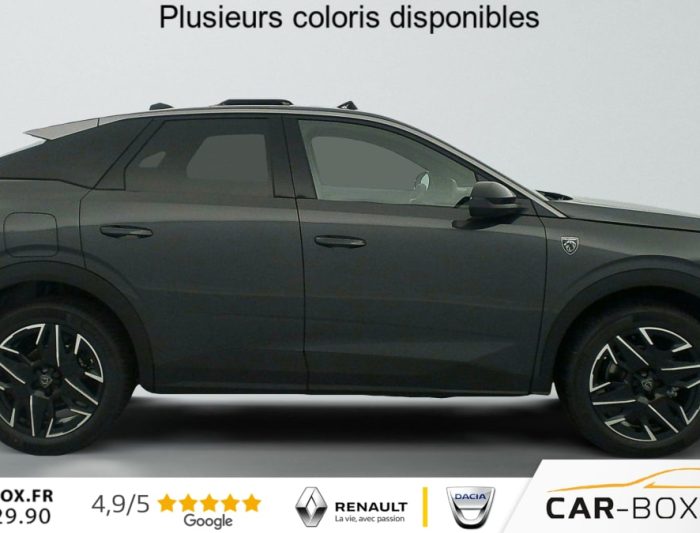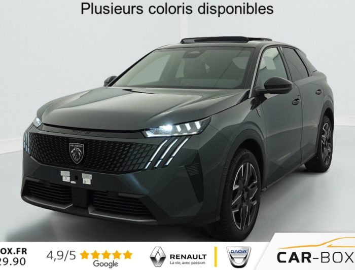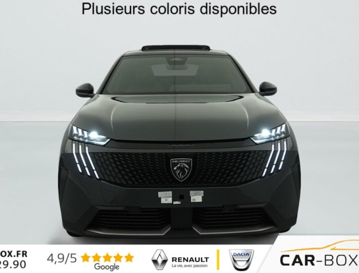 Grip control 4 modes (standard, boue, neige et sable) : option incluse (valeur : 300 Eur TTC), Pare-brise chauffant : option incluse (valeur : 100 Eur TTC), Frein de stationnement électrique, ESP avec aide au démarrage en pente, ABS, Détection de sous-gonflage indirecte, Commutation automatique des feux de route, Essuie-vitre AV à déclenchement automatique, Habitacle et ciel de pavillon Noir, Direction assistée, Accoudoir central, Teintes métallisées : option incluse (valeur : 1 200 Eur TTC), 6 HP (2 tweeters et 2 woofers à l'AV et 2 larges bandes à l'AR), Rétroviseurs extérieurs dégivrants avec réglage et rabattement électriques, éclairage de seuil, Allumage automatique des phares, Hayon motorisé avec accès mains libres, Pédalier et repose pied aluminium, Pack Safety Plus : Alerte attention conducteur Régulateur / Limiteur de vitesse Reconnaissance étendue des panneaux de signalisation et préconisation de vitesse Alerte active de franchissement involontaire de ligne et bas côté Freinage d'urgence automatique avec alerte risque de collision pilotée par caméra et radar, Plancher de coffre modulable 2 positions, Fixations ISOFIX et Top Tether aux places latérales AR, 4 poignées de maintien rétractables (2 à l'AV et 2 à l'AR), Volant chauffant, Sièges AV chauffants, Drive Assist - Régulateur de vitesse adaptatif avec fonction Stop & Go, Pack Hi-Fi Focal : Vitres latérales AV feuilletées acoustiques Système Hi Fi Premium FOCAL 10 HP (4 tweeters, 4 woofers, 1 voie centrale, 1 subwoofer) : option incluse (valeur : 850 Eur TTC), PEUGEOT i-Toggles virtuels avec 10 raccourcis personnalisables, PEUGEOT i-Connect Advanced Navigation 3D connectée, 4 prises USB: 1 prise USB C (Data & charge) et 1 prise USB C (Charge) à l'AV, 2 prises USB C (Charge) à l'AR, Jantes alliage 19" diamantées BREDA Noir Orbital, vernis brillant, 6 airbags: frontaux conducteur et passager auto-adaptatifs (passager neutralisable par clé), latéraux conducteur et passager AV (thorax et bassin), rideaux aux places AV et AR (tête et thorax), Feux diurnes 3 griffes à LED, Visiopark 1 Caméra de recul & aide au stationnement AV et AR, graphique et sonore, Monogrammes AV: blason PEUGEOT et 3008, Monogrammes AR 3008 et Hybrid, Accès et démarrage mains libres Proximity 2 Télécommandes 3 boutons (verrouillage, coffre, déverrouillage), Banquette AR avec dossier rabattable 40/20/40, Feux AR 3 griffes à LED 3D, Projecteurs PEUGEOT PIXEL LED Eclairage adaptatif, commutation automatique des feux de route, feux de route avec fonctions anti éblouissement et boost, Monogrammes ailes AV: 'blason PEUGEOT', Toit et becquet AR Black Diamond, Eléments de style intérieure Planche de bord moussée avec décor tissu RIMINI chiné, décor d'alcôve en Aluminium sérigraphié, façade et aérateurs Noir laqué avec décor Cast Iron, Panneaux de portes avec décor tissu RIMINI chiné, décor d'alcôve en Aluminium sérigraphié et jonc Cast Iron, accoudoirs TEP Isabella, surpiqûres Iced Clay à l' AV, Console centrale avec décor tissu RIMINI chiné, façade Noir laqué et jonc Cast Iron, accoudoir tissu RIMINI chiné, Eclairage d'ambiance indirect, jour & nuit sur la planche de bord, les panneaux de portes AV et sous l'écran panoramique 21'', associé aux modes de conduite, personnalisable en 8 couleurs, Seuil de portes AV inox avec lettrage PEUGEOT, Volant compact, cuir fleur lisse et perforé avec commandes intégrées Noir Laqué, décors Cast Iron, surpiqûres Iced Clay, insert Noir laqué avec badge ‘GT', Commutation adaptative des projecteurs, Eléments de style éxterieur Bandeau entre les projecteurs Noir laqué avec logo 3008. Calandre couleur caisse, écopes latérales Noir laqué, décor inférieur Gris Meteor, jupe inférieure Noir grainé. Vitres AR, vitres de custode et lunette AR surteintées. Lécheurs de vitres masqués. Enjoliveurs de passages de roues et protections inférieures de portes Noir grainé. Bandeau entre les feux AR Noir laqué avec lettrage PEUGEOT. Pare chocs AR avec décor Gris Meteor et jupe inférieure Noir grainé, Monogrammes AV et AR, PEUGEOT i-Cockpit panoramique avec écran incurvé et flottant 21'' HD, Sièges AV à réglage en hauteur manuel, Pack 360° Vision and Drive Assist Plus : Alarme (périmétrique, volumétrique et anti-soulèvement) Rétroviseurs extérieurs dégivrants avec réglage et rabattement électriques, éclairage de seuil Recharge smartphone sans fil (puissance 15W) VisioPark 360° 4 caméras HD (AV, AR et latérales), Aide au stationnement AV, AR et latérale (graphique et sonore) Drive Assist Plus 2.0 (conduite semi autonome): Régulateur de vitesse adaptatif avec fonction Stop & Go, Aide au maintien de la position dans la voie, Changement de voie semi automatique Détection de trafic AR Surveillance d'angles morts longue portée et aide au changement de voie, Alerte de trafic AR transversal Indexation à la marche AR avec mémorisation Super-condamnation des ouvrants : option incluse (valeur : 1 300 Eur TTC), Pack Toit ouvrant : Clean cabin avec capteur de particules dans l'habitacle Toit ouvrant panoramique et velum intérieur à commandes impulsionnelles : option incluse (valeur : 1 250 Eur TTC), Sellerie tissu NEW UZIRIS embossé, accompagnement TEP Isabella, écharpe tissu RIMINI chiné, surpiqûres Iced Clay, 2 prises 12 V (Console centrale, coffre), Contrôle de traction, Boîte de vitesse automatique, séquentielle (6 rapports), Eclairage intérieur Miroirs de courtoisie conducteur et passager occultables éclairés à LED, Vitres AV électriques, Air conditionné automatique bi-zone, Pare-brise feuilleté acoustique, Lève-vitres AV/AR électriques et séquentiels avec antipincement, Siège conducteur à réglage lombaire manuel