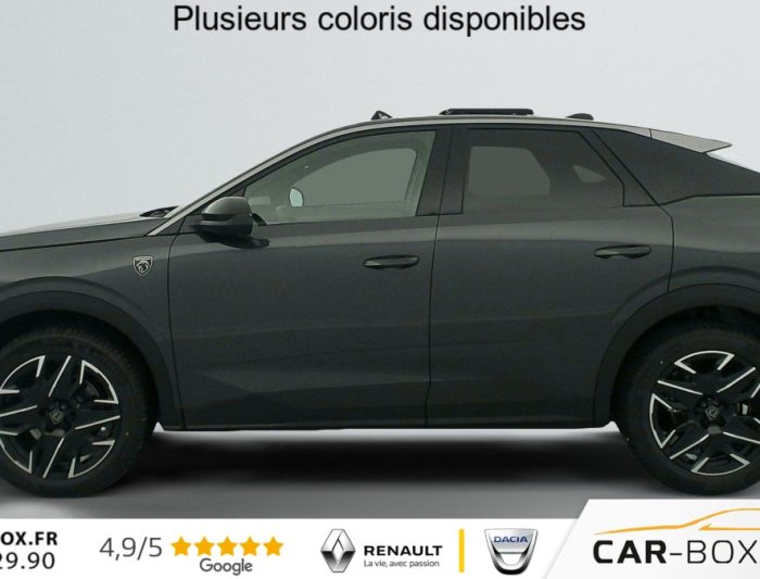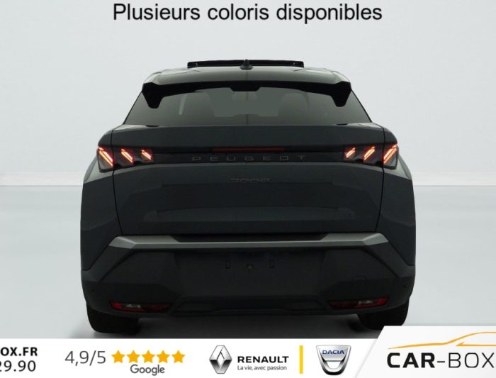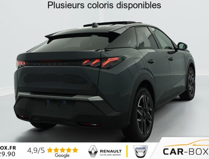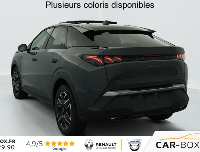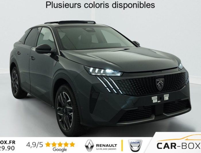Hors frais de dossierHybrid 145 e-DCS6 GT, hybride, blanc, 26/08/2025, Grip control 4 modes (standard, boue, neige et sable) : option incluse (valeur : 300 Eur TTC), Pare-brise chauffant : option incluse (valeur : 100 Eur TTC), Frein de stationnement électrique, ESP avec aide au démarrage en pente, ABS, Détection de sous-gonflage indirecte, Commutation automatique des feux de route, Essuie-vitre AV à déclenchement automatique, Habitacle et ciel de pavillon Noir, Direction assistée, Accoudoir central, Teintes métallisées : option incluse (valeur : 1 200 Eur TTC), 6 HP (2 tweeters et 2 woofers à l’AV et 2 larges bandes à l’AR), Rétroviseurs extérieurs dégivrants avec réglage et rabattement électriques, éclairage de seuil, Allumage automatique des phares, Hayon motorisé avec accès mains libres, Pédalier et repose pied aluminium, Pack Safety Plus : Alerte attention conducteur Régulateur / Limiteur de vitesse Reconnaissance étendue des panneaux de signalisation et préconisation de vitesse Alerte active de franchissement involontaire de ligne et bas côté Freinage d’urgence automatique avec alerte risque de collision pilotée par caméra et radar, Plancher de coffre modulable 2 positions, Fixations ISOFIX et Top Tether aux places latérales AR, 4 poignées de maintien rétractables (2 à l’AV et 2 à l’AR), Volant chauffant, Sièges AV chauffants, Drive Assist – Régulateur de vitesse adaptatif avec fonction Stop & Go, Pack Hi-Fi Focal : Vitres latérales AV feuilletées acoustiques Système Hi Fi Premium FOCAL 10 HP (4 tweeters, 4 woofers, 1 voie centrale, 1 subwoofer) : option incluse (valeur : 850 Eur TTC), PEUGEOT i-Toggles virtuels avec 10 raccourcis personnalisables, PEUGEOT i-Connect Advanced Navigation 3D connectée, 4 prises USB: 1 prise USB C (Data & charge) et 1 prise USB C (Charge) à l’AV, 2 prises USB C (Charge) à l’AR, Jantes alliage 19" diamantées BREDA Noir Orbital, vernis brillant, 6 airbags: frontaux conducteur et passager auto-adaptatifs (passager neutralisable par clé), latéraux conducteur et passager AV (thorax et bassin), rideaux aux places AV et AR (tête et thorax), Feux diurnes 3 griffes à LED, Visiopark 1 Caméra de recul & aide au stationnement AV et AR, graphique et sonore, Monogrammes AV: blason PEUGEOT et 3008, Monogrammes AR 3008 et Hybrid, Accès et démarrage mains libres Proximity 2 Télécommandes 3 boutons (verrouillage, coffre, déverrouillage), Banquette AR avec dossier rabattable 40/20/40, Feux AR 3 griffes à LED 3D, Projecteurs PEUGEOT PIXEL LED Eclairage adaptatif, commutation automatique des feux de route, feux de route avec fonctions anti éblouissement et boost, Monogrammes ailes AV: ‘blason PEUGEOT’, Toit et becquet AR Black Diamond, Eléments de style intérieure Planche de bord moussée avec décor tissu RIMINI chiné, décor d’alcôve en Aluminium sérigraphié, façade et aérateurs Noir laqué avec décor Cast Iron, Panneaux de portes avec décor tissu RIMINI chiné, décor d’alcôve en Aluminium sérigraphié et jonc Cast Iron, accoudoirs TEP Isabella, surpiqûres Iced Clay à l’ AV, Console centrale avec décor tissu RIMINI chiné, façade Noir laqué et jonc Cast Iron, accoudoir tissu RIMINI chiné, Eclairage d’ambiance indirect, jour & nuit sur la planche de bord, les panneaux de portes AV et sous l’écran panoramique 21 », associé aux modes de conduite, personnalisable en 8 couleurs, Seuil de portes AV inox avec lettrage PEUGEOT, Volant compact, cuir fleur lisse et perforé avec commandes intégrées Noir Laqué, décors Cast Iron, surpiqûres Iced Clay, insert Noir laqué avec badge ‘GT’, Commutation adaptative des projecteurs, Eléments de style éxterieur Bandeau entre les projecteurs Noir laqué avec logo 3008. Calandre couleur caisse, écopes latérales Noir laqué, décor inférieur Gris Meteor, jupe inférieure Noir grainé. Vitres AR, vitres de custode et lunette AR surteintées. Lécheurs de vitres masqués. Enjoliveurs de passages de roues et protections inférieures de portes Noir grainé. Bandeau entre les feux AR Noir laqué avec lettrage PEUGEOT. Pare chocs AR avec décor Gris Meteor et jupe inférieure Noir grainé, Monogrammes AV et AR, PEUGEOT i-Cockpit panoramique avec écran incurvé et flottant 21 » HD, Sièges AV à réglage en hauteur manuel, Pack 360° Vision and Drive Assist Plus : Alarme (périmétrique, volumétrique et anti-soulèvement) Rétroviseurs extérieurs dégivrants avec réglage et rabattement électriques, éclairage de seuil Recharge smartphone sans fil (puissance 15W) VisioPark 360° 4 caméras HD (AV, AR et latérales), Aide au stationnement AV, AR et latérale (graphique et sonore) Drive Assist Plus 2.0 (conduite semi autonome): Régulateur de vitesse adaptatif avec fonction Stop & Go, Aide au maintien de la position dans la voie, Changement de voie semi automatique Détection de trafic AR Surveillance d’angles morts longue portée et aide au changement de voie, Alerte de trafic AR transversal Indexation à la marche AR avec mémorisation Super-condamnation des ouvrants : option incluse (valeur : 1 300 Eur TTC), Pack Toit ouvrant : Clean cabin avec capteur de particules dans l’habitacle Toit ouvrant panoramique et velum intérieur à commandes impulsionnelles : option incluse (valeur : 1 250 Eur TTC), Sellerie tissu NEW UZIRIS embossé, accompagnement TEP Isabella, écharpe tissu RIMINI chiné, surpiqûres Iced Clay, 2 prises 12 V (Console centrale, coffre), Contrôle de traction, Boîte de vitesse automatique, séquentielle (6 rapports), Eclairage intérieur Miroirs de courtoisie conducteur et passager occultables éclairés à LED, Vitres AV électriques, Air conditionné automatique bi-zone, Pare-brise feuilleté acoustique, Lève-vitres AV/AR électriques et séquentiels avec antipincement, Siège conducteur à réglage lombaire manuel