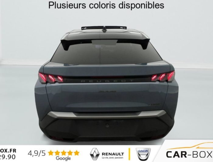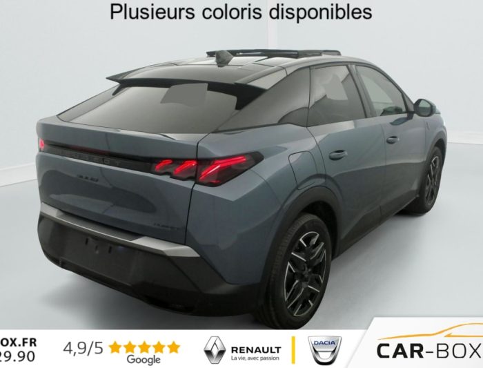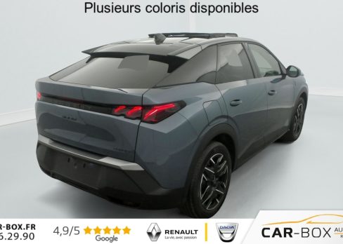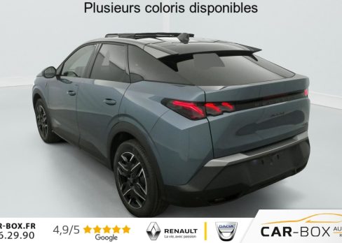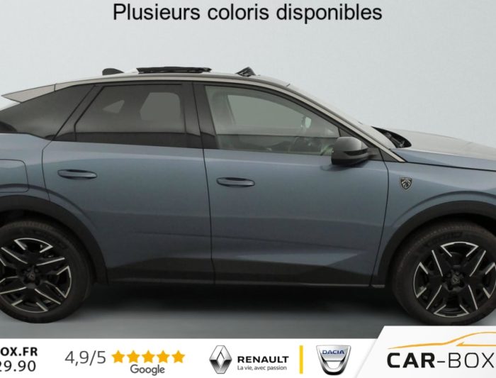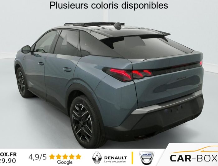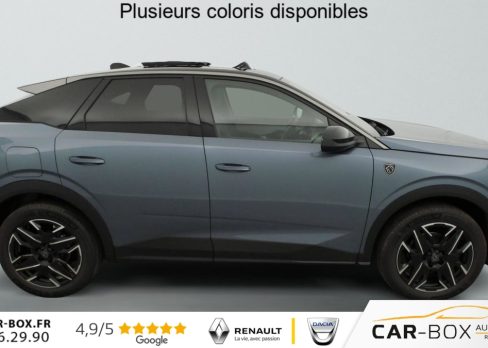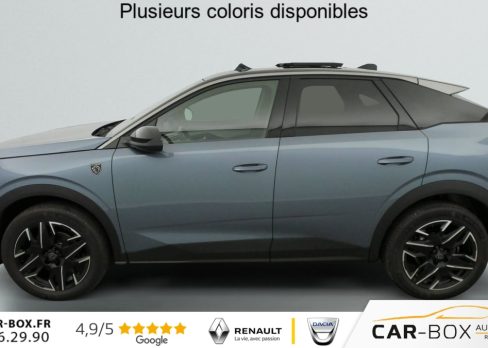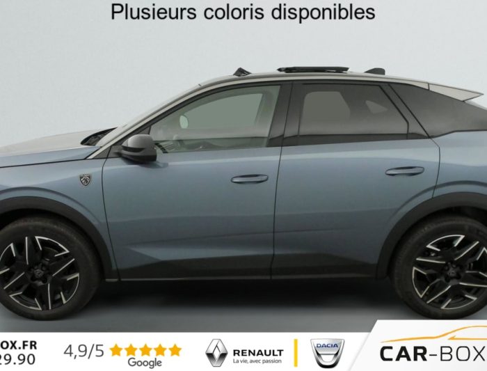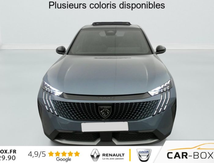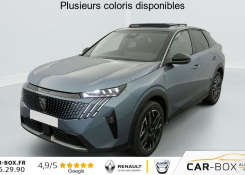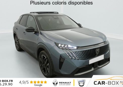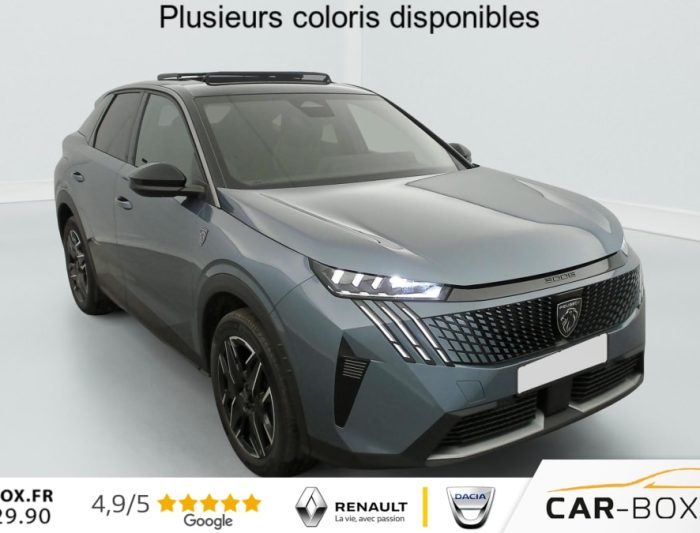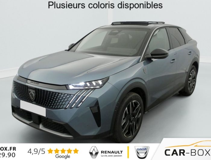 Hors frais de dossierHybrid 145 e-DCS6 GT, hybride, gris, 29/08/2025, Véhicule livré sans Kit anti crevaison ni roue de secours, Frein de stationnement électrique, ESP avec aide au démarrage en pente, ABS, Détection de sous-gonflage indirecte, Commutation automatique des feux de route, Essuie-vitre AV à déclenchement automatique, Habitacle et ciel de pavillon Noir, Direction assistée, Accoudoir central, Teintes métallisées : option incluse (valeur : 1 200 Eur TTC), 6 HP (2 tweeters et 2 woofers à l’AV et 2 larges bandes à l’AR), Rétroviseurs extérieurs dégivrants avec réglage et rabattement électriques, éclairage de seuil, Allumage automatique des phares, Hayon motorisé avec accès mains libres, Pédalier et repose pied aluminium, Plancher de coffre modulable 2 positions, Fixations ISOFIX et Top Tether aux places latérales AR, 4 poignées de maintien rétractables (2 à l’AV et 2 à l’AR), Volant chauffant, Sièges AV chauffants, Drive Assist – Régulateur de vitesse adaptatif avec fonction Stop & Go, PEUGEOT i-Toggles virtuels avec 10 raccourcis personnalisables, PEUGEOT i-Connect Advanced Navigation 3D connectée, 4 prises USB: 1 prise USB C (Data & charge) et 1 prise USB C (Charge) à l’AV, 2 prises USB C (Charge) à l’AR, Jantes alliage 19" diamantées Lulea Noir Orbital, vernis brillant, 6 airbags: frontaux conducteur et passager auto-adaptatifs (passager neutralisable par clé), latéraux conducteur et passager AV (thorax et bassin), rideaux aux places AV et AR (tête et thorax), Feux diurnes 3 griffes à LED, Visiopark 1 Caméra de recul & aide au stationnement AV et AR, graphique et sonore, Monogrammes AV: blason PEUGEOT et 3008, Monogrammes AR 3008 et Hybrid, Accès et démarrage mains libres Proximity, Banquette AR avec dossier rabattable 40/20/40, Feux AR 3 griffes à LED 3D, Projecteurs PEUGEOT PIXEL LED Eclairage adaptatif, commutation automatique des feux de route, feux de route avec fonctions anti éblouissement et boost, Monogrammes ailes AV: ‘blason PEUGEOT’, Toit et becquet AR Black Diamond, Eléments de style intérieure Planche de bord moussée avec décor tissu RIMINI chiné, décor d’alcôve en Aluminium sérigraphié, façade et aérateurs Noir laqué avec décor Cast Iron, Panneaux de portes avec décor tissu RIMINI chiné, décor d’alcôve en Aluminium sérigraphié et jonc Cast Iron, accoudoirs TEP Isabella, surpiqûres Iced Clay à l’ AV, Console centrale avec décor tissu RIMINI chiné, façade Noir laqué et jonc Cast Iron, accoudoir tissu RIMINI chiné, Eclairage d’ambiance indirect, jour & nuit sur la planche de bord, les panneaux de portes AV et sous l’écran panoramique 21 », associé aux modes de conduite, personnalisable en 8 couleurs, Seuil de portes AV inox avec lettrage PEUGEOT, Volant compact, cuir fleur lisse et perforé avec commandes intégrées Noir Laqué, décors Cast Iron, surpiqûres Iced Clay, insert Noir laqué avec badge ‘GT’, Commutation adaptative des projecteurs, Eléments de style éxterieur Bandeau entre les projecteurs Noir laqué avec logo 3008. Calandre couleur caisse, écopes latérales Noir laqué, décor inférieur Gris Meteor, jupe inférieure Noir grainé. Vitres AR, vitres de custode et lunette AR surteintées. Lécheurs de vitres masqués. Enjoliveurs de passages de roues et protections inférieures de portes Noir grainé. Bandeau entre les feux AR Noir laqué avec lettrage PEUGEOT. Pare chocs AR avec décor Gris Meteor et jupe inférieure Noir grainé, Monogrammes AV et AR, PEUGEOT i-Cockpit panoramique avec écran incurvé et flottant 21 » HD, Sièges AV à réglage en hauteur manuel, Pack Toit ouvrant Toit ouvrant panoramique et velum intérieur à commandes impulsionnelles, Clean cabine avec capteurs de particules dans l’habitacle : Clean cabin avec capteur de particules dans l’habitacle Toit ouvrant panoramique et velum intérieur à commandes impulsionnelles : option incluse (valeur : 1 250 Eur TTC), Sellerie tissu NEW UZIRIS embossé, accompagnement TEP Isabella, écharpe tissu RIMINI chiné, surpiqûres Iced Clay, 2 prises 12 V (Console centrale, coffre), Contrôle de traction, Boîte de vitesse automatique, séquentielle (6 rapports), Eclairage intérieur Miroirs de courtoisie conducteur et passager occultables éclairés à LED, Pack Safety Plus Régulateur / Limiteur de vitesse, Freinage d’urgence automatique avec alerte risque de collision et protection des usagers de la route vulnérables (piétons, cyclistes, … ) Alerte active de franchissement involontaire de ligne et bas côté, Reconnaissance étendue des panneaux de signalisation et préconisation de vitesse, Alerte attention conducteur : Alerte attention conducteur Régulateur / Limiteur de vitesse Reconnaissance étendue des panneaux de signalisation et préconisation de vitesse Alerte active de franchissement involontaire de ligne et bas côté Freinage d’urgence automatique avec alerte risque de collision pilotée par caméra et radar, PEUGEOT i-Connect Advanced – Connect Plus: Reconnaissance vocale connectée en langage naturel, ChatGPT (Disponibilité ultérieurement) Services de sécurité: alarme connectée (Si véhicule équipé de l’alarme, ) Services à distance (Remote Control, Find My Car, My Trip Report, Peugeot Skill for Alexa), Fonctions de Navigation (Trafic en temps réel, prévisions météorologiques, parking, recherche TomTom, limitations de vitesse, prix du carburant, mise à jour cartographie Over The Air, Send to Nav, Geofenci, Vitres AV électriques, Air conditionné automatique bi-zone, Pare-brise feuilleté acoustique, Lève-vitres AV/AR électriques et séquentiels avec antipincement, Siège conducteur à réglage lombaire manuel