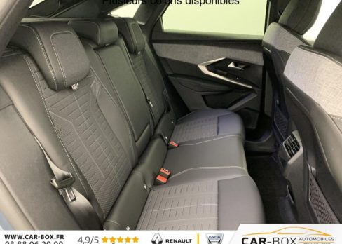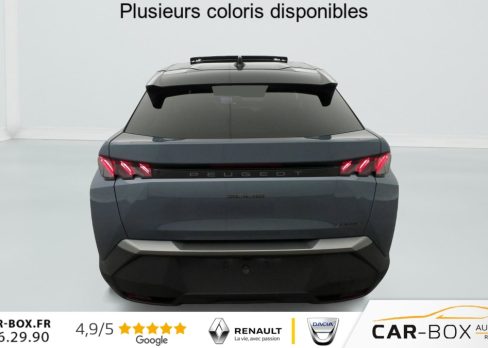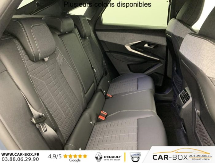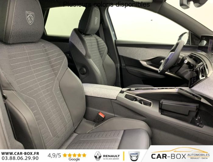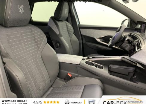 Véhicule livré sans Kit anti crevaison ni roue de secours, Frein de stationnement électrique, ESP avec aide au démarrage en pente, ABS, Détection de sous-gonflage indirecte, Commutation automatique des feux de route, Essuie-vitre AV à déclenchement automatique, Habitacle et ciel de pavillon Noir, Direction assistée, Accoudoir central, Teintes métallisées : option incluse (valeur : 1 200 Eur TTC), 6 HP (2 tweeters et 2 woofers à l'AV et 2 larges bandes à l'AR), Rétroviseurs extérieurs dégivrants avec réglage et rabattement électriques, éclairage de seuil, Allumage automatique des phares, Hayon motorisé avec accès mains libres, Pédalier et repose pied aluminium, Plancher de coffre modulable 2 positions, Fixations ISOFIX et Top Tether aux places latérales AR, 4 poignées de maintien rétractables (2 à l'AV et 2 à l'AR), Volant chauffant, Sièges AV chauffants, Drive Assist - Régulateur de vitesse adaptatif avec fonction Stop & Go, PEUGEOT i-Toggles virtuels avec 10 raccourcis personnalisables, PEUGEOT i-Connect Advanced Navigation 3D connectée, 4 prises USB: 1 prise USB C (Data & charge) et 1 prise USB C (Charge) à l'AV, 2 prises USB C (Charge) à l'AR, Jantes alliage 19" diamantées Lulea Noir Orbital, vernis brillant, 6 airbags: frontaux conducteur et passager auto-adaptatifs (passager neutralisable par clé), latéraux conducteur et passager AV (thorax et bassin), rideaux aux places AV et AR (tête et thorax), Feux diurnes 3 griffes à LED, Visiopark 1 Caméra de recul & aide au stationnement AV et AR, graphique et sonore, Monogrammes AV: blason PEUGEOT et 3008, Monogrammes AR 3008 et Hybrid, Accès et démarrage mains libres Proximity, Banquette AR avec dossier rabattable 40/20/40, Feux AR 3 griffes à LED 3D, Projecteurs PEUGEOT PIXEL LED Eclairage adaptatif, commutation automatique des feux de route, feux de route avec fonctions anti éblouissement et boost, Monogrammes ailes AV: 'blason PEUGEOT', Toit et becquet AR Black Diamond, Eléments de style intérieure Planche de bord moussée avec décor tissu RIMINI chiné, décor d'alcôve en Aluminium sérigraphié, façade et aérateurs Noir laqué avec décor Cast Iron, Panneaux de portes avec décor tissu RIMINI chiné, décor d'alcôve en Aluminium sérigraphié et jonc Cast Iron, accoudoirs TEP Isabella, surpiqûres Iced Clay à l' AV, Console centrale avec décor tissu RIMINI chiné, façade Noir laqué et jonc Cast Iron, accoudoir tissu RIMINI chiné, Eclairage d'ambiance indirect, jour & nuit sur la planche de bord, les panneaux de portes AV et sous l'écran panoramique 21'', associé aux modes de conduite, personnalisable en 8 couleurs, Seuil de portes AV inox avec lettrage PEUGEOT, Volant compact, cuir fleur lisse et perforé avec commandes intégrées Noir Laqué, décors Cast Iron, surpiqûres Iced Clay, insert Noir laqué avec badge ‘GT', Commutation adaptative des projecteurs, Eléments de style éxterieur Bandeau entre les projecteurs Noir laqué avec logo 3008. Calandre couleur caisse, écopes latérales Noir laqué, décor inférieur Gris Meteor, jupe inférieure Noir grainé. Vitres AR, vitres de custode et lunette AR surteintées. Lécheurs de vitres masqués. Enjoliveurs de passages de roues et protections inférieures de portes Noir grainé. Bandeau entre les feux AR Noir laqué avec lettrage PEUGEOT. Pare chocs AR avec décor Gris Meteor et jupe inférieure Noir grainé, Monogrammes AV et AR, PEUGEOT i-Cockpit panoramique avec écran incurvé et flottant 21'' HD, Sièges AV à réglage en hauteur manuel, Pack Toit ouvrant Toit ouvrant panoramique et velum intérieur à commandes impulsionnelles, Clean cabine avec capteurs de particules dans l'habitacle : Clean cabin avec capteur de particules dans l'habitacle Toit ouvrant panoramique et velum intérieur à commandes impulsionnelles : option incluse (valeur : 1 250 Eur TTC), Sellerie tissu NEW UZIRIS embossé, accompagnement TEP Isabella, écharpe tissu RIMINI chiné, surpiqûres Iced Clay, 2 prises 12 V (Console centrale, coffre), Contrôle de traction, Boîte de vitesse automatique, séquentielle (6 rapports), Eclairage intérieur Miroirs de courtoisie conducteur et passager occultables éclairés à LED, Pack Safety Plus Régulateur / Limiteur de vitesse, Freinage d'urgence automatique avec alerte risque de collision et protection des usagers de la route vulnérables (piétons, cyclistes,... ) Alerte active de franchissement involontaire de ligne et bas côté, Reconnaissance étendue des panneaux de signalisation et préconisation de vitesse, Alerte attention conducteur : Alerte attention conducteur Régulateur / Limiteur de vitesse Reconnaissance étendue des panneaux de signalisation et préconisation de vitesse Alerte active de franchissement involontaire de ligne et bas côté Freinage d'urgence automatique avec alerte risque de collision pilotée par caméra et radar, PEUGEOT i-Connect Advanced - Connect Plus: Reconnaissance vocale connectée en langage naturel, ChatGPT (Disponibilité ultérieurement) Services de sécurité: alarme connectée (Si véhicule équipé de l'alarme,) Services à distance (Remote Control, Find My Car, My Trip Report, Peugeot Skill for Alexa), Fonctions de Navigation (Trafic en temps réel, prévisions météorologiques,parking, recherche TomTom, limitations de vitesse, prix du carburant, mise à jour cartographie Over The Air, Send to Nav, Geofenci, Vitres AV électriques, Air conditionné automatique bi-zone, Pare-brise feuilleté acoustique, Lève-vitres AV/AR électriques et séquentiels avec antipincement, Siège conducteur à réglage lombaire manuel