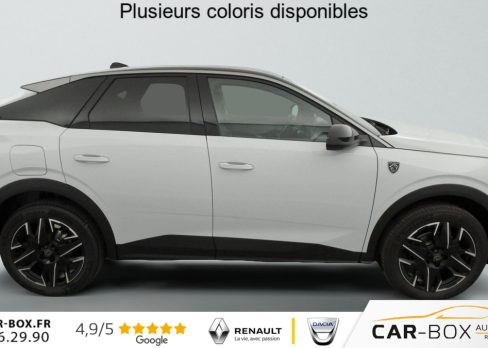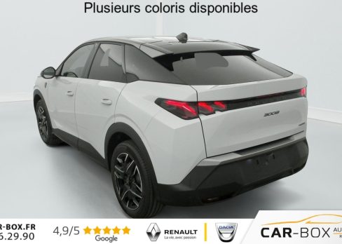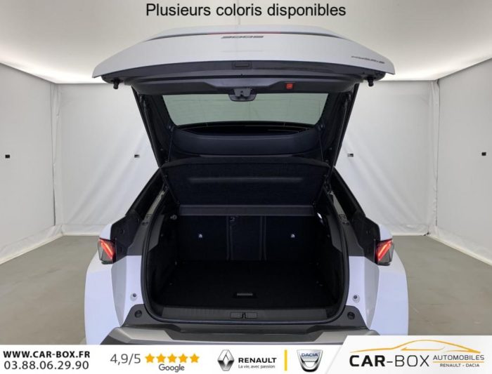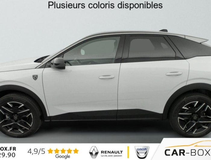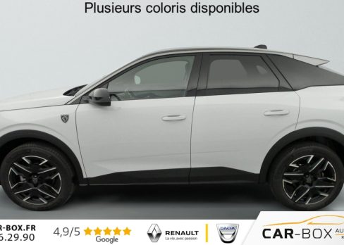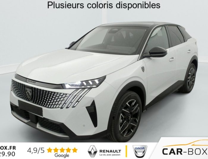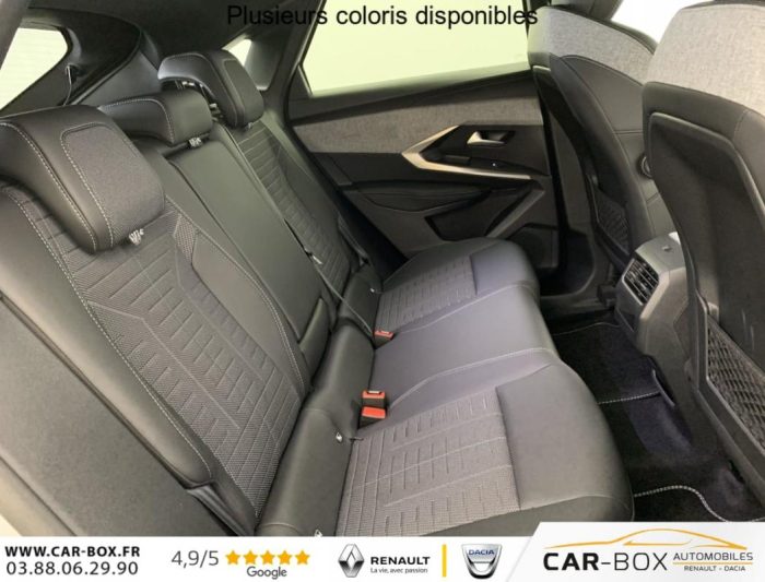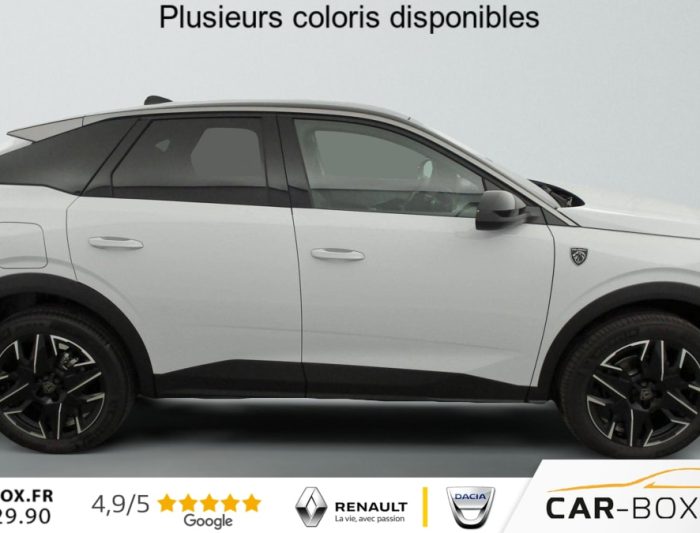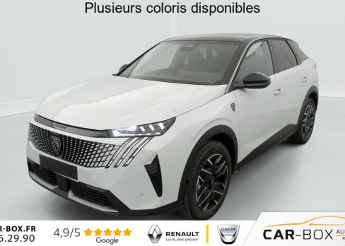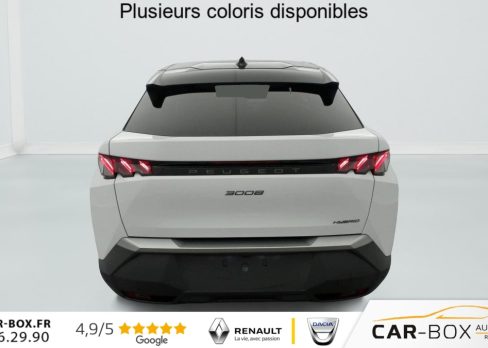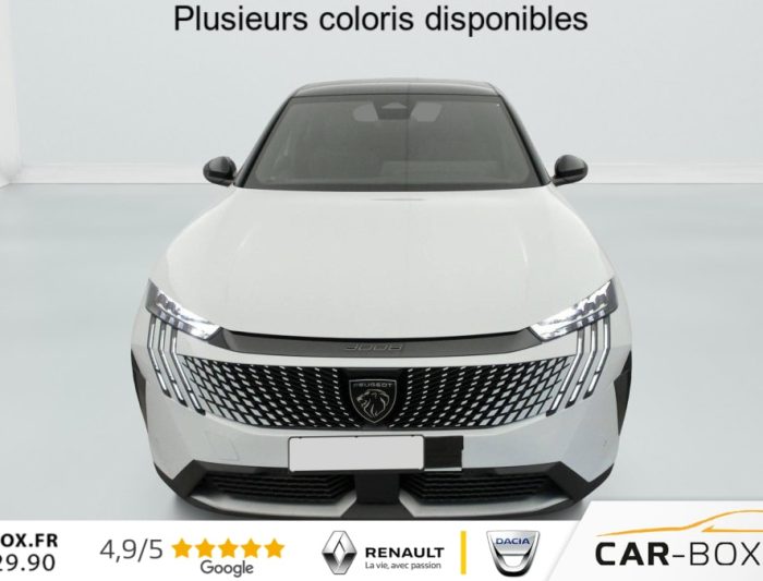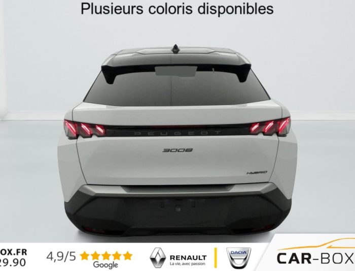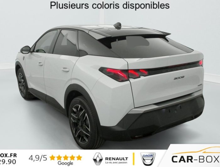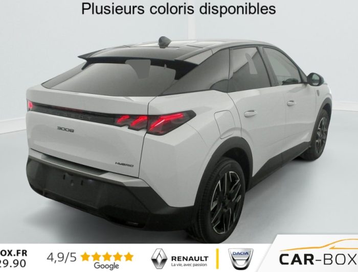 Hybrid 145 e-DCS6 GT, hybride, gris, 20/08/2025, Frein de stationnement électrique, ESP avec aide au démarrage en pente, ABS, Détection de sous-gonflage indirecte, Commutation automatique des feux de route, Essuie-vitre AV à déclenchement automatique, Habitacle et ciel de pavillon Noir, Direction assistée, Accoudoir central, Teintes métallisées : option incluse (valeur : 1 200 Eur TTC), 6 HP (2 tweeters et 2 woofers à l’AV et 2 larges bandes à l’AR), Rétroviseurs extérieurs dégivrants avec réglage et rabattement électriques, éclairage de seuil, Allumage automatique des phares, Hayon motorisé avec accès mains libres, Pédalier et repose pied aluminium, Pack Safety Plus : Alerte attention conducteur Régulateur / Limiteur de vitesse Reconnaissance étendue des panneaux de signalisation et préconisation de vitesse Alerte active de franchissement involontaire de ligne et bas côté Freinage d’urgence automatique avec alerte risque de collision pilotée par caméra et radar, Plancher de coffre modulable 2 positions, Fixations ISOFIX et Top Tether aux places latérales AR, 4 poignées de maintien rétractables (2 à l’AV et 2 à l’AR), Volant chauffant, Sièges AV chauffants, Drive Assist – Régulateur de vitesse adaptatif avec fonction Stop & Go, PEUGEOT i-Toggles virtuels avec 10 raccourcis personnalisables, PEUGEOT i-Connect Advanced Navigation 3D connectée, 4 prises USB: 1 prise USB C (Data & charge) et 1 prise USB C (Charge) à l’AV, 2 prises USB C (Charge) à l’AR, Jantes alliage 19" diamantées BREDA Noir Orbital, vernis brillant, 6 airbags: frontaux conducteur et passager auto-adaptatifs (passager neutralisable par clé), latéraux conducteur et passager AV (thorax et bassin), rideaux aux places AV et AR (tête et thorax), Feux diurnes 3 griffes à LED, Visiopark 1 Caméra de recul & aide au stationnement AV et AR, graphique et sonore, Monogrammes AV: blason PEUGEOT et 3008, Monogrammes AR 3008 et Hybrid, Accès et démarrage mains libres Proximity 2 Télécommandes 3 boutons (verrouillage, coffre, déverrouillage), Banquette AR avec dossier rabattable 40/20/40, Feux AR 3 griffes à LED 3D, Projecteurs PEUGEOT PIXEL LED Eclairage adaptatif, commutation automatique des feux de route, feux de route avec fonctions anti éblouissement et boost, Monogrammes ailes AV: ‘blason PEUGEOT’, Toit et becquet AR Black Diamond, Eclairage d’ambiance indirect, jour & nuit sur la planche de bord, les panneaux de portes AV et sous l’écran panoramique 21 », associé aux modes de conduite, personnalisable en 8 couleurs, Seuil de portes AV inox avec lettrage PEUGEOT, Volant compact, cuir fleur lisse et perforé avec commandes intégrées Noir Laqué, décors Cast Iron, surpiqûres Iced Clay, insert Noir laqué avec badge ‘GT’, Commutation adaptative des projecteurs, Eléments de style éxterieur Bandeau entre les projecteurs Noir laqué avec logo 3008. Calandre couleur caisse, écopes latérales Noir laqué, décor inférieur Gris Meteor, jupe inférieure Noir grainé. Vitres AR, vitres de custode et lunette AR surteintées. Lécheurs de vitres masqués. Enjoliveurs de passages de roues et protections inférieures de portes Noir grainé. Bandeau entre les feux AR Noir laqué avec lettrage PEUGEOT. Pare chocs AR avec décor Gris Meteor et jupe inférieure Noir grainé, Monogrammes AV et AR, PEUGEOT i-Cockpit panoramique avec écran incurvé et flottant 21 » HD, Sièges AV à réglage en hauteur manuel, Sellerie tissu NEW UZIRIS embossé, accompagnement TEP Isabella, écharpe tissu RIMINI chiné, surpiqûres Iced Clay, 2 prises 12 V (Console centrale, coffre), Contrôle de traction, Boîte de vitesse automatique, séquentielle (6 rapports), Eclairage intérieur Miroirs de courtoisie conducteur et passager occultables éclairés à LED, Vitres AV électriques, Air conditionné automatique bi-zone, Pare-brise feuilleté acoustique, Lève-vitres AV et AR électriques séquentiels avec antipincement, Siège conducteur à réglage lombaire manuel