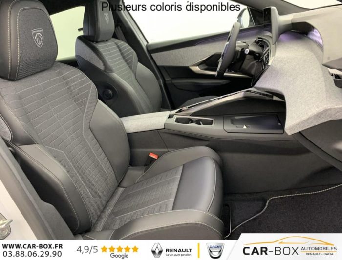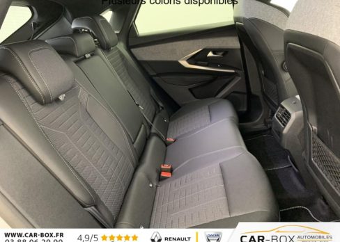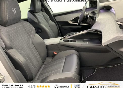 Frein de stationnement électrique, ESP avec aide au démarrage en pente, ABS, Détection de sous-gonflage indirecte, Commutation automatique des feux de route, Essuie-vitre AV à déclenchement automatique, Habitacle et ciel de pavillon Noir, Direction assistée, Accoudoir central, Teintes métallisées : option incluse (valeur : 1 200 Eur TTC), 6 HP (2 tweeters et 2 woofers à l'AV et 2 larges bandes à l'AR), Rétroviseurs extérieurs dégivrants avec réglage et rabattement électriques, éclairage de seuil, Allumage automatique des phares, Hayon motorisé avec accès mains libres, Pédalier et repose pied aluminium, Pack Safety Plus : Alerte attention conducteur Régulateur / Limiteur de vitesse Reconnaissance étendue des panneaux de signalisation et préconisation de vitesse Alerte active de franchissement involontaire de ligne et bas côté Freinage d'urgence automatique avec alerte risque de collision pilotée par caméra et radar, Plancher de coffre modulable 2 positions, Fixations ISOFIX et Top Tether aux places latérales AR, 4 poignées de maintien rétractables (2 à l'AV et 2 à l'AR), Volant chauffant, Sièges AV chauffants, Drive Assist - Régulateur de vitesse adaptatif avec fonction Stop & Go, PEUGEOT i-Toggles virtuels avec 10 raccourcis personnalisables, PEUGEOT i-Connect Advanced Navigation 3D connectée, 4 prises USB: 1 prise USB C (Data & charge) et 1 prise USB C (Charge) à l'AV, 2 prises USB C (Charge) à l'AR, Jantes alliage 19" diamantées BREDA Noir Orbital, vernis brillant, 6 airbags: frontaux conducteur et passager auto-adaptatifs (passager neutralisable par clé), latéraux conducteur et passager AV (thorax et bassin), rideaux aux places AV et AR (tête et thorax), Feux diurnes 3 griffes à LED, Visiopark 1 Caméra de recul & aide au stationnement AV et AR, graphique et sonore, Monogrammes AV: blason PEUGEOT et 3008, Monogrammes AR 3008 et Hybrid, Accès et démarrage mains libres Proximity 2 Télécommandes 3 boutons (verrouillage, coffre, déverrouillage), Banquette AR avec dossier rabattable 40/20/40, Feux AR 3 griffes à LED 3D, Projecteurs PEUGEOT PIXEL LED Eclairage adaptatif, commutation automatique des feux de route, feux de route avec fonctions anti éblouissement et boost, Monogrammes ailes AV: 'blason PEUGEOT', Toit et becquet AR Black Diamond, Eclairage d'ambiance indirect, jour & nuit sur la planche de bord, les panneaux de portes AV et sous l'écran panoramique 21'', associé aux modes de conduite, personnalisable en 8 couleurs, Seuil de portes AV inox avec lettrage PEUGEOT, Volant compact, cuir fleur lisse et perforé avec commandes intégrées Noir Laqué, décors Cast Iron, surpiqûres Iced Clay, insert Noir laqué avec badge ‘GT', Commutation adaptative des projecteurs, Eléments de style éxterieur Bandeau entre les projecteurs Noir laqué avec logo 3008. Calandre couleur caisse, écopes latérales Noir laqué, décor inférieur Gris Meteor, jupe inférieure Noir grainé. Vitres AR, vitres de custode et lunette AR surteintées. Lécheurs de vitres masqués. Enjoliveurs de passages de roues et protections inférieures de portes Noir grainé. Bandeau entre les feux AR Noir laqué avec lettrage PEUGEOT. Pare chocs AR avec décor Gris Meteor et jupe inférieure Noir grainé, Monogrammes AV et AR, PEUGEOT i-Cockpit panoramique avec écran incurvé et flottant 21'' HD, Sièges AV à réglage en hauteur manuel, Sellerie tissu NEW UZIRIS embossé, accompagnement TEP Isabella, écharpe tissu RIMINI chiné, surpiqûres Iced Clay, 2 prises 12 V (Console centrale, coffre), Contrôle de traction, Boîte de vitesse automatique, séquentielle (6 rapports), Eclairage intérieur Miroirs de courtoisie conducteur et passager occultables éclairés à LED, Vitres AV électriques, Air conditionné automatique bi-zone, Pare-brise feuilleté acoustique, Lève-vitres AV et AR électriques séquentiels avec antipincement, Siège conducteur à réglage lombaire manuel