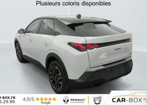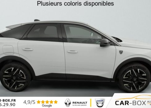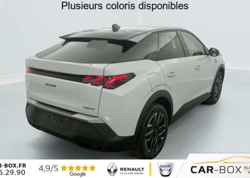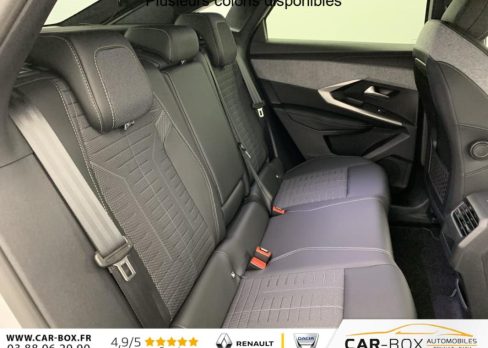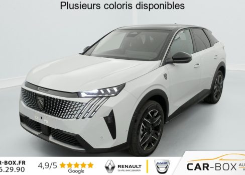 Hors frais de dossierHybrid 145 e-DCS6 GT, hybride, blanc, 29/08/2025, Frein de stationnement électrique, ESP avec aide au démarrage en pente, ABS, Détection de sous-gonflage indirecte, Commutation automatique des feux de route, Essuie-vitre AV à déclenchement automatique, Habitacle et ciel de pavillon Noir, Direction assistée, Accoudoir central, Teintes métallisées : option incluse (valeur : 1 200 Eur TTC), 6 HP (2 tweeters et 2 woofers à l’AV et 2 larges bandes à l’AR), Rétroviseurs extérieurs dégivrants avec réglage et rabattement électriques, éclairage de seuil, Allumage automatique des phares, Hayon motorisé avec accès mains libres, Pédalier et repose pied aluminium, Plancher de coffre modulable 2 positions, Fixations ISOFIX et Top Tether aux places latérales AR, 4 poignées de maintien rétractables (2 à l’AV et 2 à l’AR), Volant chauffant, Sièges AV chauffants, Drive Assist – Régulateur de vitesse adaptatif avec fonction Stop & Go, PEUGEOT i-Toggles virtuels avec 10 raccourcis personnalisables, PEUGEOT i-Connect Advanced Navigation 3D connectée, 4 prises USB: 1 prise USB C (Data & charge) et 1 prise USB C (Charge) à l’AV, 2 prises USB C (Charge) à l’AR, Jantes alliage 19" diamantées Lulea Noir Orbital, vernis brillant, 6 airbags: frontaux conducteur et passager auto-adaptatifs (passager neutralisable par clé), latéraux conducteur et passager AV (thorax et bassin), rideaux aux places AV et AR (tête et thorax), Feux diurnes 3 griffes à LED, Visiopark 1 Caméra de recul & aide au stationnement AV et AR, graphique et sonore, Monogrammes AV: blason PEUGEOT et 3008, Monogrammes AR 3008 et Hybrid, Accès et démarrage mains libres Proximity, Banquette AR avec dossier rabattable 40/20/40, Feux AR 3 griffes à LED 3D, Projecteurs PEUGEOT PIXEL LED Eclairage adaptatif, commutation automatique des feux de route, feux de route avec fonctions anti éblouissement et boost, Monogrammes ailes AV: ‘blason PEUGEOT’, Toit et becquet AR Black Diamond, Eléments de style intérieure Planche de bord moussée avec décor tissu RIMINI chiné, décor d’alcôve en Aluminium sérigraphié, façade et aérateurs Noir laqué avec décor Cast Iron, Panneaux de portes avec décor tissu RIMINI chiné, décor d’alcôve en Aluminium sérigraphié et jonc Cast Iron, accoudoirs TEP Isabella, surpiqûres Iced Clay à l’ AV, Console centrale avec décor tissu RIMINI chiné, façade Noir laqué et jonc Cast Iron, accoudoir tissu RIMINI chiné, Eclairage d’ambiance indirect, jour & nuit sur la planche de bord, les panneaux de portes AV et sous l’écran panoramique 21 », associé aux modes de conduite, personnalisable en 8 couleurs, Seuil de portes AV inox avec lettrage PEUGEOT, Volant compact, cuir fleur lisse et perforé avec commandes intégrées Noir Laqué, décors Cast Iron, surpiqûres Iced Clay, insert Noir laqué avec badge ‘GT’, Commutation adaptative des projecteurs, Eléments de style éxterieur Bandeau entre les projecteurs Noir laqué avec logo 3008. Calandre couleur caisse, écopes latérales Noir laqué, décor inférieur Gris Meteor, jupe inférieure Noir grainé. Vitres AR, vitres de custode et lunette AR surteintées. Lécheurs de vitres masqués. Enjoliveurs de passages de roues et protections inférieures de portes Noir grainé. Bandeau entre les feux AR Noir laqué avec lettrage PEUGEOT. Pare chocs AR avec décor Gris Meteor et jupe inférieure Noir grainé, Monogrammes AV et AR, PEUGEOT i-Cockpit panoramique avec écran incurvé et flottant 21 » HD, Sièges AV à réglage en hauteur manuel, Pack 360° Vision and Drive Assist Plus VisioPark 360°: 4 caméras HD, Aide au stationnement AV/AR et latérale Rétroviseurs extérieurs dégivrants à réglage et rabattement électriques, éclairage de seuil Indexation marché AR avec mémorisation Drive Assist Plus 2.0 (conduite semi autonome) Détection de trafic AR Alarme périmétrique, volumique, anti-soulèvement Super-condamnation des ouvrants Recharge smartphone sans fil (15 W) : Alarme (périmétrique, volumétrique et anti-soulèvement) Rétroviseurs extérieurs dégivrants avec réglage et rabattement électriques, éclairage de seuil Recharge smartphone sans fil (puissance 15W) VisioPark 360° 4 caméras HD (AV, AR et latérales), Aide au stationnement AV, AR et latérale (graphique et sonore) Drive Assist Plus 2.0 (conduite semi autonome): Régulateur de vitesse adaptatif avec fonction Stop & Go, Aide au maintien de la position dans la voie, Changement de voie semi automatique Détection de trafic AR Surveillance d’angles morts longue portée et aide au changement de voie, Alerte de trafic AR transversal Indexation à la marche AR avec mémorisation Super-condamnation des ouvrants : option incluse (valeur : 1 300 Eur TTC), Sellerie tissu NEW UZIRIS embossé, accompagnement TEP Isabella, écharpe tissu RIMINI chiné, surpiqûres Iced Clay, 2 prises 12 V (Console centrale, coffre), Contrôle de traction, Boîte de vitesse automatique, séquentielle (6 rapports), Eclairage intérieur Miroirs de courtoisie conducteur et passager occultables éclairés à LED, Pack Safety Plus Régulateur / Limiteur de vitesse, Freinage d’urgence automatique avec alerte risque de collision et protection des usagers de la route vulnérables (piétons, cyclistes, … ) Alerte active de franchissement involontaire de ligne et bas côté, Reconnaissance étendue des panneaux de signalisation et préconisation de vitesse, Alerte attention conducteur : Alerte attention conducteur Régulateur / Limiteur de vitesse Reconnaissance étendue des panneaux de signalisation et préconisation de vitesse Alerte active de franchissement involontaire de ligne et bas côté Freinage d’urgence automatique avec alerte risque de collision pilotée par caméra et radar, PEUGEOT i-Connect Advanced – Connect Plus: Reconnaissance vocale connectée en langage naturel, ChatGPT (Disponibilité ultérieurement) Services de 