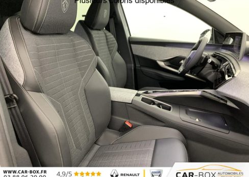 Frein de stationnement électrique, ESP avec aide au démarrage en pente, ABS, Détection de sous-gonflage indirecte, Commutation automatique des feux de route, Essuie-vitre AV à déclenchement automatique, Habitacle et ciel de pavillon Noir, Direction assistée, Accoudoir central, Teintes métallisées : option incluse (valeur : 1 200 Eur TTC), 6 HP (2 tweeters et 2 woofers à l'AV et 2 larges bandes à l'AR), Rétroviseurs extérieurs dégivrants avec réglage et rabattement électriques, éclairage de seuil, Allumage automatique des phares, Hayon motorisé avec accès mains libres, Pédalier et repose pied aluminium, Plancher de coffre modulable 2 positions, Fixations ISOFIX et Top Tether aux places latérales AR, 4 poignées de maintien rétractables (2 à l'AV et 2 à l'AR), Volant chauffant, Sièges AV chauffants, Drive Assist - Régulateur de vitesse adaptatif avec fonction Stop & Go, PEUGEOT i-Toggles virtuels avec 10 raccourcis personnalisables, PEUGEOT i-Connect Advanced Navigation 3D connectée, 4 prises USB: 1 prise USB C (Data & charge) et 1 prise USB C (Charge) à l'AV, 2 prises USB C (Charge) à l'AR, Jantes alliage 19" diamantées Lulea Noir Orbital, vernis brillant, 6 airbags: frontaux conducteur et passager auto-adaptatifs (passager neutralisable par clé), latéraux conducteur et passager AV (thorax et bassin), rideaux aux places AV et AR (tête et thorax), Feux diurnes 3 griffes à LED, Visiopark 1 Caméra de recul & aide au stationnement AV et AR, graphique et sonore, Monogrammes AV: blason PEUGEOT et 3008, Monogrammes AR 3008 et Hybrid, Accès et démarrage mains libres Proximity, Banquette AR avec dossier rabattable 40/20/40, Feux AR 3 griffes à LED 3D, Projecteurs PEUGEOT PIXEL LED Eclairage adaptatif, commutation automatique des feux de route, feux de route avec fonctions anti éblouissement et boost, Monogrammes ailes AV: 'blason PEUGEOT', Toit et becquet AR Black Diamond, Eléments de style intérieure Planche de bord moussée avec décor tissu RIMINI chiné, décor d'alcôve en Aluminium sérigraphié, façade et aérateurs Noir laqué avec décor Cast Iron, Panneaux de portes avec décor tissu RIMINI chiné, décor d'alcôve en Aluminium sérigraphié et jonc Cast Iron, accoudoirs TEP Isabella, surpiqûres Iced Clay à l' AV, Console centrale avec décor tissu RIMINI chiné, façade Noir laqué et jonc Cast Iron, accoudoir tissu RIMINI chiné, Eclairage d'ambiance indirect, jour & nuit sur la planche de bord, les panneaux de portes AV et sous l'écran panoramique 21'', associé aux modes de conduite, personnalisable en 8 couleurs, Seuil de portes AV inox avec lettrage PEUGEOT, Volant compact, cuir fleur lisse et perforé avec commandes intégrées Noir Laqué, décors Cast Iron, surpiqûres Iced Clay, insert Noir laqué avec badge ‘GT', Commutation adaptative des projecteurs, Eléments de style éxterieur Bandeau entre les projecteurs Noir laqué avec logo 3008. Calandre couleur caisse, écopes latérales Noir laqué, décor inférieur Gris Meteor, jupe inférieure Noir grainé. Vitres AR, vitres de custode et lunette AR surteintées. Lécheurs de vitres masqués. Enjoliveurs de passages de roues et protections inférieures de portes Noir grainé. Bandeau entre les feux AR Noir laqué avec lettrage PEUGEOT. Pare chocs AR avec décor Gris Meteor et jupe inférieure Noir grainé, Monogrammes AV et AR, PEUGEOT i-Cockpit panoramique avec écran incurvé et flottant 21'' HD, Sièges AV à réglage en hauteur manuel, Pack 360° Vision and Drive Assist Plus VisioPark 360°: 4 caméras HD, Aide au stationnement AV/AR et latérale Rétroviseurs extérieurs dégivrants à réglage et rabattement électriques, éclairage de seuil Indexation marché AR avec mémorisation Drive Assist Plus 2.0 (conduite semi autonome) Détection de trafic AR Alarme périmétrique, volumique, anti-soulèvement Super-condamnation des ouvrants Recharge smartphone sans fil (15 W) : Alarme (périmétrique, volumétrique et anti-soulèvement) Rétroviseurs extérieurs dégivrants avec réglage et rabattement électriques, éclairage de seuil Recharge smartphone sans fil (puissance 15W) VisioPark 360° 4 caméras HD (AV, AR et latérales), Aide au stationnement AV, AR et latérale (graphique et sonore) Drive Assist Plus 2.0 (conduite semi autonome): Régulateur de vitesse adaptatif avec fonction Stop & Go, Aide au maintien de la position dans la voie, Changement de voie semi automatique Détection de trafic AR Surveillance d'angles morts longue portée et aide au changement de voie, Alerte de trafic AR transversal Indexation à la marche AR avec mémorisation Super-condamnation des ouvrants : option incluse (valeur : 1 300 Eur TTC), Sellerie tissu NEW UZIRIS embossé, accompagnement TEP Isabella, écharpe tissu RIMINI chiné, surpiqûres Iced Clay, 2 prises 12 V (Console centrale, coffre), Contrôle de traction, Boîte de vitesse automatique, séquentielle (6 rapports), Eclairage intérieur Miroirs de courtoisie conducteur et passager occultables éclairés à LED, Pack Safety Plus Régulateur / Limiteur de vitesse, Freinage d'urgence automatique avec alerte risque de collision et protection des usagers de la route vulnérables (piétons, cyclistes,... ) Alerte active de franchissement involontaire de ligne et bas côté, Reconnaissance étendue des panneaux de signalisation et préconisation de vitesse, Alerte attention conducteur : Alerte attention conducteur Régulateur / Limiteur de vitesse Reconnaissance étendue des panneaux de signalisation et préconisation de vitesse Alerte active de franchissement involontaire de ligne et bas côté Freinage d'urgence automatique avec alerte risque de collision pilotée par caméra et radar, PEUGEOT i-Connect Advanced - Connect Plus: Reconnaissance vocale connectée en langage naturel, ChatGPT (Disponibilité ultérieurement) Services de sécurité: alarme connectée (Si véhicule équipé de l'alarme,) Services à distance (Remote Control, Find My