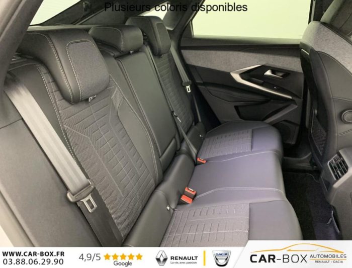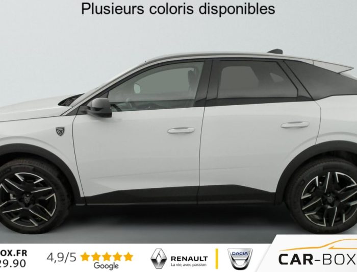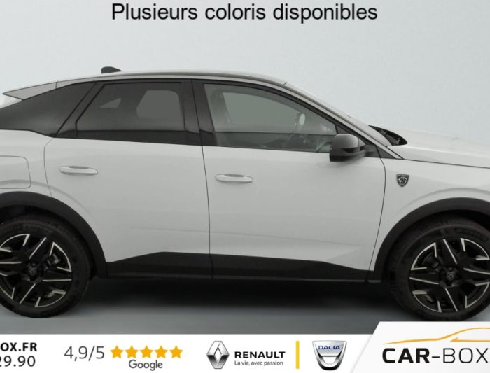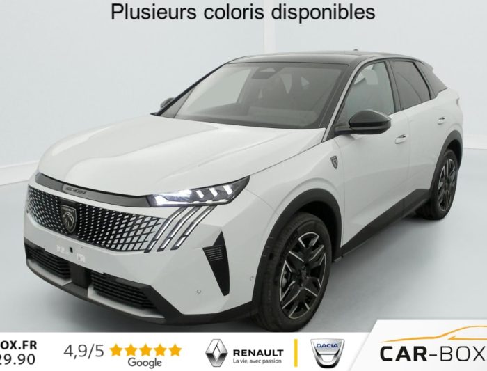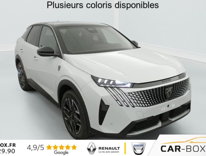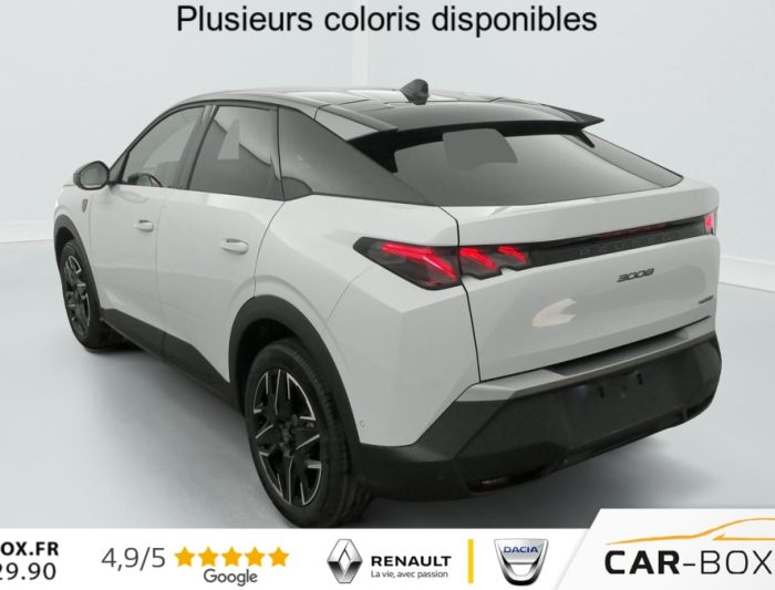 Hors frais de dossierHybrid 145 e-DCS6 GT, hybride, blanc, 29/08/2025, Frein de stationnement électrique, ESP avec aide au démarrage en pente, ABS, Détection de sous-gonflage indirecte, Commutation automatique des feux de route, Essuie-vitre AV à déclenchement automatique, Habitacle et ciel de pavillon Noir, Direction assistée, Accoudoir central, Teintes métallisées : option incluse (valeur : 1 200 Eur TTC), 6 HP (2 tweeters et 2 woofers à l’AV et 2 larges bandes à l’AR), Rétroviseurs extérieurs dégivrants avec réglage et rabattement électriques, éclairage de seuil, Allumage automatique des phares, Hayon motorisé avec accès mains libres, Pédalier et repose pied aluminium, Plancher de coffre modulable 2 positions, Fixations ISOFIX et Top Tether aux places latérales AR, 4 poignées de maintien rétractables (2 à l’AV et 2 à l’AR), Volant chauffant, Sièges AV chauffants, Drive Assist – Régulateur de vitesse adaptatif avec fonction Stop & Go, PEUGEOT i-Toggles virtuels avec 10 raccourcis personnalisables, PEUGEOT i-Connect Advanced Navigation 3D connectée, 4 prises USB: 1 prise USB C (Data & charge) et 1 prise USB C (Charge) à l’AV, 2 prises USB C (Charge) à l’AR, Jantes alliage 19" diamantées Lulea Noir Orbital, vernis brillant, 6 airbags: frontaux conducteur et passager auto-adaptatifs (passager neutralisable par clé), latéraux conducteur et passager AV (thorax et bassin), rideaux aux places AV et AR (tête et thorax), Feux diurnes 3 griffes à LED, Visiopark 1 Caméra de recul & aide au stationnement AV et AR, graphique et sonore, Monogrammes AV: blason PEUGEOT et 3008, Monogrammes AR 3008 et Hybrid, Accès et démarrage mains libres Proximity, Banquette AR avec dossier rabattable 40/20/40, Feux AR 3 griffes à LED 3D, Projecteurs PEUGEOT PIXEL LED Eclairage adaptatif, commutation automatique des feux de route, feux de route avec fonctions anti éblouissement et boost, Monogrammes ailes AV: ‘blason PEUGEOT’, Toit et becquet AR Black Diamond, Eléments de style intérieure Planche de bord moussée avec décor tissu RIMINI chiné, décor d’alcôve en Aluminium sérigraphié, façade et aérateurs Noir laqué avec décor Cast Iron, Panneaux de portes avec décor tissu RIMINI chiné, décor d’alcôve en Aluminium sérigraphié et jonc Cast Iron, accoudoirs TEP Isabella, surpiqûres Iced Clay à l’ AV, Console centrale avec décor tissu RIMINI chiné, façade Noir laqué et jonc Cast Iron, accoudoir tissu RIMINI chiné, Eclairage d’ambiance indirect, jour & nuit sur la planche de bord, les panneaux de portes AV et sous l’écran panoramique 21 », associé aux modes de conduite, personnalisable en 8 couleurs, Seuil de portes AV inox avec lettrage PEUGEOT, Volant compact, cuir fleur lisse et perforé avec commandes intégrées Noir Laqué, décors Cast Iron, surpiqûres Iced Clay, insert Noir laqué avec badge ‘GT’, Commutation adaptative des projecteurs, Eléments de style éxterieur Bandeau entre les projecteurs Noir laqué avec logo 3008. Calandre couleur caisse, écopes latérales Noir laqué, décor inférieur Gris Meteor, jupe inférieure Noir grainé. Vitres AR, vitres de custode et lunette AR surteintées. Lécheurs de vitres masqués. Enjoliveurs de passages de roues et protections inférieures de portes Noir grainé. Bandeau entre les feux AR Noir laqué avec lettrage PEUGEOT. Pare chocs AR avec décor Gris Meteor et jupe inférieure Noir grainé, Monogrammes AV et AR, PEUGEOT i-Cockpit panoramique avec écran incurvé et flottant 21 » HD, Sièges AV à réglage en hauteur manuel, Pack 360° Vision and Drive Assist Plus VisioPark 360°: 4 caméras HD, Aide au stationnement AV/AR et latérale Rétroviseurs extérieurs dégivrants à réglage et rabattement électriques, éclairage de seuil Indexation marché AR avec mémorisation Drive Assist Plus 2.0 (conduite semi autonome) Détection de trafic AR Alarme périmétrique, volumique, anti-soulèvement Super-condamnation des ouvrants Recharge smartphone sans fil (15 W) : Alarme (périmétrique, volumétrique et anti-soulèvement) Rétroviseurs extérieurs dégivrants avec réglage et rabattement électriques, éclairage de seuil Recharge smartphone sans fil (puissance 15W) VisioPark 360° 4 caméras HD (AV, AR et latérales), Aide au stationnement AV, AR et latérale (graphique et sonore) Drive Assist Plus 2.0 (conduite semi autonome): Régulateur de vitesse adaptatif avec fonction Stop & Go, Aide au maintien de la position dans la voie, Changement de voie semi automatique Détection de trafic AR Surveillance d’angles morts longue portée et aide au changement de voie, Alerte de trafic AR transversal Indexation à la marche AR avec mémorisation Super-condamnation des ouvrants : option incluse (valeur : 1 300 Eur TTC), Sellerie tissu NEW UZIRIS embossé, accompagnement TEP Isabella, écharpe tissu RIMINI chiné, surpiqûres Iced Clay, 2 prises 12 V (Console centrale, coffre), Contrôle de traction, Boîte de vitesse automatique, séquentielle (6 rapports), Eclairage intérieur Miroirs de courtoisie conducteur et passager occultables éclairés à LED, Pack Safety Plus Régulateur / Limiteur de vitesse, Freinage d’urgence automatique avec alerte risque de collision et protection des usagers de la route vulnérables (piétons, cyclistes, … ) Alerte active de franchissement involontaire de ligne et bas côté, Reconnaissance étendue des panneaux de signalisation et préconisation de vitesse, Alerte attention conducteur : Alerte attention conducteur Régulateur / Limiteur de vitesse Reconnaissance étendue des panneaux de signalisation et préconisation de vitesse Alerte active de franchissement involontaire de ligne et bas côté Freinage d’urgence automatique avec alerte risque de collision pilotée par caméra et radar, PEUGEOT i-Connect Advanced – Connect Plus: Reconnaissance vocale connectée en langage naturel, ChatGPT (Disponibilité ultérieurement) Services de 