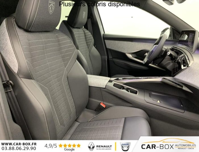 Frein de stationnement électrique, ESP avec aide au démarrage en pente, ABS, Détection de sous-gonflage indirecte, Commutation automatique des feux de route, Essuie-vitre AV à déclenchement automatique, Habitacle et ciel de pavillon Noir, Direction assistée, Accoudoir central, Teintes métallisées : option incluse (valeur : 1 200 Eur TTC), 6 HP (2 tweeters et 2 woofers à l'AV et 2 larges bandes à l'AR), Rétroviseurs extérieurs dégivrants avec réglage et rabattement électriques, éclairage de seuil, Allumage automatique des phares, Hayon motorisé avec accès mains libres, Pédalier et repose pied aluminium, Plancher de coffre modulable 2 positions, Fixations ISOFIX et Top Tether aux places latérales AR, 4 poignées de maintien rétractables (2 à l'AV et 2 à l'AR), Volant chauffant, Sièges AV chauffants, Drive Assist - Régulateur de vitesse adaptatif avec fonction Stop & Go, PEUGEOT i-Toggles virtuels avec 10 raccourcis personnalisables, PEUGEOT i-Connect Advanced Navigation 3D connectée, 4 prises USB: 1 prise USB C (Data & charge) et 1 prise USB C (Charge) à l'AV, 2 prises USB C (Charge) à l'AR, Jantes alliage 19" diamantées Lulea Noir Orbital, vernis brillant, 6 airbags: frontaux conducteur et passager auto-adaptatifs (passager neutralisable par clé), latéraux conducteur et passager AV (thorax et bassin), rideaux aux places AV et AR (tête et thorax), Feux diurnes 3 griffes à LED, Visiopark 1 Caméra de recul & aide au stationnement AV et AR, graphique et sonore, Monogrammes AV: blason PEUGEOT et 3008, Monogrammes AR 3008 et Hybrid, Accès et démarrage mains libres Proximity, Banquette AR avec dossier rabattable 40/20/40, Feux AR 3 griffes à LED 3D, Projecteurs PEUGEOT PIXEL LED Eclairage adaptatif, commutation automatique des feux de route, feux de route avec fonctions anti éblouissement et boost, Monogrammes ailes AV: 'blason PEUGEOT', Toit et becquet AR Black Diamond, Eléments de style intérieure Planche de bord moussée avec décor tissu RIMINI chiné, décor d'alcôve en Aluminium sérigraphié, façade et aérateurs Noir laqué avec décor Cast Iron, Panneaux de portes avec décor tissu RIMINI chiné, décor d'alcôve en Aluminium sérigraphié et jonc Cast Iron, accoudoirs TEP Isabella, surpiqûres Iced Clay à l' AV, Console centrale avec décor tissu RIMINI chiné, façade Noir laqué et jonc Cast Iron, accoudoir tissu RIMINI chiné, Eclairage d'ambiance indirect, jour & nuit sur la planche de bord, les panneaux de portes AV et sous l'écran panoramique 21'', associé aux modes de conduite, personnalisable en 8 couleurs, Seuil de portes AV inox avec lettrage PEUGEOT, Volant compact, cuir fleur lisse et perforé avec commandes intégrées Noir Laqué, décors Cast Iron, surpiqûres Iced Clay, insert Noir laqué avec badge ‘GT', Commutation adaptative des projecteurs, Eléments de style éxterieur Bandeau entre les projecteurs Noir laqué avec logo 3008. Calandre couleur caisse, écopes latérales Noir laqué, décor inférieur Gris Meteor, jupe inférieure Noir grainé. Vitres AR, vitres de custode et lunette AR surteintées. Lécheurs de vitres masqués. Enjoliveurs de passages de roues et protections inférieures de portes Noir grainé. Bandeau entre les feux AR Noir laqué avec lettrage PEUGEOT. Pare chocs AR avec décor Gris Meteor et jupe inférieure Noir grainé, Monogrammes AV et AR, PEUGEOT i-Cockpit panoramique avec écran incurvé et flottant 21'' HD, Sièges AV à réglage en hauteur manuel, Pack 360° Vision and Drive Assist Plus VisioPark 360°: 4 caméras HD, Aide au stationnement AV/AR et latérale Rétroviseurs extérieurs dégivrants à réglage et rabattement électriques, éclairage de seuil Indexation marché AR avec mémorisation Drive Assist Plus 2.0 (conduite semi autonome) Détection de trafic AR Alarme périmétrique, volumique, anti-soulèvement Super-condamnation des ouvrants Recharge smartphone sans fil (15 W) : Alarme (périmétrique, volumétrique et anti-soulèvement) Rétroviseurs extérieurs dégivrants avec réglage et rabattement électriques, éclairage de seuil Recharge smartphone sans fil (puissance 15W) VisioPark 360° 4 caméras HD (AV, AR et latérales), Aide au stationnement AV, AR et latérale (graphique et sonore) Drive Assist Plus 2.0 (conduite semi autonome): Régulateur de vitesse adaptatif avec fonction Stop & Go, Aide au maintien de la position dans la voie, Changement de voie semi automatique Détection de trafic AR Surveillance d'angles morts longue portée et aide au changement de voie, Alerte de trafic AR transversal Indexation à la marche AR avec mémorisation Super-condamnation des ouvrants : option incluse (valeur : 1 300 Eur TTC), Sellerie tissu NEW UZIRIS embossé, accompagnement TEP Isabella, écharpe tissu RIMINI chiné, surpiqûres Iced Clay, 2 prises 12 V (Console centrale, coffre), Contrôle de traction, Boîte de vitesse automatique, séquentielle (6 rapports), Eclairage intérieur Miroirs de courtoisie conducteur et passager occultables éclairés à LED, Pack Safety Plus Régulateur / Limiteur de vitesse, Freinage d'urgence automatique avec alerte risque de collision et protection des usagers de la route vulnérables (piétons, cyclistes,... ) Alerte active de franchissement involontaire de ligne et bas côté, Reconnaissance étendue des panneaux de signalisation et préconisation de vitesse, Alerte attention conducteur : Alerte attention conducteur Régulateur / Limiteur de vitesse Reconnaissance étendue des panneaux de signalisation et préconisation de vitesse Alerte active de franchissement involontaire de ligne et bas côté Freinage d'urgence automatique avec alerte risque de collision pilotée par caméra et radar, PEUGEOT i-Connect Advanced - Connect Plus: Reconnaissance vocale connectée en langage naturel, ChatGPT (Disponibilité ultérieurement) Services de sécurité: alarme connectée (Si véhicule équipé de l'alarme,) Services à distance (Remote Control, Find My
