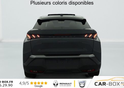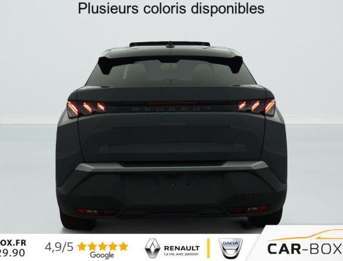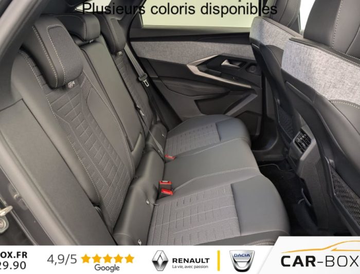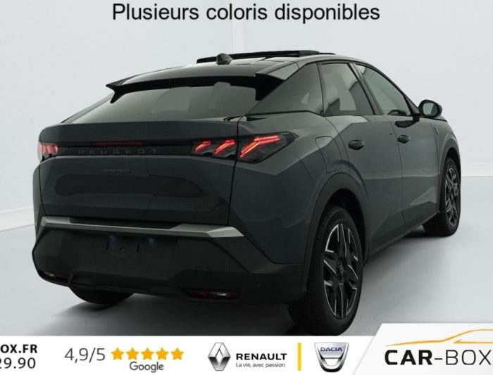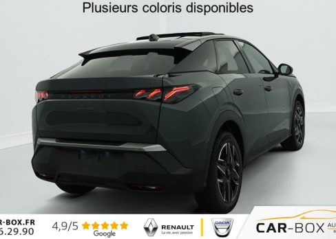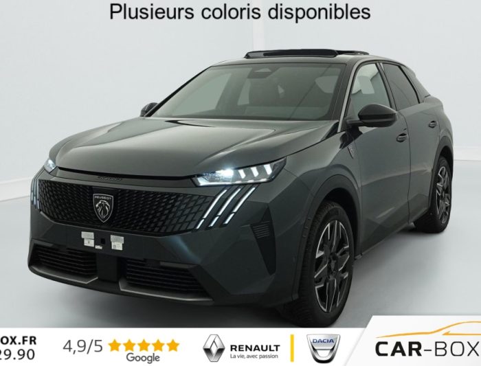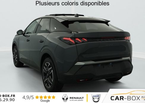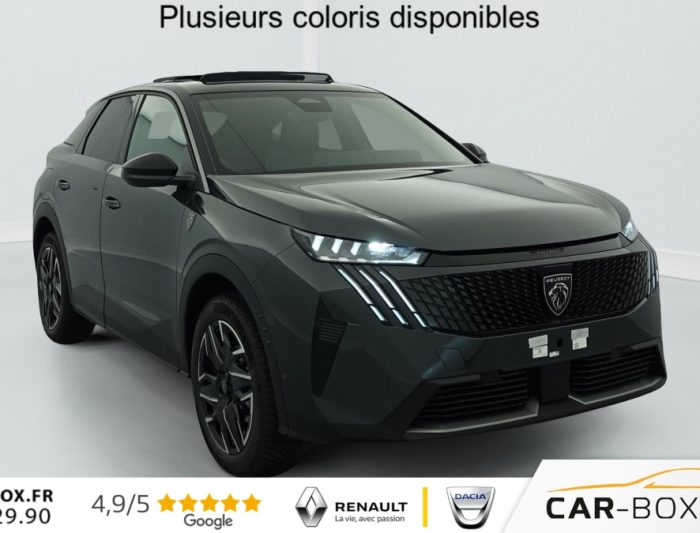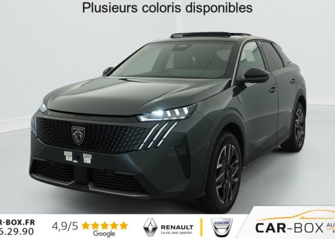 Hors frais de dossierHybrid 145 e-DCS6 GT, hybride, blanc, 26/08/2025, Grip control 4 modes (standard, boue, neige et sable) : option incluse (valeur : 300 Eur TTC), Pare-brise chauffant : option incluse (valeur : 100 Eur TTC), Frein de stationnement électrique, ESP avec aide au démarrage en pente, ABS, Détection de sous-gonflage indirecte, Commutation automatique des feux de route, Essuie-vitre AV à déclenchement automatique, Habitacle et ciel de pavillon Noir, Direction assistée, Accoudoir central, Teintes métallisées : option incluse (valeur : 1 200 Eur TTC), 6 HP (2 tweeters et 2 woofers à l’AV et 2 larges bandes à l’AR), Rétroviseurs extérieurs dégivrants avec réglage et rabattement électriques, éclairage de seuil, Allumage automatique des phares, Hayon motorisé avec accès mains libres, Pédalier et repose pied aluminium, Pack Safety Plus : Alerte attention conducteur Régulateur / Limiteur de vitesse Reconnaissance étendue des panneaux de signalisation et préconisation de vitesse Alerte active de franchissement involontaire de ligne et bas côté Freinage d’urgence automatique avec alerte risque de collision pilotée par caméra et radar, Plancher de coffre modulable 2 positions, Fixations ISOFIX et Top Tether aux places latérales AR, 4 poignées de maintien rétractables (2 à l’AV et 2 à l’AR), Volant chauffant, Sièges AV chauffants, Drive Assist – Régulateur de vitesse adaptatif avec fonction Stop & Go, Pack Hi-Fi Focal : Vitres latérales AV feuilletées acoustiques Système Hi Fi Premium FOCAL 10 HP (4 tweeters, 4 woofers, 1 voie centrale, 1 subwoofer) : option incluse (valeur : 850 Eur TTC), PEUGEOT i-Toggles virtuels avec 10 raccourcis personnalisables, PEUGEOT i-Connect Advanced Navigation 3D connectée, 4 prises USB: 1 prise USB C (Data & charge) et 1 prise USB C (Charge) à l’AV, 2 prises USB C (Charge) à l’AR, Jantes alliage 19" diamantées BREDA Noir Orbital, vernis brillant, 6 airbags: frontaux conducteur et passager auto-adaptatifs (passager neutralisable par clé), latéraux conducteur et passager AV (thorax et bassin), rideaux aux places AV et AR (tête et thorax), Feux diurnes 3 griffes à LED, Visiopark 1 Caméra de recul & aide au stationnement AV et AR, graphique et sonore, Monogrammes AV: blason PEUGEOT et 3008, Monogrammes AR 3008 et Hybrid, Accès et démarrage mains libres Proximity 2 Télécommandes 3 boutons (verrouillage, coffre, déverrouillage), Banquette AR avec dossier rabattable 40/20/40, Feux AR 3 griffes à LED 3D, Projecteurs PEUGEOT PIXEL LED Eclairage adaptatif, commutation automatique des feux de route, feux de route avec fonctions anti éblouissement et boost, Monogrammes ailes AV: ‘blason PEUGEOT’, Toit et becquet AR Black Diamond, Eléments de style intérieure Planche de bord moussée avec décor tissu RIMINI chiné, décor d’alcôve en Aluminium sérigraphié, façade et aérateurs Noir laqué avec décor Cast Iron, Panneaux de portes avec décor tissu RIMINI chiné, décor d’alcôve en Aluminium sérigraphié et jonc Cast Iron, accoudoirs TEP Isabella, surpiqûres Iced Clay à l’ AV, Console centrale avec décor tissu RIMINI chiné, façade Noir laqué et jonc Cast Iron, accoudoir tissu RIMINI chiné, Eclairage d’ambiance indirect, jour & nuit sur la planche de bord, les panneaux de portes AV et sous l’écran panoramique 21 », associé aux modes de conduite, personnalisable en 8 couleurs, Seuil de portes AV inox avec lettrage PEUGEOT, Volant compact, cuir fleur lisse et perforé avec commandes intégrées Noir Laqué, décors Cast Iron, surpiqûres Iced Clay, insert Noir laqué avec badge ‘GT’, Commutation adaptative des projecteurs, Eléments de style éxterieur Bandeau entre les projecteurs Noir laqué avec logo 3008. Calandre couleur caisse, écopes latérales Noir laqué, décor inférieur Gris Meteor, jupe inférieure Noir grainé. Vitres AR, vitres de custode et lunette AR surteintées. Lécheurs de vitres masqués. Enjoliveurs de passages de roues et protections inférieures de portes Noir grainé. Bandeau entre les feux AR Noir laqué avec lettrage PEUGEOT. Pare chocs AR avec décor Gris Meteor et jupe inférieure Noir grainé, Monogrammes AV et AR, PEUGEOT i-Cockpit panoramique avec écran incurvé et flottant 21 » HD, Sièges AV à réglage en hauteur manuel, Pack 360° Vision and Drive Assist Plus : Alarme (périmétrique, volumétrique et anti-soulèvement) Rétroviseurs extérieurs dégivrants avec réglage et rabattement électriques, éclairage de seuil Recharge smartphone sans fil (puissance 15W) VisioPark 360° 4 caméras HD (AV, AR et latérales), Aide au stationnement AV, AR et latérale (graphique et sonore) Drive Assist Plus 2.0 (conduite semi autonome): Régulateur de vitesse adaptatif avec fonction Stop & Go, Aide au maintien de la position dans la voie, Changement de voie semi automatique Détection de trafic AR Surveillance d’angles morts longue portée et aide au changement de voie, Alerte de trafic AR transversal Indexation à la marche AR avec mémorisation Super-condamnation des ouvrants : option incluse (valeur : 1 300 Eur TTC), Pack Toit ouvrant : Clean cabin avec capteur de particules dans l’habitacle Toit ouvrant panoramique et velum intérieur à commandes impulsionnelles : option incluse (valeur : 1 250 Eur TTC), Sellerie tissu NEW UZIRIS embossé, accompagnement TEP Isabella, écharpe tissu RIMINI chiné, surpiqûres Iced Clay, 2 prises 12 V (Console centrale, coffre), Contrôle de traction, Boîte de vitesse automatique, séquentielle (6 rapports), Eclairage intérieur Miroirs de courtoisie conducteur et passager occultables éclairés à LED, Vitres AV électriques, Air conditionné automatique bi-zone, Pare-brise feuilleté acoustique, Lève-vitres AV/AR électriques et séquentiels avec antipincement, Siège conducteur à réglage lombaire manuel