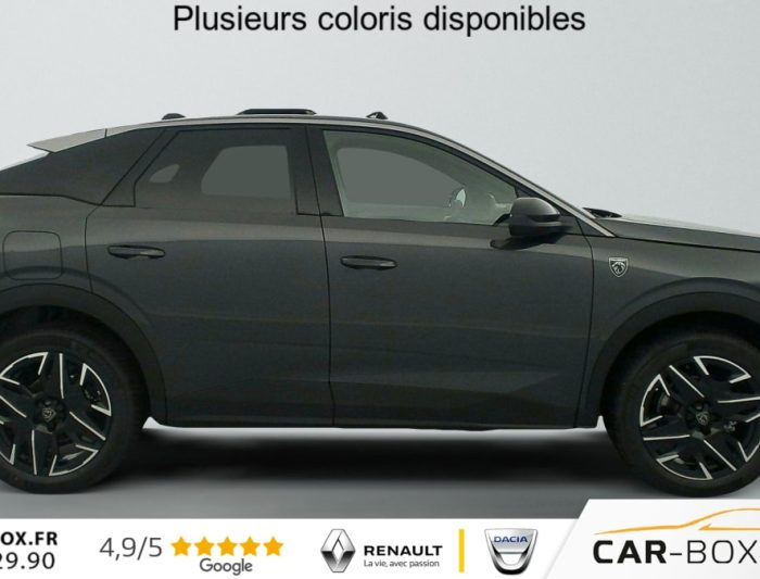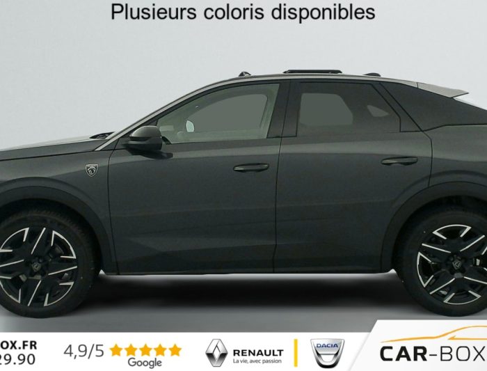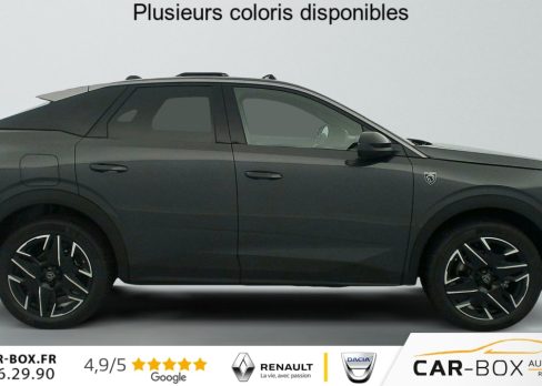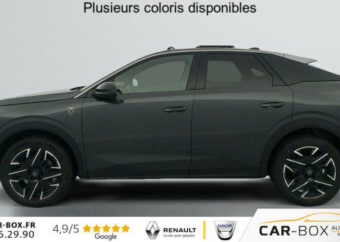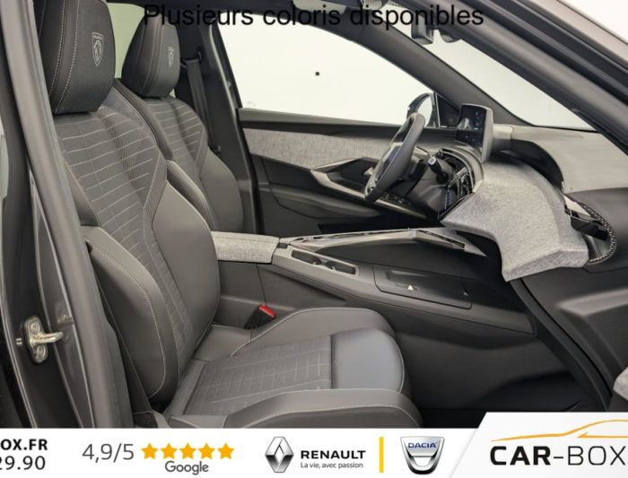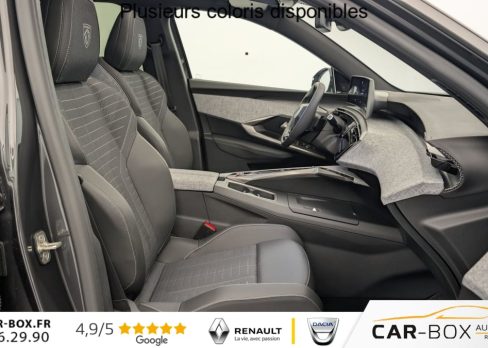 Grip control 4 modes (standard, boue, neige et sable) : option incluse (valeur : 300 Eur TTC), Pare-brise chauffant : option incluse (valeur : 100 Eur TTC), Frein de stationnement électrique, ESP avec aide au démarrage en pente, ABS, Détection de sous-gonflage indirecte, Commutation automatique des feux de route, Essuie-vitre AV à déclenchement automatique, Habitacle et ciel de pavillon Noir, Direction assistée, Accoudoir central, Teintes métallisées : option incluse (valeur : 1 200 Eur TTC), 6 HP (2 tweeters et 2 woofers à l'AV et 2 larges bandes à l'AR), Rétroviseurs extérieurs dégivrants avec réglage et rabattement électriques, éclairage de seuil, Allumage automatique des phares, Hayon motorisé avec accès mains libres, Pédalier et repose pied aluminium, Pack Safety Plus : Alerte attention conducteur Régulateur / Limiteur de vitesse Reconnaissance étendue des panneaux de signalisation et préconisation de vitesse Alerte active de franchissement involontaire de ligne et bas côté Freinage d'urgence automatique avec alerte risque de collision pilotée par caméra et radar, Plancher de coffre modulable 2 positions, Fixations ISOFIX et Top Tether aux places latérales AR, 4 poignées de maintien rétractables (2 à l'AV et 2 à l'AR), Volant chauffant, Sièges AV chauffants, Drive Assist - Régulateur de vitesse adaptatif avec fonction Stop & Go, Pack Hi-Fi Focal : Vitres latérales AV feuilletées acoustiques Système Hi Fi Premium FOCAL 10 HP (4 tweeters, 4 woofers, 1 voie centrale, 1 subwoofer) : option incluse (valeur : 850 Eur TTC), PEUGEOT i-Toggles virtuels avec 10 raccourcis personnalisables, PEUGEOT i-Connect Advanced Navigation 3D connectée, 4 prises USB: 1 prise USB C (Data & charge) et 1 prise USB C (Charge) à l'AV, 2 prises USB C (Charge) à l'AR, Jantes alliage 19" diamantées BREDA Noir Orbital, vernis brillant, 6 airbags: frontaux conducteur et passager auto-adaptatifs (passager neutralisable par clé), latéraux conducteur et passager AV (thorax et bassin), rideaux aux places AV et AR (tête et thorax), Feux diurnes 3 griffes à LED, Visiopark 1 Caméra de recul & aide au stationnement AV et AR, graphique et sonore, Monogrammes AV: blason PEUGEOT et 3008, Monogrammes AR 3008 et Hybrid, Accès et démarrage mains libres Proximity 2 Télécommandes 3 boutons (verrouillage, coffre, déverrouillage), Banquette AR avec dossier rabattable 40/20/40, Feux AR 3 griffes à LED 3D, Projecteurs PEUGEOT PIXEL LED Eclairage adaptatif, commutation automatique des feux de route, feux de route avec fonctions anti éblouissement et boost, Monogrammes ailes AV: 'blason PEUGEOT', Toit et becquet AR Black Diamond, Eléments de style intérieure Planche de bord moussée avec décor tissu RIMINI chiné, décor d'alcôve en Aluminium sérigraphié, façade et aérateurs Noir laqué avec décor Cast Iron, Panneaux de portes avec décor tissu RIMINI chiné, décor d'alcôve en Aluminium sérigraphié et jonc Cast Iron, accoudoirs TEP Isabella, surpiqûres Iced Clay à l' AV, Console centrale avec décor tissu RIMINI chiné, façade Noir laqué et jonc Cast Iron, accoudoir tissu RIMINI chiné, Eclairage d'ambiance indirect, jour & nuit sur la planche de bord, les panneaux de portes AV et sous l'écran panoramique 21'', associé aux modes de conduite, personnalisable en 8 couleurs, Seuil de portes AV inox avec lettrage PEUGEOT, Volant compact, cuir fleur lisse et perforé avec commandes intégrées Noir Laqué, décors Cast Iron, surpiqûres Iced Clay, insert Noir laqué avec badge ‘GT', Commutation adaptative des projecteurs, Eléments de style éxterieur Bandeau entre les projecteurs Noir laqué avec logo 3008. Calandre couleur caisse, écopes latérales Noir laqué, décor inférieur Gris Meteor, jupe inférieure Noir grainé. Vitres AR, vitres de custode et lunette AR surteintées. Lécheurs de vitres masqués. Enjoliveurs de passages de roues et protections inférieures de portes Noir grainé. Bandeau entre les feux AR Noir laqué avec lettrage PEUGEOT. Pare chocs AR avec décor Gris Meteor et jupe inférieure Noir grainé, Monogrammes AV et AR, PEUGEOT i-Cockpit panoramique avec écran incurvé et flottant 21'' HD, Sièges AV à réglage en hauteur manuel, Pack 360° Vision and Drive Assist Plus : Alarme (périmétrique, volumétrique et anti-soulèvement) Rétroviseurs extérieurs dégivrants avec réglage et rabattement électriques, éclairage de seuil Recharge smartphone sans fil (puissance 15W) VisioPark 360° 4 caméras HD (AV, AR et latérales), Aide au stationnement AV, AR et latérale (graphique et sonore) Drive Assist Plus 2.0 (conduite semi autonome): Régulateur de vitesse adaptatif avec fonction Stop & Go, Aide au maintien de la position dans la voie, Changement de voie semi automatique Détection de trafic AR Surveillance d'angles morts longue portée et aide au changement de voie, Alerte de trafic AR transversal Indexation à la marche AR avec mémorisation Super-condamnation des ouvrants : option incluse (valeur : 1 300 Eur TTC), Pack Toit ouvrant : Clean cabin avec capteur de particules dans l'habitacle Toit ouvrant panoramique et velum intérieur à commandes impulsionnelles : option incluse (valeur : 1 250 Eur TTC), Sellerie tissu NEW UZIRIS embossé, accompagnement TEP Isabella, écharpe tissu RIMINI chiné, surpiqûres Iced Clay, 2 prises 12 V (Console centrale, coffre), Contrôle de traction, Boîte de vitesse automatique, séquentielle (6 rapports), Eclairage intérieur Miroirs de courtoisie conducteur et passager occultables éclairés à LED, Vitres AV électriques, Air conditionné automatique bi-zone, Pare-brise feuilleté acoustique, Lève-vitres AV/AR électriques et séquentiels avec antipincement, Siège conducteur à réglage lombaire manuel