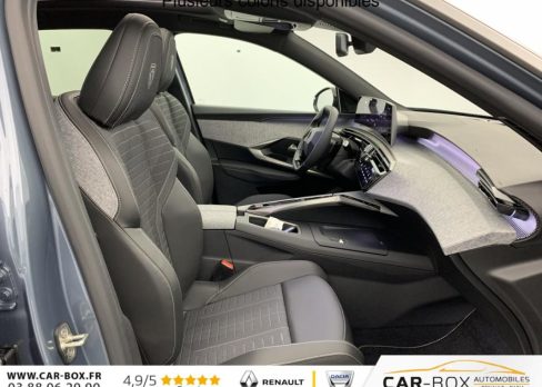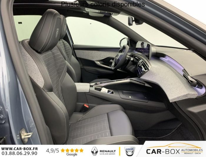 Véhicule livré sans kit de dépannage ni roue de secours, Frein de stationnement électrique, ESP avec aide au démarrage en pente, ABS, Détection de sous-gonflage indirecte, Essuie-vitre AV à déclenchement automatique, Direction assistée, Accoudoir central, Teintes métallisées : option incluse (valeur : 1 200 Eur TTC), 6 HP (2 tweeters et 2 woofers à l'AV et 2 larges bandes à l'AR), Rétroviseurs extérieurs dégivrants avec réglage et rabattement électriques, éclairage de seuil, Allumage automatique des phares, Hayon motorisé avec accès mains libres, Pédalier et repose pied aluminium, Plancher de coffre modulable 2 positions, Fixations ISOFIX et Top Tether aux places latérales AR, 4 poignées de maintien rétractables (2 à l'AV et 2 à l'AR), Volant chauffant, Sièges AV chauffants, PEUGEOT i-Toggles virtuels avec 10 raccourcis personnalisables, PEUGEOT i-Connect Advanced Navigation 3D connectée, 4 prises USB: 1 prise USB C (Data & charge) et 1 prise USB C (Charge) à l'AV, 2 prises USB C (Charge) à l'AR, Jantes alliage 19" diamantées BREDA Noir Orbital, vernis brillant, 6 airbags: frontaux conducteur et passager auto-adaptatifs (passager neutralisable par clé), latéraux conducteur et passager AV (thorax et bassin), rideaux aux places AV et AR (tête et thorax), Feux diurnes 3 griffes à LED, Accès et démarrage mains libres Proximity 2 Télécommandes 3 boutons (verrouillage, coffre, déverrouillage), Banquette AR avec dossier rabattable 40/20/40, Feux AR 3 griffes à LED 3D, Projecteurs PEUGEOT PIXEL LED Eclairage adaptatif, commutation automatique des feux de route, feux de route avec fonctions anti éblouissement et boost, Toit et becquet AR Black Diamond, Eclairage d'ambiance indirect, jour & nuit sur la planche de bord, les panneaux de portes AV et sous l'écran panoramique 21'', associé aux modes de conduite, personnalisable en 8 couleurs, Volant compact, cuir fleur lisse et perforé avec commandes intégrées Noir Laqué, décors Cast Iron, surpiqûres Iced Clay, insert Noir laqué avec badge ‘GT', Commutation adaptative des projecteurs, PEUGEOT i-Cockpit panoramique avec écran incurvé et flottant 21'' HD, Sièges AV à réglage en hauteur manuel, Pack 360° Vision and Drive Assist Plus : Alarme (périmétrique, volumétrique et anti-soulèvement) Rétroviseurs extérieurs dégivrants avec réglage et rabattement électriques, éclairage de seuil Recharge smartphone sans fil (puissance 15W) VisioPark 360° 4 caméras HD (AV, AR et latérales), Aide au stationnement AV, AR et latérale (graphique et sonore) Drive Assist Plus 2.0 (conduite semi autonome): Régulateur de vitesse adaptatif avec fonction Stop & Go, Aide au maintien de la position dans la voie, Changement de voie semi automatique Détection de trafic AR Surveillance d'angles morts longue portée et aide au changement de voie, Alerte de trafic AR transversal Indexation à la marche AR avec mémorisation Super-condamnation des ouvrants : option incluse (valeur : 1 300 Eur TTC), Pack Toit ouvrant : Clean cabin avec capteur de particules dans l'habitacle Toit ouvrant panoramique et velum intérieur à commandes impulsionnelles : option incluse (valeur : 1 250 Eur TTC), Sellerie tissu NEW UZIRIS embossé, accompagnement TEP Isabella, écharpe tissu RIMINI chiné, surpiqûres Iced Clay, 2 prises 12 V (Console centrale, coffre), Contrôle de traction, Boîte de vitesse automatique, séquentielle (6 rapports), Eclairage intérieur Miroirs de courtoisie conducteur et passager occultables éclairés à LED, Pack Safety Plus : Alerte attention conducteur Régulateur / Limiteur de vitesse Reconnaissance étendue des panneaux de signalisation et préconisation de vitesse Alerte active de franchissement involontaire de ligne et bas côté Freinage d'urgence automatique avec alerte risque de collision pilotée par caméra et radar, Vitres AV électriques, Air conditionné automatique bi-zone, Pare-brise feuilleté acoustique, Lève-vitres AV/AR électriques et séquentiels avec antipincement, Siège conducteur à réglage lombaire manuel