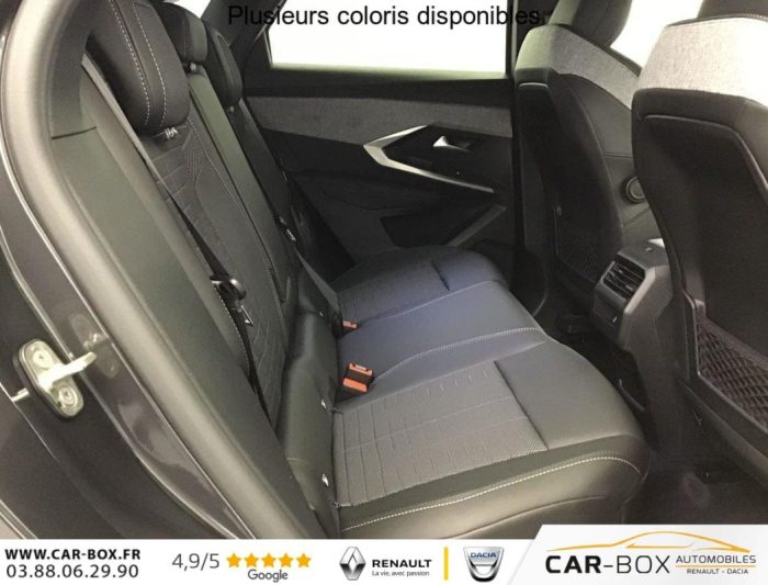 ABS, Accès et démarrage mains libres, Accoudoir arrière, Aide à la conduite avancée (conduite semi-autonome), Aide au démarrage en cote, Aide au maintien dans la file (LKAS), Aide au stationnement arrière, Aide au stationnement avant, Apple CarPlay + AndroidAuto, Avertissement d'angle mort'', Avertissement de fatigue, Avertissement de survitesse, Avertissement de trafic arrière, Banquette arrière rabattable (1/3 - 2/3), Bluetooth, Caméra de recul, Caméra 360°, Capteur de lumière, Chargeur à induction pour smartphones, Climatisation automatique bizone, Détecteur de pluie, Ecran miroir (connectivité smartphone via Mirrorscreen), Frein de stationnement électrique, Freinage actif d'urgence, Hayon électrique, Intérieur simili/tissus, Jantes en aluminium 19'', kit de réparation, Peinture métallisée, Peugeot i-Cockpit, Phares à LED, Prise 12 V, Programme de stabilité électronique (ESP), Radio DAB, Reconnaissance des panneaux de signalisation, Régulateur de vitesse adaptatif, Rétroviseurs extérieurs à réglage électrique, Rétroviseurs extérieurs chauffants, Rétroviseurs extérieurs électriques et chauffants, Rétroviseurs extérieurs noirs, Rétroviseurs extérieurs rabattables électriquement, Rétroviseurs extérieurs rabattables électriquement, Sélecteur de mode de conduite (Drive Mode), Siège conducteur à réglage lombaire, Sièges avant chauffants, Système d'alarme, Système d'attache Isofix , Système de limitation de vitesse, Système de navigation, Tapis avant & arrière, Toit en couleur Noir, USB, Vitres arrières surteintées, Vitres électriques avant et arrière, Volant chauffant