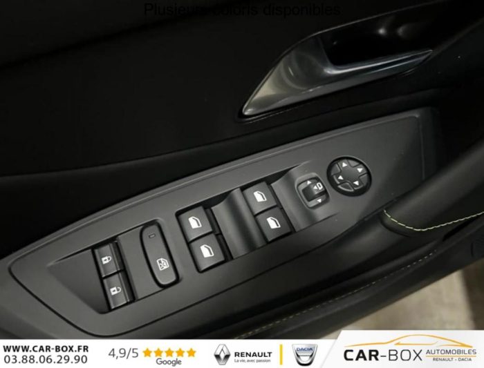 Jantes alliage 18, Frein de stationnement électrique, Système Start & Stop, Peugeot Connect SOS & Assistance, Ciel de pavillon noir, ABS, Détection de sous gonflage, Caméra de recul, Aide au stationnement AR, Vitres latérales AR et lunette AR surteintées, Surtapis AV/AR, Banquette AR rabattable 1/3-2/3, Alerte attention conducteur, Commutation automatique des feux de route, Régulateur / Limiteur de vitesse, Accès et démarrage mains libres, Rétroviseur intérieur photosensible, Ceintures de sécurité AR 3 points à enrouleur (x3) avec prétensionneurs et limiteurs d'effort aux places latérales, Airbags frontaux conducteur et passager adaptatifs (passager neutralisable par clé), airbags latéraux conducteur et passager AV. airbags rideaux de tête aux places AV/AR, Essuie-vitre AV à déclenchement automatique, Seuils de porte AV aluminium, Active Safety Brake (freinage automatique d'urgence), Alerte active de franchissement involontaire de ligne et bas côté, Coques de rétroviseurs extérieurs Noir Brillant, Allumage automatique des feux de croisement, Bandeau entre feux AR Noir Brillant, Reconnaissance étendue des panneaux de signalisation, 2 télécommandes 3 boutons, Sélecteur mode de conduite Eco et Sport, Lève-vitres électriques AV/ AR et séquentiels avec anti-pincement, Rétroviseurs extérieurs électriques, dégivrants et rabattables électriquement, avec répétiteurs de feux clignotants à LED, Peugeot i-Cockpit avec combiné d'instrumentation numérique 10'' personnalisable, Jupe AR Noir Brillant avec décors chromés, Diffuseurs d'air aux places AR, Smart Multidrive: personnalisation du combiné et éclairage d'ambiance LED intérieur associés aux modes de conduite, Projecteurs Peugeot Matrix LED, Feux AR spécifiques avec allumage dynamique griffe à griffe, Calandre AV spécifique Noir verni avec inserts chromés et écopes Noir Brillant, Elargisseurs de pare chocs AV et de bas de caisse latéraux, Monogrammes latéraux emblème Lion, Décor Alu sur panneaux de porte, Feux diurnes à LED sous projecteurs nouvelle signature Peugeot, Eclairage d'ambiance (8 couleurs), 2 prises USB-C à l'AR, Fonction Mirror Screen (Apple CarPlay/Android Auto) sans fil, Ceintures de sécurité AV 3 points à enrouleur, avec prétensionneurs et limiteurs d'effort, 2 prises USB-C à l'AV, Fixations ISOFIX aux 2 places latérales AR (Top Tether), Lécheurs de vitres Noir Brillant, ESP avec fonction Hill Assist (Aide au démarrage en pente), Accoudoir central AV avec compartiment de rangement, Pare-brise teinté feuilleté acoustique, Volant avec réglage manuel en hauteur et en profondeur, Aide au stationnement AV, Navigation connectée avec écran central tactile 10'' et i-Toggles virtuels personnalisables, Teintes métallisées : option incluse (valeur : 900 Eur TTC), Teintes métallisées : option incluse (valeur : 900 Eur TTC), Garnissage tri-matières TEP/Tissu New Belomka, Planche de bord avec jonc transversal peint, décor Alu et surpiqûres Vert, 4 poignées de maintien, Driver Sport Pack - Personnalisation du combiné spécifique - Sonorité du moteur amplifiée et plus sportive (désactivable) : Personnalisation du combiné spécifique Sonorité du moteur amplifiée et plus sportive (désactivable) , Pack Drive Assist - Régulateur de vitesse adaptatif avec fonction Stop&Go Maintient automatiquement la vitesse du véhicule à la vitesse de référence définie par le conducteur, et ajuste automatiquement la vitesse du véhicule pour garder une distance de sé : Régulateur de vitesse adaptatif avec fonction Stop&Go , Pack Safety Plus Active Safety Brake piloté par caméra et radar : Active Safety Brake piloté par caméra et radar , Pédalier Sport et repose pied en aluminium, Réglage lombaire du siège conducteur, Pack Sensation Système Hi-Fi Premium FOCAL - La signature acoustique française : Technologies exclusives FOCAL 10 HP, Toit ouvrant électrique avec velum, Recharge smartphone par induction : Recharge smartphone par induction Système Hi Fi Premium FOCAL 10 HP Toit ouvrant électrique avec velum : option incluse (valeur : 1 800 Eur TTC), Contrôle de traction, Boîte de vitesse automatique (8 rapports), Siège conducteur réglable en hauteur, Siège passager réglable en hauteur, Vitres AV électriques, Volant cuir, Direction assistée électrique, Air conditionné automatique bi-zone, Prise 12V à l'AV