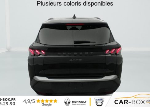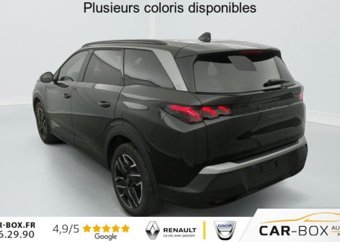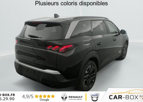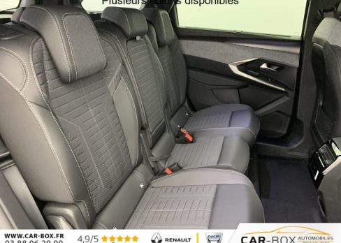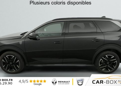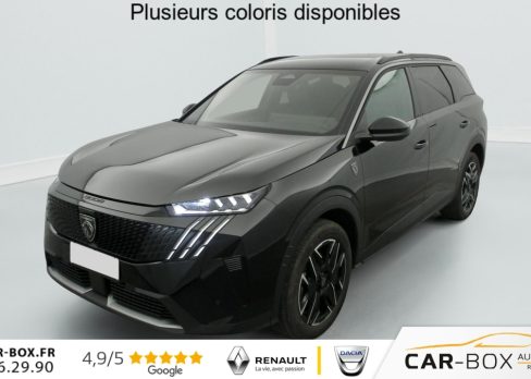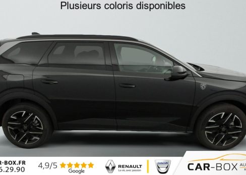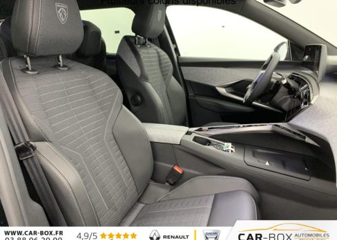 Frein de stationnement électrique, ESP avec aide au démarrage en pente, Condamnation centralisée, ABS, Détection de sous-gonflage indirecte, Sièges AV chauffants, Direction assistée, Teintes métallisées : option incluse (valeur : 1 200 Eur TTC), 6 HP (2 tweeters et 2 woofers à l'AV et 2 larges bandes à l'AR), Essuie-vitre AV à déclenchement automatique, Rétroviseurs extérieurs dégivrants avec réglage et rabattement électriques, éclairage de seuil, Allumage automatique des phares, Hayon motorisé avec accès mains libres, Pédalier et repose pied aluminium, Pack Safety Plus : Alerte attention conducteur Régulateur / Limiteur de vitesse Reconnaissance étendue des panneaux de signalisation et préconisation de vitesse Alerte active de franchissement involontaire de ligne et bas côté Freinage d'urgence automatique avec alerte risque de collision pilotée par caméra et radar, Plancher de coffre modulable 2 positions, Volant chauffant, Drive Assist - Régulateur de vitesse adaptatif avec fonction Stop & Go, PEUGEOT i-Toggles virtuels avec 10 raccourcis personnalisables, Feux diurnes 3 griffes à LED, Vitres AR, custodes et lunette AR teintées, Feux AR 3 griffes à LED 3D, Projecteurs PEUGEOT PIXEL LED Eclairage adaptatif, commutation automatique des feux de route, feux de route avec fonctions anti éblouissement et boost, Toit et becquet AR Black Diamond, Volant compact, cuir fleur lisse et perforé avec commandes intégrées Noir Laqué, décors Cast Iron, surpiqûres Iced Clay, insert Noir laqué avec badge ‘GT', Commutation adaptative des projecteurs, Visiopark 1: caméra de recul HD & aide au stationnement AV/AR, graphique et sonore, Fixations ISOFIX et Top Tether aux places latérales rang 2, PEUGEOT i-Cockpit panoramique avec écran incurvé et flottant 21'' HD, PEUGEOT i-Connect Advanced Navigation 3D connectée, 4 prises USB: 1 prise USB C (Data & charge) et 1 prise USB C (Charge) à l'AV, 2 prises USB C (Charge) à l'AR, Bandeau entre les projecteurs Noir laqué avec logo '5008', Bandeau entre les feux AR Noir laqué avec lettrage 'PEUGEOT', Air conditionné automatique tri-zone, Stores pare soleil intégrés dans les portes AR, Banquette rang 2 avec accoudoir central, Banquette rang 2 coulissante 60/40, avec dossiers inclinables et rabattables 40/20/40, avec fonction Easy Access aux places du rang 3, Banquette 2 places au rang 3 avec dossiers rabattables 50/50, Kit de dépannage de pneumatique: Compresseur 12 volts, flacon de produit de colmatage, anneau de remorquage, deux cales de roue : option incluse (valeur : 20 Eur TTC), Sellerie tissu NEW UZIRIS embossé, accompagnement TEP Isabella, écharpe tissu RIMINI chiné, surpiqûres Iced Clay, 2 prises 12 V (Console centrale, coffre), Rétroviseur intérieur électrochrome, 6 airbags: Frontaux conducteur et passager (passager neutralisable par clé), latéraux conducteur et passager AV (thorax et bassin), rideaux aux places AV et AR (tête et thorax), Eclairage d'ambiance indirect, jour & nuit sur la planche de bord, les panneaux de portes AV/AR et sous l'écran panoramique 21'', associé aux modes de conduite, personnalisable en 8 couleurs, Siège conducteur et passager avec réglage en hauteur manuel, Contrôle de traction, Boîte de vitesse automatique, séquentielle (6 rapports), Contrôle de la pression des pneus, Jantes alliage 19" diamantées BREDA Noir Orbital, vernis brillant, 4 poignées de maintien rétractables, Accès et démarrage mains libres Proximity 2 Télécommandes 3 boutons (verrouillage, coffre, déverrouillage), Barres de toit longitudinales Noir Brillant, Eclairage intérieur Miroirs de courtoisie conducteur et passager occultables éclairés à LED, Plafonnier AV et lisseuses AR DOME à LED, Pare-brise feuilleté acoustique, Lève-vitres AV/AR électriques et séquentiels avec antipincement, Siège conducteur à réglage lombaire manuel