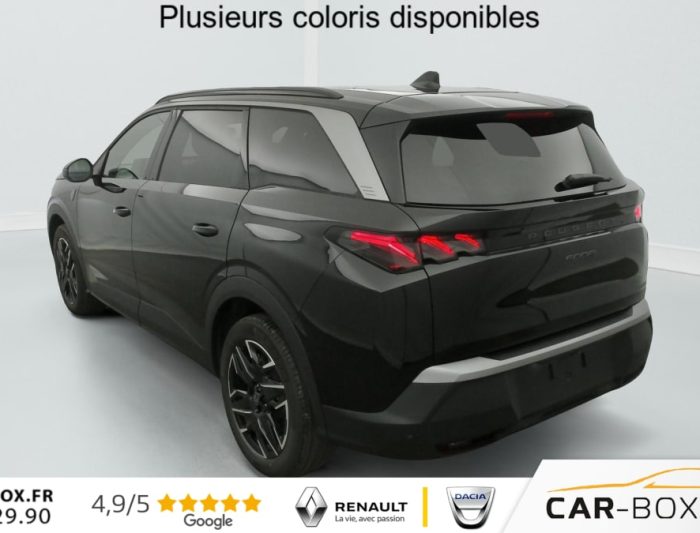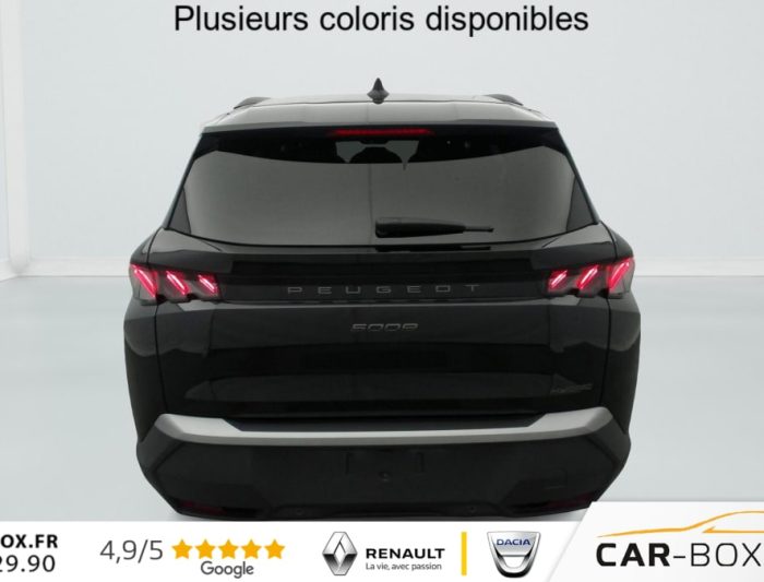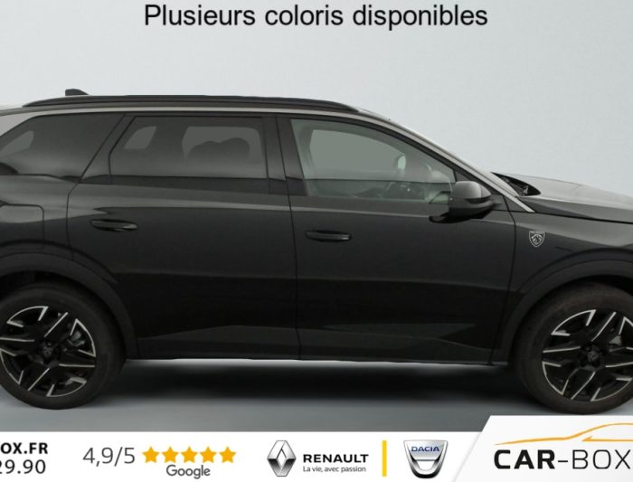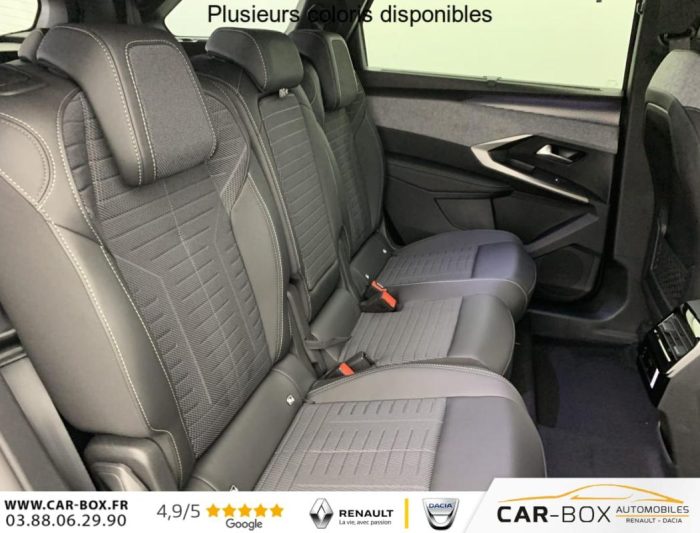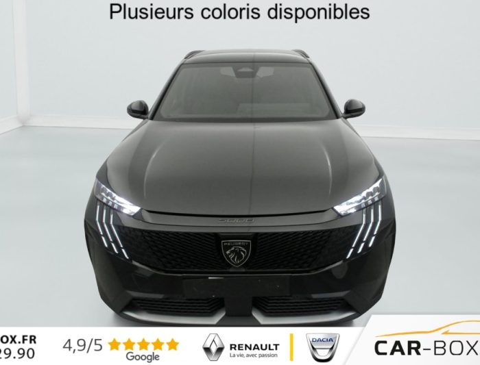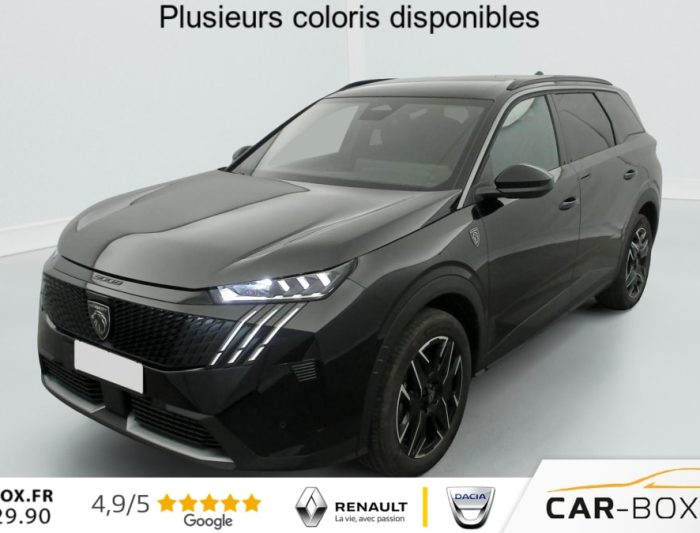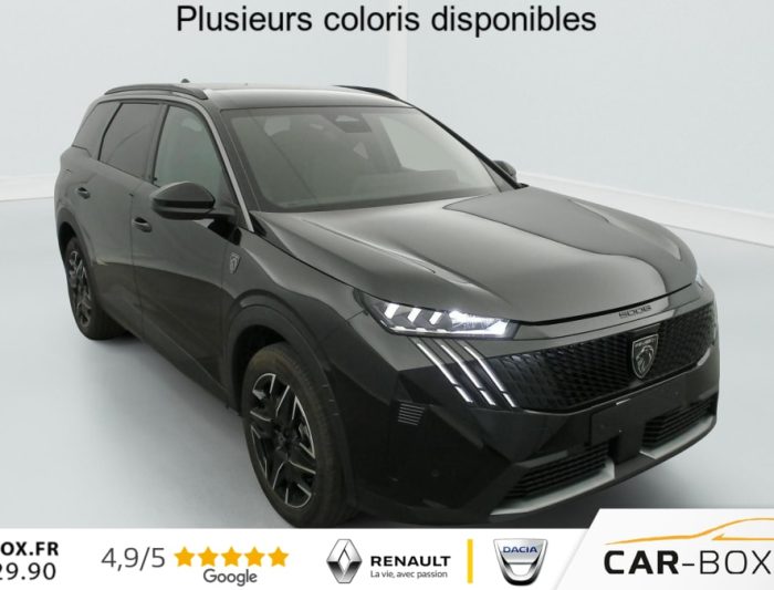Frein de stationnement électrique, ESP avec aide au démarrage en pente, Condamnation centralisée, ABS, Détection de sous-gonflage indirecte, Sièges AV chauffants, Direction assistée, Teintes métallisées : option incluse (valeur : 1 200 Eur TTC), 6 HP (2 tweeters et 2 woofers à l'AV et 2 larges bandes à l'AR), Essuie-vitre AV à déclenchement automatique, Rétroviseurs extérieurs dégivrants avec réglage et rabattement électriques, éclairage de seuil, Allumage automatique des phares, Hayon motorisé avec accès mains libres, Pédalier et repose pied aluminium, Pack Safety Plus : Alerte attention conducteur Régulateur / Limiteur de vitesse Reconnaissance étendue des panneaux de signalisation et préconisation de vitesse Alerte active de franchissement involontaire de ligne et bas côté Freinage d'urgence automatique avec alerte risque de collision pilotée par caméra et radar, Plancher de coffre modulable 2 positions, Volant chauffant, Drive Assist - Régulateur de vitesse adaptatif avec fonction Stop & Go, PEUGEOT i-Toggles virtuels avec 10 raccourcis personnalisables, Feux diurnes 3 griffes à LED, Vitres AR, custodes et lunette AR teintées, Feux AR 3 griffes à LED 3D, Projecteurs PEUGEOT PIXEL LED Eclairage adaptatif, commutation automatique des feux de route, feux de route avec fonctions anti éblouissement et boost, Toit et becquet AR Black Diamond, Volant compact, cuir fleur lisse et perforé avec commandes intégrées Noir Laqué, décors Cast Iron, surpiqûres Iced Clay, insert Noir laqué avec badge ‘GT', Commutation adaptative des projecteurs, Visiopark 1: caméra de recul HD & aide au stationnement AV/AR, graphique et sonore, Fixations ISOFIX et Top Tether aux places latérales rang 2, PEUGEOT i-Cockpit panoramique avec écran incurvé et flottant 21'' HD, PEUGEOT i-Connect Advanced Navigation 3D connectée, 4 prises USB: 1 prise USB C (Data & charge) et 1 prise USB C (Charge) à l'AV, 2 prises USB C (Charge) à l'AR, Bandeau entre les projecteurs Noir laqué avec logo '5008', Bandeau entre les feux AR Noir laqué avec lettrage 'PEUGEOT', Air conditionné automatique tri-zone, Stores pare soleil intégrés dans les portes AR, Banquette rang 2 avec accoudoir central, Banquette rang 2 coulissante 60/40, avec dossiers inclinables et rabattables 40/20/40, avec fonction Easy Access aux places du rang 3, Banquette 2 places au rang 3 avec dossiers rabattables 50/50, Kit de dépannage de pneumatique: Compresseur 12 volts, flacon de produit de colmatage, anneau de remorquage, deux cales de roue : option incluse (valeur : 20 Eur TTC), Sellerie tissu NEW UZIRIS embossé, accompagnement TEP Isabella, écharpe tissu RIMINI chiné, surpiqûres Iced Clay, 2 prises 12 V (Console centrale, coffre), Rétroviseur intérieur électrochrome, 6 airbags: Frontaux conducteur et passager (passager neutralisable par clé), latéraux conducteur et passager AV (thorax et bassin), rideaux aux places AV et AR (tête et thorax), Eclairage d'ambiance indirect, jour & nuit sur la planche de bord, les panneaux de portes AV/AR et sous l'écran panoramique 21'', associé aux modes de conduite, personnalisable en 8 couleurs, Siège conducteur et passager avec réglage en hauteur manuel, Contrôle de traction, Boîte de vitesse automatique, séquentielle (6 rapports), Contrôle de la pression des pneus, Jantes alliage 19" diamantées BREDA Noir Orbital, vernis brillant, 4 poignées de maintien rétractables, Accès et démarrage mains libres Proximity 2 Télécommandes 3 boutons (verrouillage, coffre, déverrouillage), Barres de toit longitudinales Noir Brillant, Eclairage intérieur Miroirs de courtoisie conducteur et passager occultables éclairés à LED, Plafonnier AV et lisseuses AR DOME à LED, Pare-brise feuilleté acoustique, Lève-vitres AV/AR électriques et séquentiels avec antipincement, Siège conducteur à réglage lombaire manuel