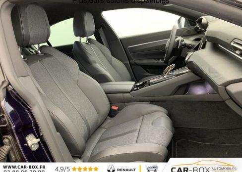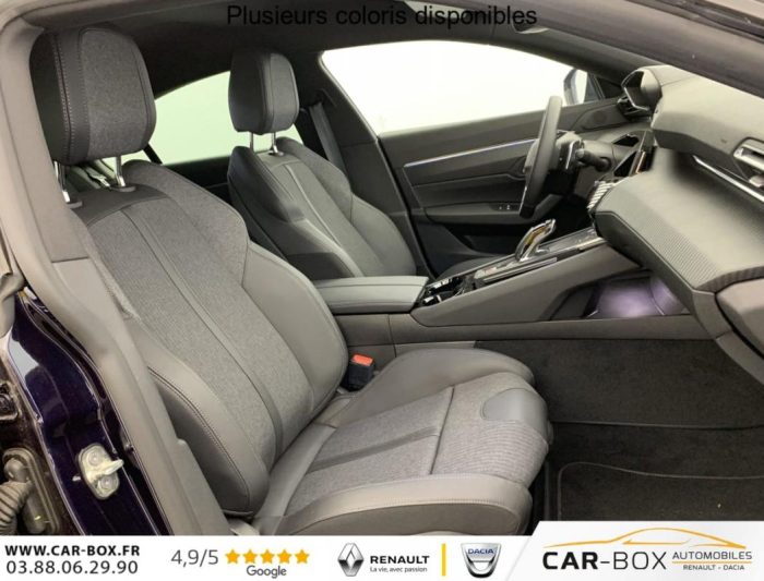 Véhicule livré sans kit de dépannage ni roue de secours, Accès et démarrage mains libres, Système Start & Stop, Aide graphique et sonore au stationnement AV et AR, Détection de sous-gonflage indirecte, Commande de verrouillage à distance, Vitres latérales AR et lunette AR surteintées, Alerte attention conducteur, Commutation automatique des feux de route, Régulateur de vitesse adaptatif avec fonction Stop&Go, Avertisseur de temps de conduite, VisioPark 1: Caméra de recul avec restitution sur l'écran tactile d'une vue AR et d'une vue de dessus de l'environnement AR du véhicule, Console centrale AV avec 2 porte-gobelets, Direction assistée électrique, colonne de direction réglable en hauteur et profondeur (mécanique), Air conditionné automatique bi-zone avec aérateurs aux places AR, Airbags frontaux conducteur et passager adaptatifs (passager neutralisable par clé), airbags latéraux conducteur et passager AV, airbags rideaux de tête aux places AV et AR, Verrouillage automatique de tous les ouvrants en roulant, Sièges AV chauffants : option incluse (valeur : 200 Eur TTC), Rétroviseurs extérieurs électriques, dégivrants et rabattables électriquement avec éclairage d'accueil à LED, Module 2 prises USB de charge pour les passagers AR, Jantes alliage 17" , Sièges AV mécaniques à réglage manuel en hauteur, Sièges AV mécaniques à réglage lombaire électrique, Feux antibrouillard AR intégrés à lampe, Accoudoir central AV à ouverture papillon, avec compartiment de rangement éclairé, Crochets pour cintres aux places AR, Frein de stationnement électrique avec aide au démarrage en pente et serrage automatique, Alerte active de franchissement involontaire de ligne et bas côté, Volant Cuir fleur, Banquette AR rabattable 1/3 - 2/3 avec accoudoir, Programme de Stabilité Electronique (ESC) avec ASR, ABS, REF, AFU, CDS et TSM, Aide au stationnement latérale, Aide au maintien de la position dans la voie (conduite semi-autonome), Fonction DAB (Radio Numérique Terrestre), Eclairage intérieur à LED étendu Eclairage intérieur LED + zone coffre (x2), pare-soleil, accoudoir central, porte-gobelets, caves à pieds, PEUGEOT Connect SOS, Garnissage TEP Mistral & Tissu "Imila", Appuis-tête réglables en hauteur sur les sieges conducteur et passager AV et sur les places AR, Fixations pour 2 sièges enfants ISOFIX, aux places AR, inclus Top Tether, Navigation 3D connectée avec reconnaissance vocale - Cartographie Europe Services de Navigation connectée TomTom, Système de surveillance d'angle mort, Teinte métallisée Bleu Encre : option incluse (valeur : 0 Eur TTC), Fonctions Mirror Screen (Apple Carplay/Android Auto), Sélecteur mode de conduite Eco/Normal/sport, Projecteurs Full LED avec correction automatique de site, clignotants AV à LED et éclairage en virage statique, Essuie-vitre AV avec système de lavage "Magic Wash" (gicleurs intégrés aux balais), Freinage d'urgence automatique (vidéo et radar) avec alerte sur risque de collision, Reconnaissance des panneaux de signalisation et préconisation de limitation de vitesse, Pack Visibilité : Eclairage d'accompagnement automatique Allumage automatique des feux de croisement Rétroviseur intérieur photosensible Essuie-vitre AV à déclenchement automatique, Prédisposition pour roue de secours galette : option incluse (valeur : 20 Eur TTC), 2 prises USB en façade de console AR, Ecran tactile capacitif 10" HD, 2 prises USB sur console AV, 1 prise jack, Peugeot i-Cockpit avec dalle numérique tête haute 12,3'', Lève-vitres AV et AR électriques séquentiels avec antipincement, Feux AR à LED