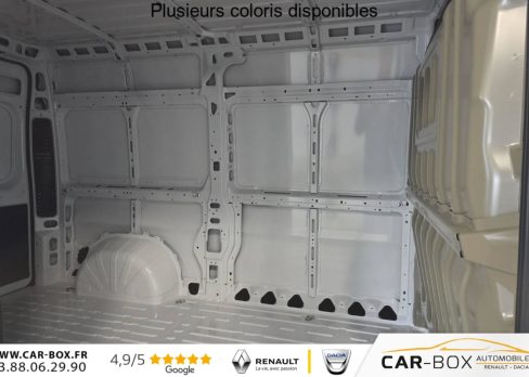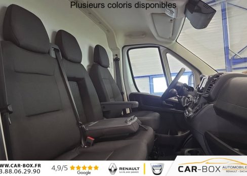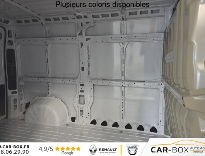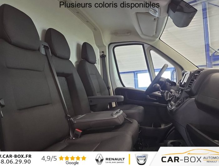 Régulateur limiteur de vitesse, Airbag conducteur, Banquette passagers 2 places, Rétroviseurs extérieurs électriques dégivrants, Airbag passager, Siège conducteur avec accoudoir, réglable en hauteur et réglage lombaire, Climatisation manuelle, Avertisseur sonore de marche AR, Porte latérale coulissante droite tôlée, Cloison tôlée, Portes AR à 2 battantes tôlés, Sellerie en tissu crêpe noir avec appuie-tête plein, Aide au stationnement AR avec avertisseur sonore pour piétons, Pack Roue de secours - Roue de secours - Support roue de secours : Roue de secours Support roue de secours : option incluse (valeur : 240 Eur TTC), ABS, AFU, ASR et ESP (ESC amélioré avec assistance en cas de vent latéral, contrôle de stabilité de la remorque, et freinage après collision), Alternateur standard (180 A), Antenne radio numérique, Batterie standard (95 Ah), Capteur de pression des pneumatiques (TPMS indirect), Condamnation centralisée avec plip, Crochets d'arrimage latéraux dans l'espace de chargement, Kit de réduction de CO2 - Spoiler central (DAM) - Guide d'air - Grille avec volets pilotés (AGS), Pare-choc AV grainé, Porte-gobelets au milieu du tableau de bord, Projecteurs halogène avec feux de circulation diurne, Rappel de bouclage des ceintures de sécurité, Teinte pastel : option incluse (valeur : 0 Eur TTC), Boitier télématique autonome (BTA), Pack Sécurité ADAS - Freinage d'urgence autonome avec détection piéton / cycliste - Aide au maintien dans la voie - Reconnaissance des panneaux de signalisation - Détecteur de fatigue ou d'inattention (attention assist) - Adaptation intelligente de la vitesse : Reconnaissance des panneaux de signalisation Freinage d'urgence autonome avec détection piéton / cycliste Aide au maintien dans la voie Détecteur de fatigue ou d'inattention (attention assist) Adaptation intelligente de la vitesse, Roues en acier 15", Système audio 5'' avec radio numérique DAB + Bluetooth + 1 port USB, Réservoir d'ADBlue 19 litres, Boîte de vitesse manuelle 6 rapports, Lève vitres AV électriques (séquentiel côté conducteur à la descente et à la montée avec fonction anti-pincement, séquentiel à la descente côté passager), Volant réglable en hauteur, Direction assistée électrique, Réservoir à carburant de 90 litres, Aide au démarrage en pente
