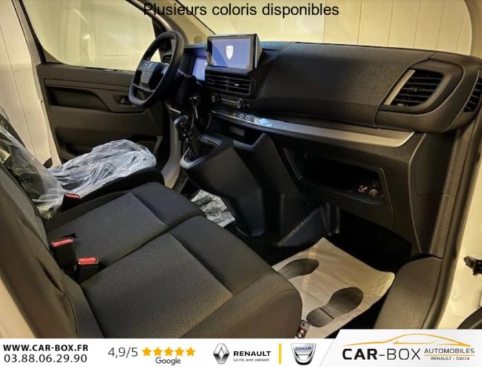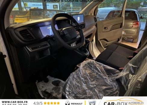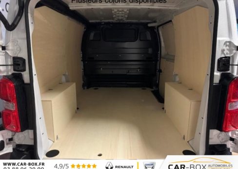 Interrieur complet en bois, Modulbox, Rétroviseurs extérieurs électriques et chauffants, Détection de sous-gonflage indirecte, Régulateur limiteur de vitesse, Aide au stationnement AR, Airbags frontaux conducteur et passager, Banquette passager 2 places avec appuis-têtes réglables en hauteur avec rangement sous assise, Cloison pleine tôlée, Lève vitres AV électriques impulsionnels, Allumage automatique feux de croisement et des essuie-vitres AV, Climatisation manuelle régulée en température, Teinte opaque, Siège conducteur avec appui-tête réglable en hauteur et avec accoudoir Réglage : longueur, inclinaison, réhausse et lombaire, Roue de secours homogène (jante tôle noire) : option incluse (valeur : 216 Eur TTC), ABS, AFU, ASR, ESP avec aide au démarrage en pente, 6 anneaux d'arrimage répartis uniformément sur la zone de chargement, Combiné numérique LCD noir et blanc, Jeu de clefs : 2 plips HF 3 boutons avec fonction sélectivité, Revêtement de sol TPO dans l'habitacle, Prise 12 V (120 W max) dans la boîte à gants, Pack Moduwork : Appuis-tête AV réglables en hauteur Banquette passagers 2 places avec siège latéral droit relevable Rangement sous assise central Tablette écritoire Trappe de charge longue : option incluse (valeur : 480 Eur TTC), Garnissage Tissu bi-ton noir-gris, Jantes tôle 16'' grises avec cabochon noir, Pare-brise feuilleté acoustique, Portes AR battantes tôlées 50/50 à ouverture à 180°, Projecteurs halogènes (H15) avec feux diurne intégré, Poignées de portes extérieures teintés masse, Enjoliveur de rail de porte latérale coulissante teintés masse, Baguettes latérales teintés masse, Coques de rétroviseurs extérieurs teintées masse, Radio DAB Bluetooth avec écran tactile 5'' monochrome + 4 HP (2 tweeters + 2 woofers) + 1 prise USB-A, Pack Sécurité : Assistance au maintien dans la voie Commutation automatique des feux de route Détection inattention conducteur Freinage automatique d'urgence avec alerte risque de collision Reconnaissance des panneaux de vitesse et recommandation , Commandes au volant du système audio et du régulateur-limiteur de vitesse, Panneaux latéraux intérieurs rangs 2 et 3 de type Isorel, Boitier télématique (appel d'urgence et d'assistance localisées + offres de service connectés)), Service connecté ''Pack Connect One'' (inclus pendant 10 ans), Kit de dépannage provisoire de pneumatiques (Compresseur 12 V + Cartouche de produit de colmatage), Service connecté ''Pack Connect Plus'' (inclus pendant 6 mois), Service connecté ''Preventive Maintenance'' (inclus pendant 4 ans), Pack 3 Caméras + Rétroviseur numérique : Aide au stationnement AV, AR et latéral + Système de surveillance d'angle mort Apple CarPlay et Android Auto sans fil Caméra de recul 180° avec affichage sur écran tactile 10" HD couleur Combiné Numérique 10'' HD couleur Prise 12 V espace de chargement Projecteurs antibrouillard Rétroviseurs extérieurs rabattables électriquement Système de rétrovision AR et latérale droite par 2 caméras avec affichage sur rétroviseur intérieur numérique : option incluse (valeur : 1 440 Eur TTC), Volant réglable en hauteur et en profondeur, Boucliers AV et AR teintés masse, Porte latérale coulissante droite