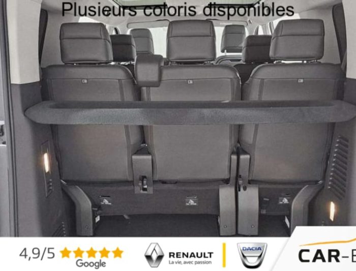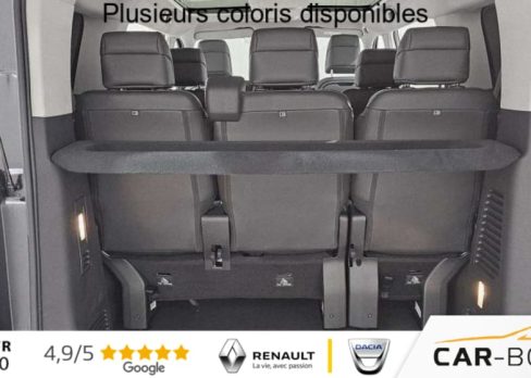 Aide au démarrage en pente, Frein de stationnement électrique, Détection de sous gonflage, Jantes alliage 17" diamantée, Coques de rétroviseurs extérieurs Noir Perla Nera, Régulateur / Limiteur de vitesse, Direction assistée, Teintes métallisées : option incluse (valeur : 650 Eur TTC), Surtapis rang 1, 2 et 3, Garnissage cuir Claudia noir, Airbags frontaux, latéraux AV tête/thorax et rideaux en rangs 2 et 3, ABS, ESP, ASR, AFU, Jeu de clefs : 2 plips HF 3 boutons avec fonction sélectivité, Tablette rigide AR (cache bagage), Tablettes aviation au dos des sièges AV, Allumage automatique des feux de croisement et des essuie-vitres, Combiné numérique 10" HD couleur, Pack Sécurité : Alerte Risque Collision (ARC) Assistance au maintien dans la voie Commutation automatique des feux de route Détection inattention conducteur Freinage automatique d'urgence Reconnaissance des panneaux de vitesse et recommandation , Projecteurs full LED avec feux diurnes à LED, Rétroviseurs extérieurs électriques et chauffants, Pack Visibilité : Prise 12V en rang 3 Projecteurs antibrouillards Rétroviseurs extérieurs rabattables électriquement , Pack Climatisation : Climatisation additionnelle AR avec pavillon confort Climatisation automatique bi-zone Pare-brise feuilleté acoustique et athermique , Pack Easy Access : 2 portes latérales coulissantes mains libres Accès et démarrage mains libres , Sièges conducteur et passager avec accoudoirs à réglages électriques (longueur, hauteur, lombaire) et massants, Enjoliveurs de rail de porte latérale coulissante couleur caisse, Commandes au volant du système audio, Boitier télématique (appel d'urgence et d'assistance géolocalisés + offres de services connectés), Pack Connectivité : Aide au stationnement AR, AV et latérale Caméra de recul 180° avec affichage sur écran tactile 10'' HD couleur Navigation 3D connectée avec reconnaissance vocale, Apple CarPlay et Android auto sans fil Système de surveillance d'angle mort , Hayon AR vitré avec lunette ouvrante chauffante et essuie-vitre, Vitres latérales fixes extra-teintées en rangs 2 et 3, Pack Hiver : Siège passager individuel rabattable Volant Cuir chauffant , Prise 12V dans la boîte à gants, Prise 230 V (150W max), Lunette AR extra teintée, Bouclier AV/AR couleur caisse, Baguettes latérales Noir Perla Nera, Banquette 3 places en rang 2 fractionnable 2/3-1/3 montée sur rail déposable avec mise en tablette et portefeuille en rang 2 avec fixations ISOFIX, Banquette 3 places en rang 3 fractionnable 2/3-1/3 montée sur rail déposable avec mise en tablette et portefeuille en rang 3 avec fixations ISOFIX, Kit de dépannage provisoire des pneumatiques : Compresseur 12 V avec cartouche de produit de colmatage , Boîte de vitesse automatique (8 rapports), Pack Confort : Accès et démarrage mains libres Contrôle de traction amélioré Grip Control + Système d'aide à la descente Recharge smartphone sans fil Rétroviseur intérieur électrochrome Volant Cuir chauffant , Décor Liquid Palladium sur planche de bord et panneaux intérieurs de portes AV latérales coulissantes, Contrôle de la pression des pneus, Verrouillage centralisé, Vitres AV électriques, Sécurité enfants électrique, Revêtement de sol en moquette, Poignées de portes extérieures couleur carrosserie, Lève-vitres AV électriques et séquentiels, Rideaux pare-soleil en rang 2