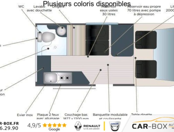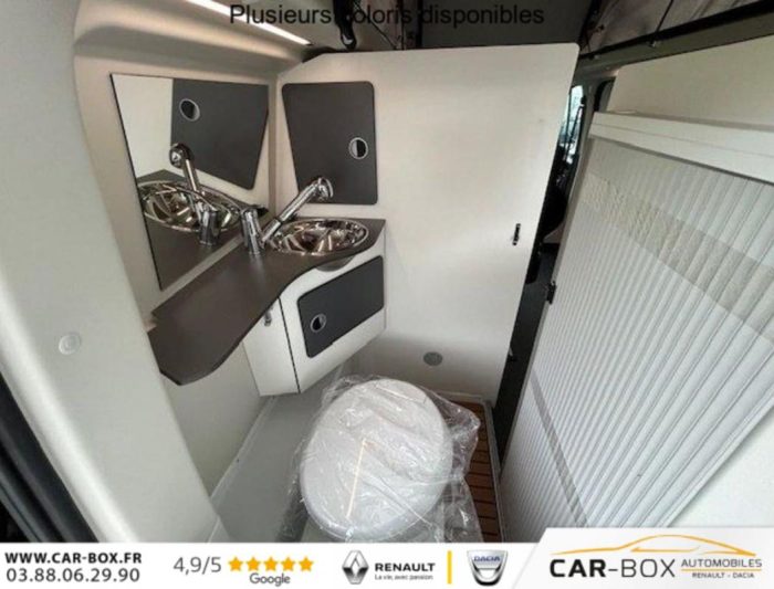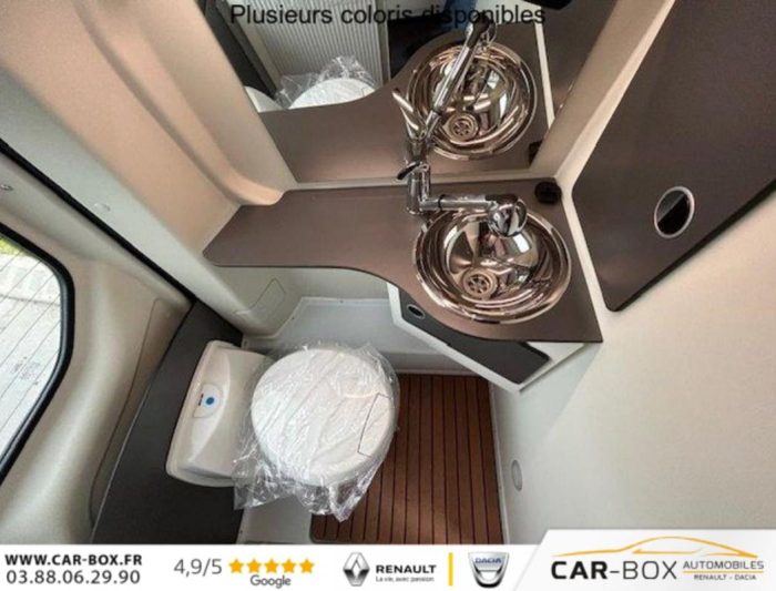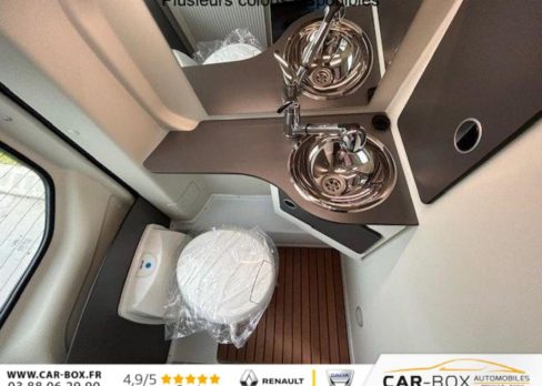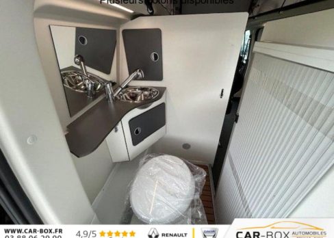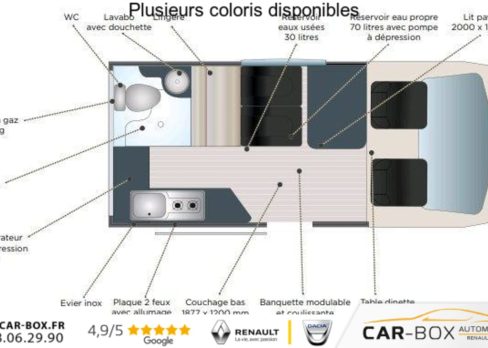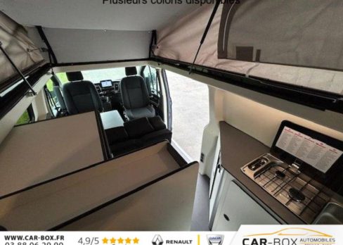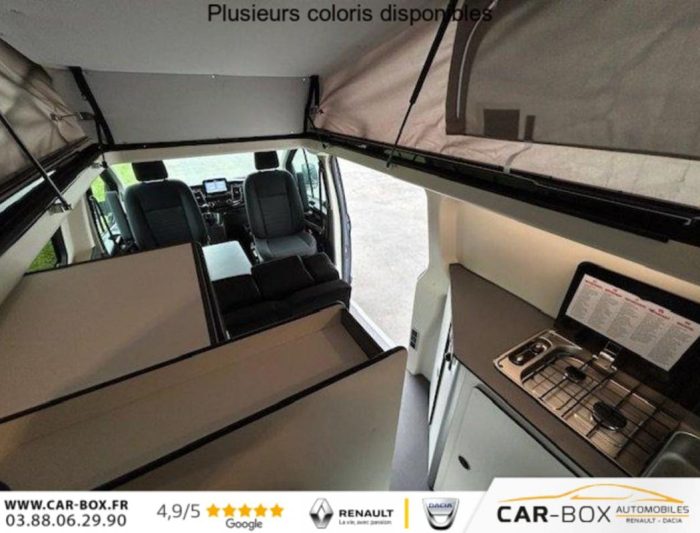 Bac à douche avec lavabo, Banquette arrière isofix modulable et coulissante type automobile, Caillebotis de douche, Couchage double sur sommier à plots dans toit, Table dinette, Tableau de contrôle + chargeur, Toit relevable manuel avec 3 fenêtres, WC cassette pivotant, Ambiance Mobilier : Blanc glacier, Ambiance Tissu : Moscou, Batterie cellule : 1 x 95 Ampère GEL, Capacité eaux propres : 70 L, Capacité eaux usées : 30 L , Capacité gaz : 1 X 2.7 kg , Capacité réfrigérateur : 41 L à compression, Chauffage : Combiné Truma D4 gasoil, Chauffe-eau : Combiné Truma D4 gasoil, Dimensions couchage bas : 1.87 X 0.90 m , Dimensions couchage haut : 2.00 x 1.16 m, Air bags conducteur et passager, Allumage automatique des feux, Autoradio, mp3, système bluetooth, Climatisation de cabine, Entourage de calandre chromé, ESP/ABS, Essuie-glaces avant automatiques avec détecteur de pluie, Jantes alliage 16“ 5x2 branches, Motorisation 170 CV Ford CUstom : option incluse (valeur : 2 920 Eur TTC), Pare-brise chauffant QuickLear, Peinture métallisée BLEU AZUR : option incluse (valeur : 1 815 Eur TTC), Pommeau de levier de vitesses gainé cuir, Protections latérales, pare-chocs avant/ arrière et poignées de portes couleur carrosserie, Régulateur / Limiteur de vitesse, Rétroviseurs extérieurs rabattables électriquement, Sièges avant chauffants, Système audio SYNC 3 avec écran couleur 4“, radio numérique DAB, Bluetooth®, prise USB, commandes au volant et 4 haut- parleurs, compatible Apple CarPlay, Android Auto et Waze, Verrouillage centralisé à distance, Vitres et rétroviseurs à commandes électriques