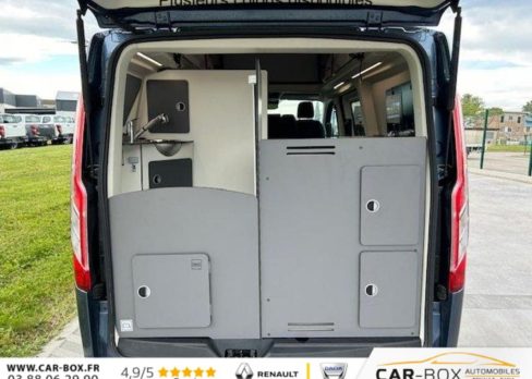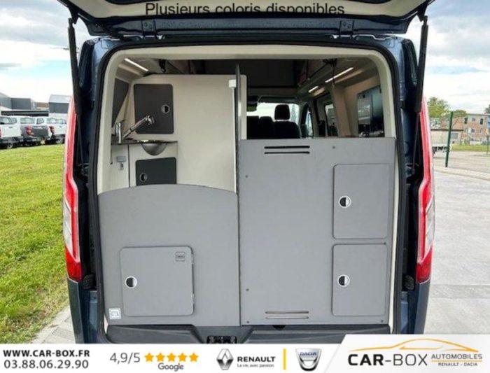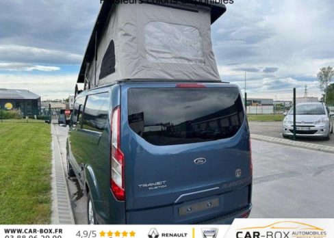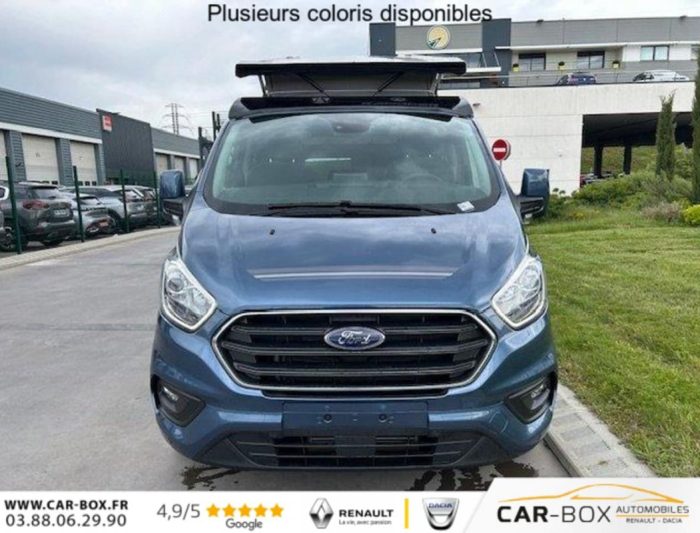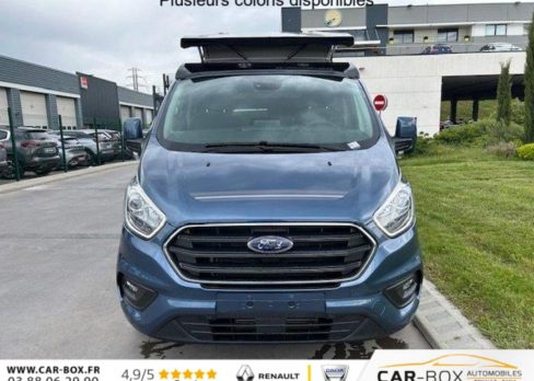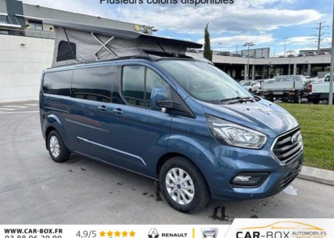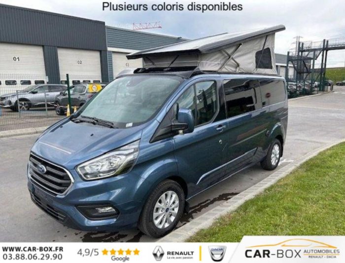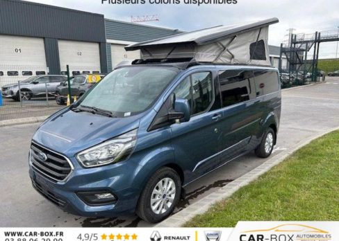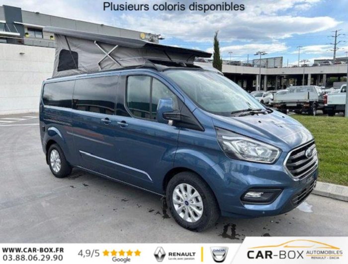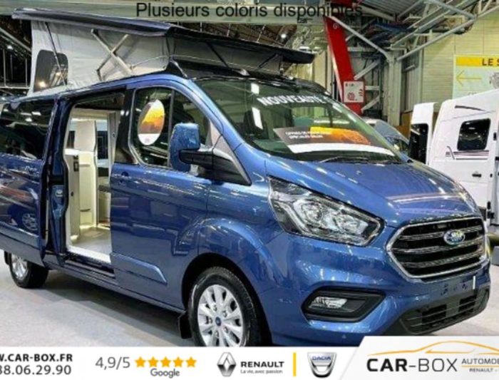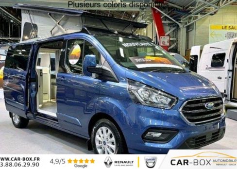FORD TRANSIT CUSTOM – LONG 2.0L 170 CH BVM6, diesel, bleu azur, Bac à douche avec lavabo, Banquette arrière isofix modulable et coulissante type automobile, Caillebotis de douche, Couchage double sur sommier à plots dans toit, Table dinette, Tableau de contrôle + chargeur, Toit relevable manuel avec 3 fenêtres, WC cassette pivotant, Ambiance Mobilier : Blanc glacier, Ambiance Tissu : Moscou, Batterie cellule : 1 x 95 Ampère GEL, Capacité eaux propres : 70 L, Capacité eaux usées : 30 L, Capacité gaz : 1 X 2.7 kg, Capacité réfrigérateur : 41 L à compression, Chauffage : Combiné Truma D4 gasoil, Chauffe-eau : Combiné Truma D4 gasoil, Dimensions couchage bas : 1.87 X 0.90 m, Dimensions couchage haut : 2.00 x 1.16 m, Air bags conducteur et passager, Allumage automatique des feux, Autoradio, mp3, système bluetooth, Climatisation de cabine, Entourage de calandre chromé, ESP/ABS, Essuie-glaces avant automatiques avec détecteur de pluie, Jantes alliage 16“ 5×2 branches, Motorisation 170 CV Ford CUstom : option incluse (valeur : 2 920 Eur TTC), Pare-brise chauffant QuickLear, Peinture métallisée BLEU AZUR : option incluse (valeur : 1 815 Eur TTC), Pommeau de levier de vitesses gainé cuir, Protections latérales, pare-chocs avant/ arrière et poignées de portes couleur carrosserie, Régulateur / Limiteur de vitesse, Rétroviseurs extérieurs rabattables électriquement, Sièges avant chauffants, Système audio SYNC 3 avec écran couleur 4“, radio numérique DAB, Bluetooth®, prise USB, commandes au volant et 4 haut- parleurs, compatible Apple CarPlay, Android Auto et Waze, Verrouillage centralisé à distance, Vitres et rétroviseurs à commandes électriques