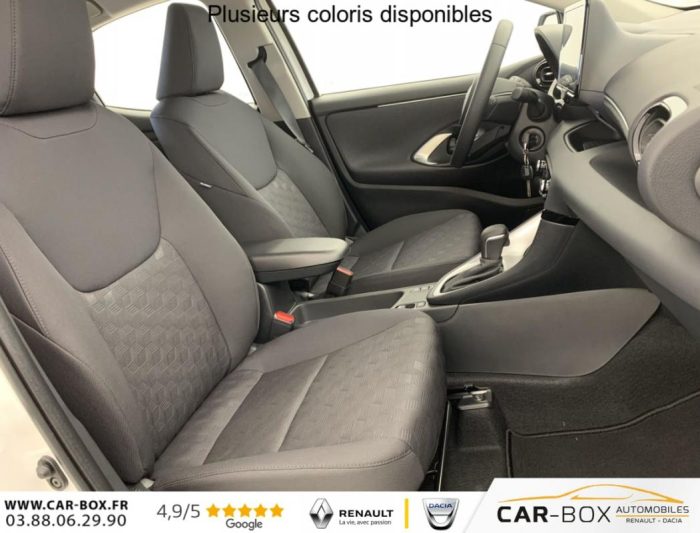 Système de fixation ISOFIX aux places AR, Caméra de recul, Tableau de bord moussé, Double plancher du coffre, Feux de jour à LED, Frein de parking électrique, ABS, Allumage automatique des feux, Airbag conducteur et passager, Airbags latéraux, Enjoliveurs 15", Rétroviseurs extérieurs électriques chauffants, Electrostabilisateur programmé (ESP), Climatisation automatique, Antenne de toit aileron de requin, Direction assistée, Système d'appel d'urgence automatique "E-Call", Ciel de toit gris clair, Accoudoir central, Airbags centraux, Feux de route halogènes, Peinture non métallisée, Sellerie tissu noir, Système de connectivité smartphone sans fil Apple CarPlay et Android Auto, Toyota T-MATE / Toyota Safety Sense Système de sécurité précollision avec détection des véhicules, piétons et cyclistes, actif également dans les intersections+Alerte de franchissement de ligne avec aide au maintien dans la file, assistant de trajectoire et détecteur de fatigue+Lecture des panneaux de signalisation avec limiteur de vitesse+Gestion automatique des feux de route+Régulateur de vitesse adaptatif intelligent+Système d'arrêt d'urgence autonome +Système d'assistance à la conduite proactive+Suppression de l'acceleration, Rétroviseurs extérieurs couleur carrosserie, Système multimédia Toyota Touch 3 écran tactile 9", radio digitale (DAB), Bluetooth, 2 ports USB-C et 6 hp, Boîte automatique à variation continue, Contrôle de la pression des pneus des roues, Contrôle de traction (TCS), Verrouillage centralisé, Volant en cuir, Banquette AR rabattable 60/40, Détecteur de pluie, Rétroviseur intérieur électrochromatique, Vitres AV/AR électriques