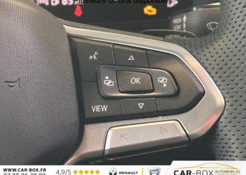 Rampes de pavillon anodisées, Fatigue Detection : système de détection de fatigue du conducteur qui analyse le comportement du conducteur et recommande un temps de repos par l'apparition d'un message visuel et sonore, Vitres AR et lunette AR surteintées à 65 %, 2 lampes de lecture à l'AV, Kit de dépannage : compresseur 12 V et produit d'étanchéité de pneu, Poignées de portes et rétroviseurs extérieurs dans la teinte de la carrosserie, Airbags latéraux AV, Direction progressive, Airbags rideaux AV/AR, Système Start/Stop avec récupération d'énergie au freinage, Oeillets d'arrimage ISOFIX (dispositif pour fixation de 2 sièges-enfants sur la banquette AR), Projecteurs antibrouillard AV avec éclairage statique d'intersection, Ciel de pavillon Noir, Sign Assist: Reconnaissance des panneaux de signalisation et affichage sur l'ordinateur de bord et l'écran du système de radionavigation, Sélection du profil de conduite, Châssis Sport: Direction progressive, Antidémarrage électronique, Catadioptres dans toutes les portières, Correcteur électronique de trajectoire ESP, système d'antiblocage de roues ABS, EDL, EDTC, antipatinage électronique ASR et stabilisation de la remorque, Pare chocs AV spécifique R-Line dans la couleur carrosserie, Pare chocs AR spécifiques R-Line dans la couleur carrosserie, Système d'infotainment avec écran d'accueil R-Line, Front Assist avec fonction de secours en ville et détecteur de piéton, Direction assistée, Réception de radio numérique DAB+, Logo R-Line sur la calandre et sur les ailes, Feux AR de brouillard des 2 côtés, feux de recul des 2 côtés, Frein de stationnement électromécanique avec fonction d'immobilisation en pente "Auto Hold" et assistant de démarrage en côte, Peinture unie Gris Ascot, Système de protection proactive des occupants avertisseur de non bouclage des ceintures de sécurité à l'AV et à l'AR, Appuis-tête AR (3) et ceintures de sécurité 3 points (3) sur la banquette AR, Caméra de recul "Rear View", Bas de caisse latéraux couleur carrosserie, Light Assist : Régulation automatique des feux de route, Lane Assist - Assistant au maintien dans la voie avec correction de trajectoire, Pédalier en acier inoxydable brossé, App-Connect sans fil - affichage et contrôle via l?écran tactile de la voiture, du contenu, des fonctions et des applications compatibles présents sur le Smartphone (compatibilité avec les systèmes Apple CarPlay, Apple CarPlay sans fil, Android Auto, Mirr, Aide au démarrage en côte "Hill-Hold", Tapis de sol AV/AR, Lampes de lecture AV/AR, Tableau de bord moussé, Travel Assist : Assistant de conduite semi-autonome, Système de détection de la signalisation routière, Climatisation automatique tactile Climatronic bi-zone avec filtre anti-allergène, réglable séparément pour le conducteur et le passager AV, Interface Bluetooth pour téléphone mains libres, Keyless Access: Système de verrouillage/dévérrouillage sans clé et démarrage avec bouton Start/Stop, Emergency Assist, Logo R-Line brodé sur les sièges AV, Palettes au volant, Digital Cockpit Pro : combiné d?instruments entièrement digital haute résolution couleur de 10,25", différents profils d?informations sélectionnables, 2 interfaces USB-C AV et 2 ports USB-C de recharge AR, ACC : Le Régulateur de vitesse adaptatif et prédictif avec limiteur de vitesse (ACC) adapte la vitesse en fonction des limitations de vitesse detectées et du parcours, Side Assist : assistance de changement de voie avec détecteurs d?angle mort, Vitres athermiques teintées vertes sur les côtés et à AR, Projecteurs à LED Plus : projecteurs LED haute performance avec feux de jour à LED feux de braquage et éclairage tous temps et réglage dynamique du site des projecteurs, Application décorative de tableau de bord "Piano Noir" brillante, Jantes en alliage léger 18" Nevada noires, Plancher de coffre à bagages réglable en hauteur et amovible, Volant sport multifonction à touches ?physiques? en cuir et logo R-Line et capacitif, Partie extérieure et appuie-tête bi-matière ArtVelours et surpiqués en Gris, Sellerie spécifique avec partie centrale en tissu "Karoso", intérieur des bourrelets latéraux en Art Velours, Accoudoirs de porte et accoudoir central en ArtVelours, Insert argent sur le haut des vitres, allant des portières AV jusqu'à l'AR du véhicule, Préparation pour "VW Connect" vous permet d?obtenir des informations sur votre véhicule directement sur votre smartphone. Application totalement gratuite et facile à utiliser. Produit 100% compatible avec votre Volkswagen et garantie constructeur préservé, Rétroviseurs extérieurs électriques avec fonction mémoire et rabattables électriquement, Park Assist - assistant aux manoeuvres de stationnement y compris système d?aide au stationnement avec signaux d?avertissement en cas d?obstacles à l?AV et à l?AR, Pack Visibilité : Allumage automatique des feux avec fonctions "Coming Home - Leaving Home" Capteur de pluie avec essuie-glace automatique Rétroviseur intérieur jour/nuit automatique , Chargeur de téléphone par induction compartiment de rangement spécifique au téléphone dans la console centrale, Essuie-glaces AV et AR avec commande d?intermittence, Contrôle de la traction (TCS), Boîte de vitesse automatique (DSG7), Sièges AV réglables en hauteur, Verrouillage central, Alerte de perte de pression des pneus, Airbags frontaux conducteur et passager AV, Contrôle de la pression des pneus, Siège passager AV rabattable, Diffuseur AR noir, Seuils de porte avec logo R-Line