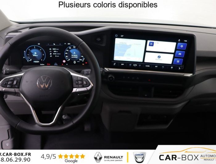 ABS, Accoudoir central, Aide au maintien en côte, Airbag conducteur, Alarme, Alarme antivol avec protection volumétrique - avertisseur sonore de recul et protection contre le remorquage, Appel d'urgence, Apple CarPlay / Android Auto, Assistance au freinage d'urgence, Assistance feux de route, Assistant de changement de voie (Side Assist) avec aide au maintien de la voie - freinage de manœuvre et système d'alerte de sortie de route, Assistant maintien de voie, Barrière de chargement, Bluetooth, Boîte de vitesse automatique, Caméra de recul, Capteur d'aide au stationnement arrière, Capteur d'aide au stationnement avant, Capteur de pluie, Climatisation automatique, Climatisation (1 zone - réglage automatique), Commande vocale, Contrôle de traction, Démarrage sans clé, Détecteur de fatigue, Écran tactile, Ensemble d'assistance à la conduite Premium, ESP, Frein de stationnement électronique, Groupe Connect, Groupe de contrôle des sièges, Groupe de reconnaissance des panneaux de signalisation et d'assistance frontale comprenant le régulateur de vitesse adaptatif (ACC), Immobilisateur, Informations trafic, Jauge de température extérieure, Limitateur de vitesse, Lumières automatiques, Moniteur d'angle mort, MTM = 3125 - 3300 kg, Ordinateur de bord, Pack Cabine (46 sièges individuels en "tissu rayé" avec double banquette passager et chauffage des sièges), Pack extérieur (plaque intermédiaire, calandre et pare-chocs couleur carrosserie), Pare-brise chauffant, Pare-brise en verre de sécurité feuilleté et isolant - chauffant, Peinture métallisée, Phares à LED avec feux de jour à LED, feux de croisement et éclairage toutes saisons, Phares LED, Plancher de chargement en plastique dans le compartiment à bagages avec parois latérales surélevées, Pneus Goodyear toutes saisons, Pneus toutes saisons, Porte coulissante à droite, Portes battantes (hauteur jusqu'au toit dans le cas d'un toit surélevé), Préparation de la barre d'attelage, Préparation pour VW Connect & VW Connect Plus, Programme électronique de stabilité (ESP) avec servofrein électrique, Puissance de direction, Radio, Radio DAB, Reconnaissance des panneaux, Régulateur de vitesse adaptatif, Régulateur de vitesse avec stop & go - limiteur de vitesse et assistant de vitesse intelligent, Réservoir de carburant d'une capacité de 70 litres, Rétroviseurs à réglage électrique, Rétroviseurs chauffants, Rétroviseurs extérieurs réglables, chauffants et rabattables électriquement, Roue de secours, Roue de secours 155/70 R17 et cric, Siège chauffant avant, Système de démarrage/arrêt, Système de navigation, Système de navigation avec écran tactile couleur (33 cm / 13 pouces) et App-Connect sans fil (Apple & Android), USB, Vérification de la pression des pneus, Verrouillage central avec démarrage sans clé et SAFELOCK, Verrouillage centralisé, Vitres électriques avant, Volant chauffant, Volant en cuir, Volant multifonction en cuir synthétique - chauffant, Volant multifonctionnel