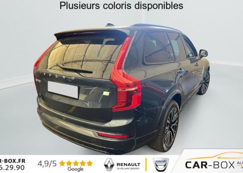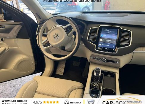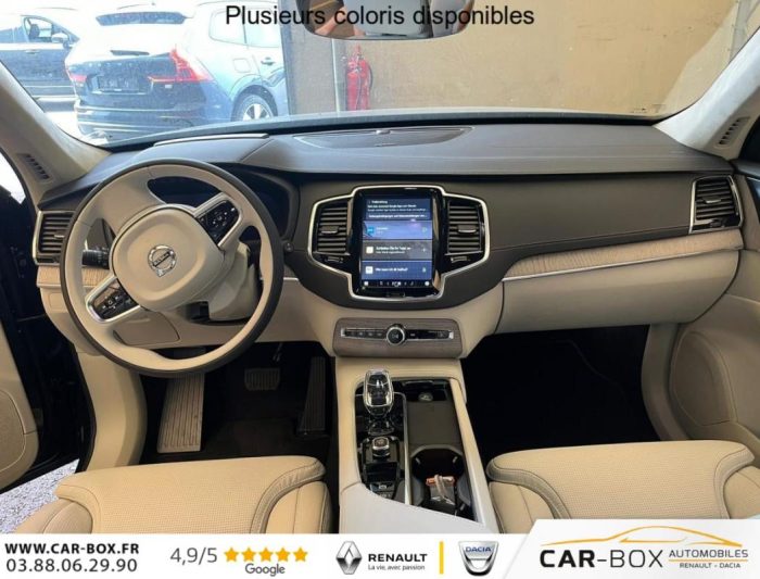 Accoudoir central arrière avec porte-gobelet (2e rangée de sièges), Affichage tête haute, Airbag côté passager (avant) désactivable, Airbag genoux du conducteur, Airbags latéraux pour le conducteur et le passager avant, Airbags tête/épaule pour tous les occupants, Alerte en cas de chaussée glissante, Apple CarPlay, Application Cars, Appuis-tête de la 2e rangée rabattables (électriques), Atténuation des chocs arrière, rétroviseurs extérieurs rabattables électriquement, Atténuation des voies en sens inverse (aide à la direction), Barres de toit en noir brillant (intégrées), Boutons multifonctions sur le volant, Câble de recharge Type 2/ Type 2 (Mode 3) Longueur 7 m, Caisson de basses Fresh Air? avec membrane en mica, Calandre sport avec barres horizontales et entourage de calandre en noir brillant, Caméra de stationnement avec vue panoramique à 360 : option incluse (valeur : 0 Eur TTC), Capteur de condensation pour l'activation automatique de la fonction dégivrage, Ceintures de sécurité actives avec rétracteurs de ceinture, Châssis actif avec suspensions pneumatiques : option incluse (valeur : 0 Eur TTC), Chauffage auxiliaire avec minuterie (à carburant), Chauffage du volant, Climatisation automatique avec contrôle de la température à 4 zones, Climatisation pour la troisième rangée de sièges, Coffre à bagages sous le plancher de l'espace de chargement, Commande à distance, Connexion 12 volts dans le compartiment à bagages, Coussins gonflables de sécurité pour le conducteur et le passager avant avec système de déploiement en deux étapes, Cuir nappa/ simili-cuir beige clair Design intérieur beige clair/anthracite (UC00) : option incluse (valeur : 0 Eur TTC), Détecteur de pluie avec fonction d'éclairage automatique, Direction assistée asservie à la vitesse, Éclairage d'ambiance - Éclairage intérieur amélioré, Écran graphique 12,3" pour le conducteur (31,2 cm de diagonale), Écran tactile 9" (22,9 cm en diagonale), Electronic Stability Controll (ESC) - Contrôle électronique de la stabilité, Éléments de design en noir brillant, Entourage des vitres latérales en noir brillant, Essuie-glaces, Feux antibrouillard arrière , Feux de freinage d'urgence, Filet de séparation du compartiment à bagages, Fonction de massage pour le siège du conducteur et du passager avant : option incluse (valeur : 0 Eur TTC), Fonction mémoire pour le siège passager, Garniture de toit et montants de porte en nubuck, Guide de l'utilisateur numérique, Hayon automatique (électrique), Hill Start Assist (HSA) - Aide au démarrage en côte, Incrustation en bois véritable Frêne gris, Information sur les panneaux de signalisation (RSI) - reconnaissance des panneaux de signalisation, Keyless Drive (système d'accès électronique), Kit mains-libres Bluetooth® incluant le streaming audio, Lane Keeping Aid (LKA) - Assistant actif de maintien de la trajectoire, Limite de vitesse (variable), Lumbar (4 directions) pour le siège du conducteur et du passager avant, Miroirs de courtoisie pour le conducteur et le passager avant (éclairés), Pédales et manettes en verre cristallin suédois Orrefors®., Phares à LED "marteau de Thor" avec feux de route actifs, Pilot Assist, Blind Spot Information System (BLIS®) et Cross Traffic Alert (CTA), Poignées de porte couleur carrosserie avec éclairage au sol, Porte-billets de stationnement, Pré-ventilation et post-chauffage de l'habitacle lorsque le moteur est éteint, via l'application Volvo Cars (en option) ou le menu, Produit d'étanchéité pour pneus avec compresseur 12 volts (vitesse maximale 80 km/h), Protection des seuils de chargement en aluminium dans le compartiment à bagages, Réception de la radio numérique (DAB+), Régulateur de vitesse adaptatif, Rétroviseurs extérieurs sport en noir brillant, Rétroviseurs intérieurs et extérieurs à gradation automatique, Sécurité enfants (électrique pour les portes arrière), Services numériques (Google Maps, Google Assistant, Google Play Store), système de recharge des smartphones par induction (QiStandard), Seuils de porte en aluminium avec inscription Recharge à l'avant (éclairée), Siège conducteur à réglage électrique (8 directions) avec fonction mémoire, Siège enfant intégré au siège arrière central (2ème rangée de sièges)., Siège passager à réglage électrique, Sièges arrière chauffants (sièges extérieurs de la 2e rangée), Sièges arrière (2ème rangée) dans le rapport 40/20/40 ou entièrement rabattables, soutiens latéraux avant réglables (électriquement), Sièges avant avec ventilation active, Sièges chauffants à l'avant, Sièges confort, Store de coffre (semi-automatique), Stores pare-soleil pour les vitres latérales arrière (intégrés), Supports ISOFIX pour les sièges arrière extérieurs (2ème rangée de sièges), Système audio Premium Sound de Harman Kardon, Système avancé de purification de l'air avec filtration des poussières fines conformément à la norme de qualité de l'air PM2.5, Système de contrôle de la pression des pneus (avec message de perte de pression spécifique au pneu), Système de fixation des fourre-tout dans le compartiment à bagages, Système de nettoyage des phares, Système de protection contre le coup du lapin WHIPS?, Système intelligent d'information du conducteur, Tableau de bord en cuir avec surpiqûres contrastées, Tapis de sol en textile à l'avant et à l'arrière, Tapis de sol en textile pour la 3e rangée de sièges, Technologie Start-stop, Toit ouvrant panoramique en verre avec fonction de levage, Transmission automatique, Hill Descent Control (HDC) - assistant de descente en côte, Triangle de signalisation, Trousse de premiers secours, Verrouillage automatique des portes pendant la conduite (désactivable), Verrouillage central avec deux télécommandes radio et clés de secours intégrées, Vitrage teinté, Vitres latérales et arrière assombries (à partir du monta